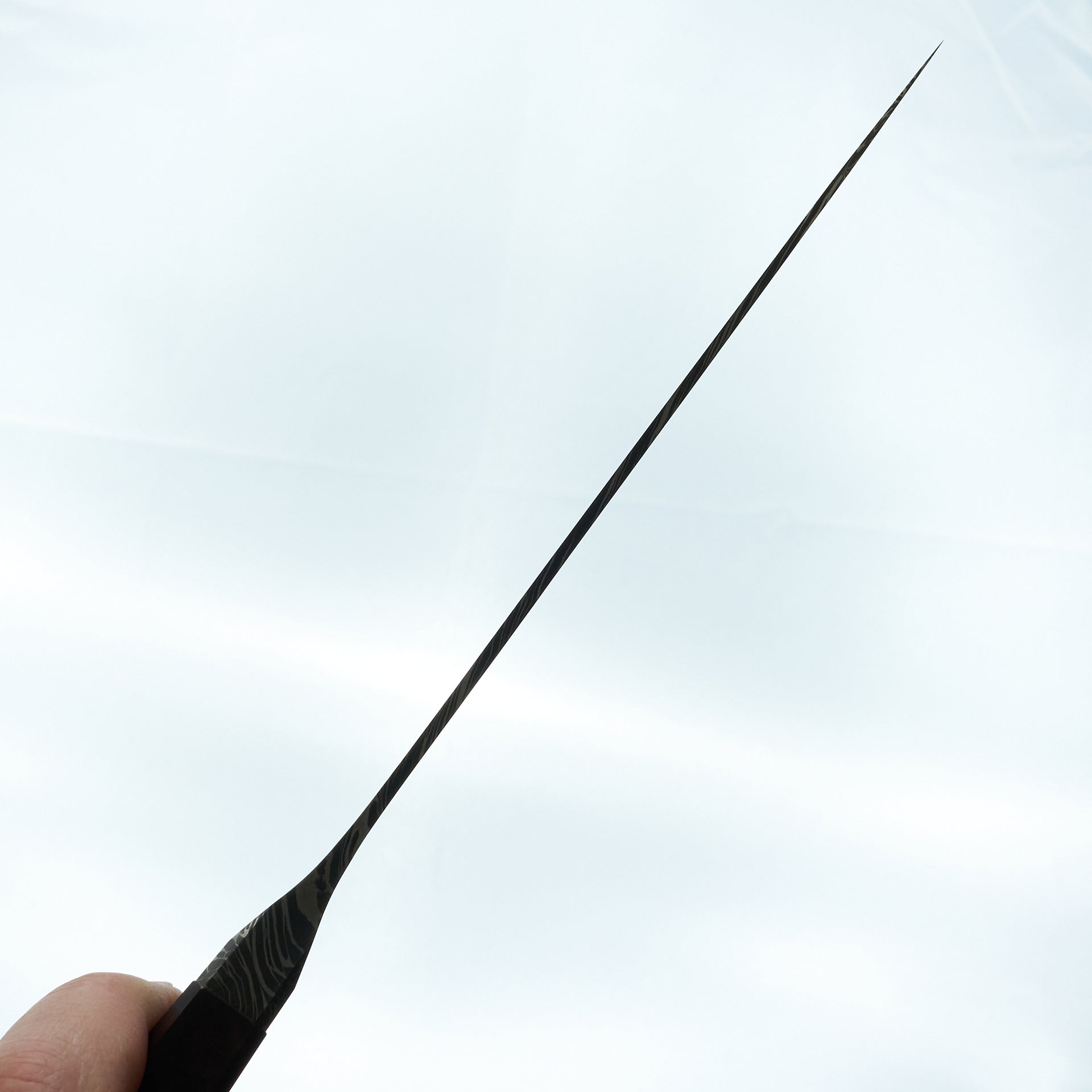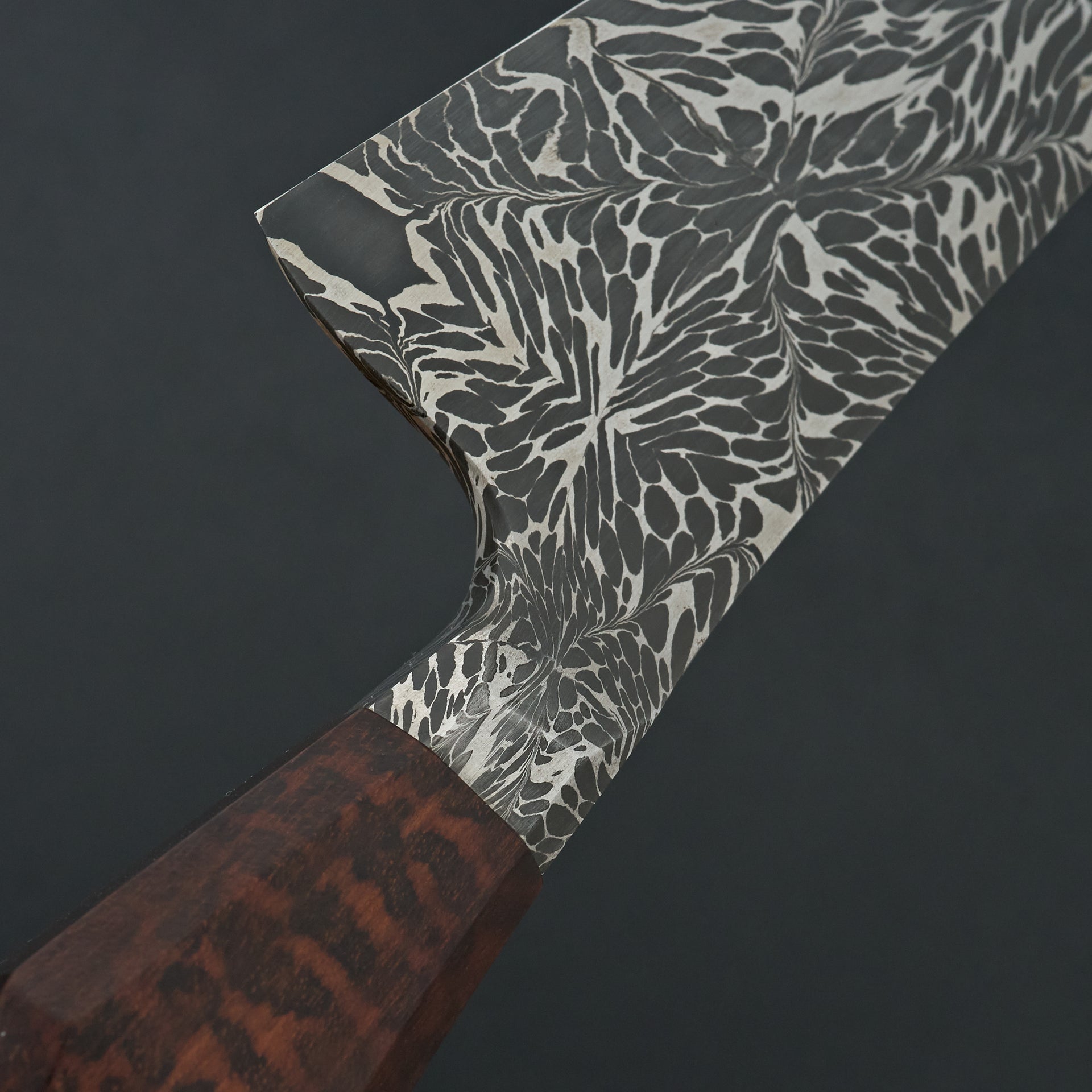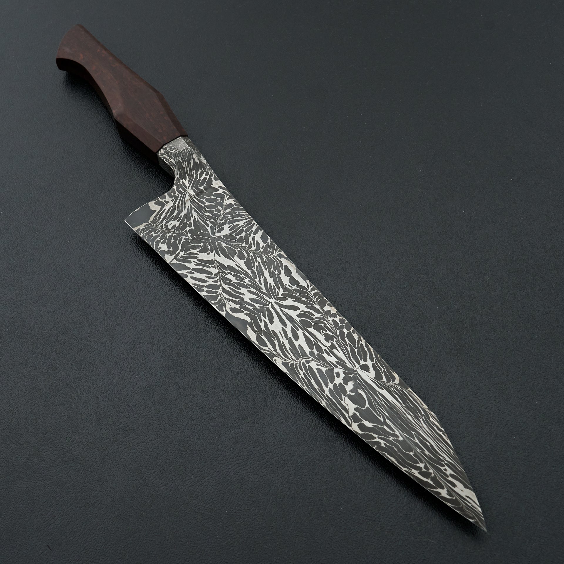 This blade is a hand forged integral mosaic damascus chefs knife made from 1084, 4800kc and 15n20 high carbon steel hardened to about 61hrc. The blade features a full integral bolster which displays the damascus pattern running throughout. The grind is thin with an s-grind on the right side of the blade. The hybrid western handle is made from snakewood sporting a heirloom fit. This knife is very nimble and performance focused.