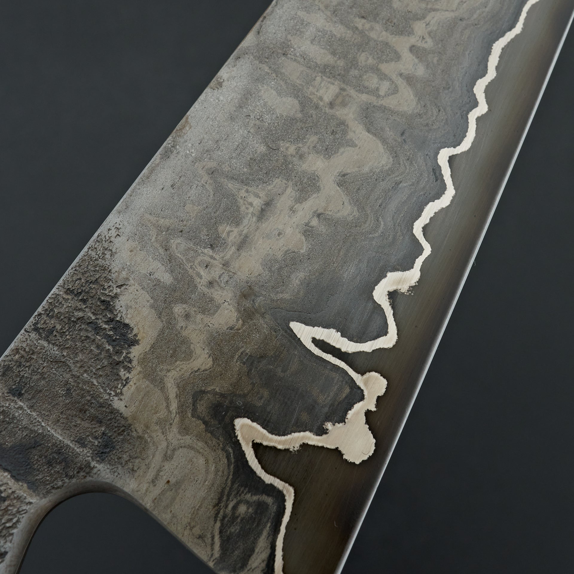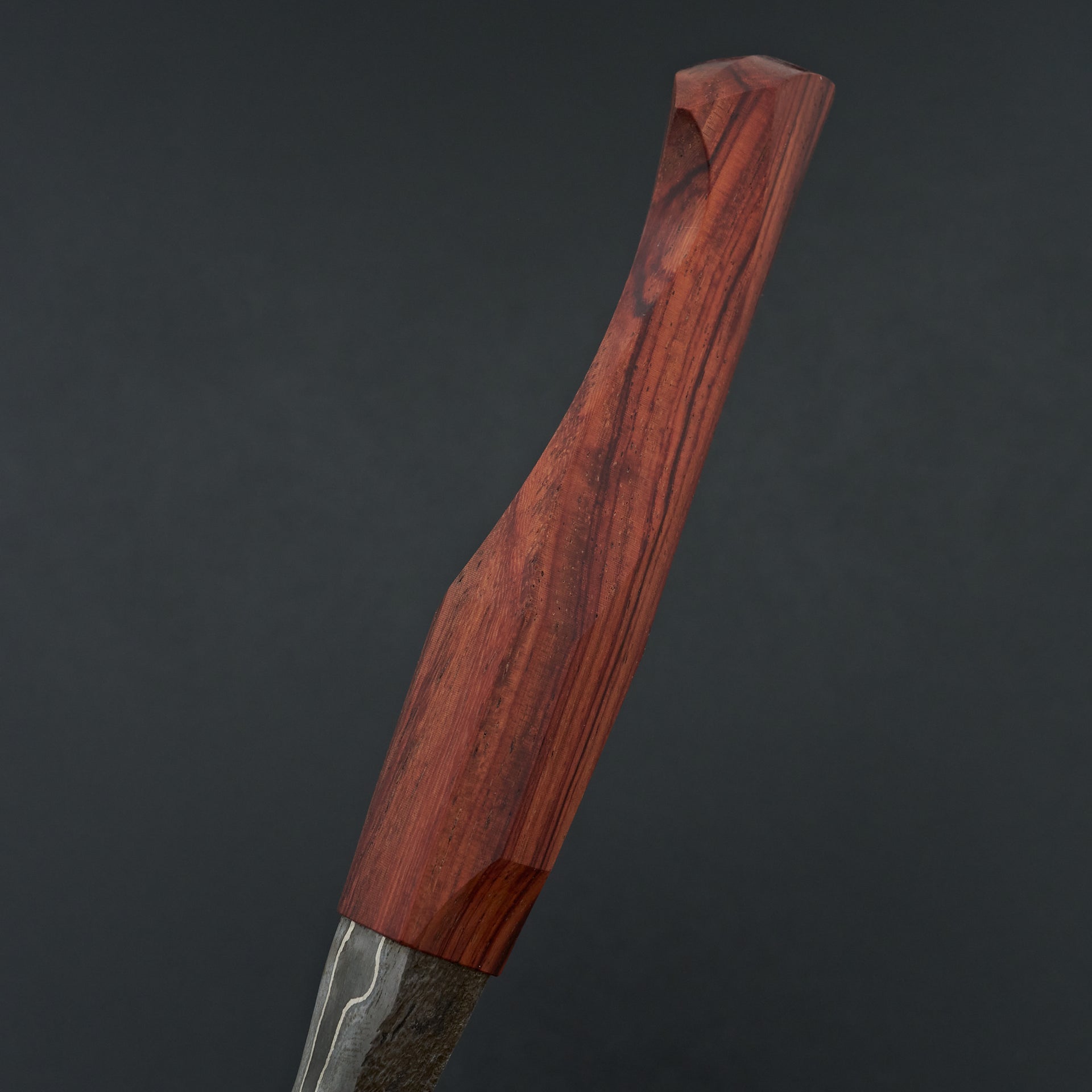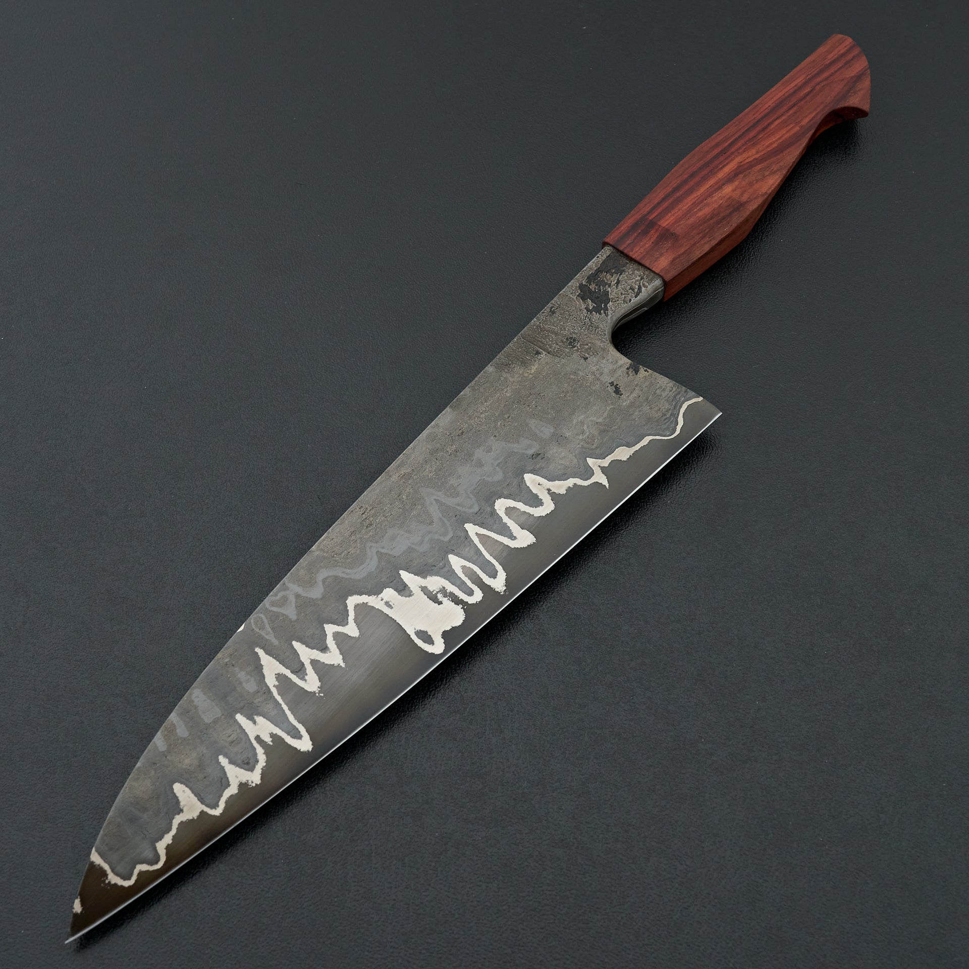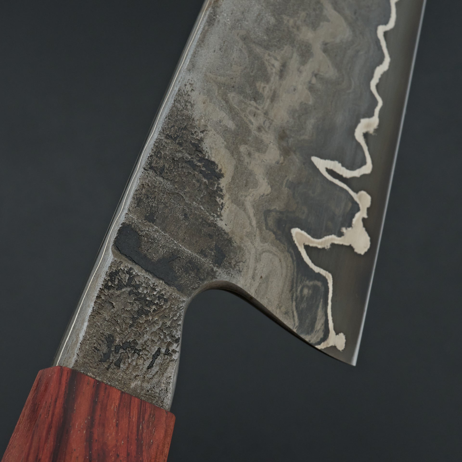 This blade is a hand forged and laminated chef knife made using a core of 80CrV2 with wrought iron cladding hardened to 61hrc. The blade had a dramatic distal taper and forged integral neck that is great for a pinch grip. The finish is etched and has tons of fine detail and character running throughout. The handle is a hybrid style made from Burmese rosewood