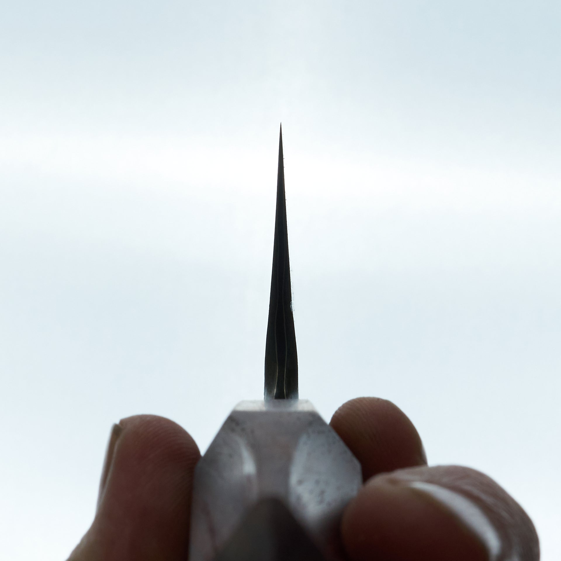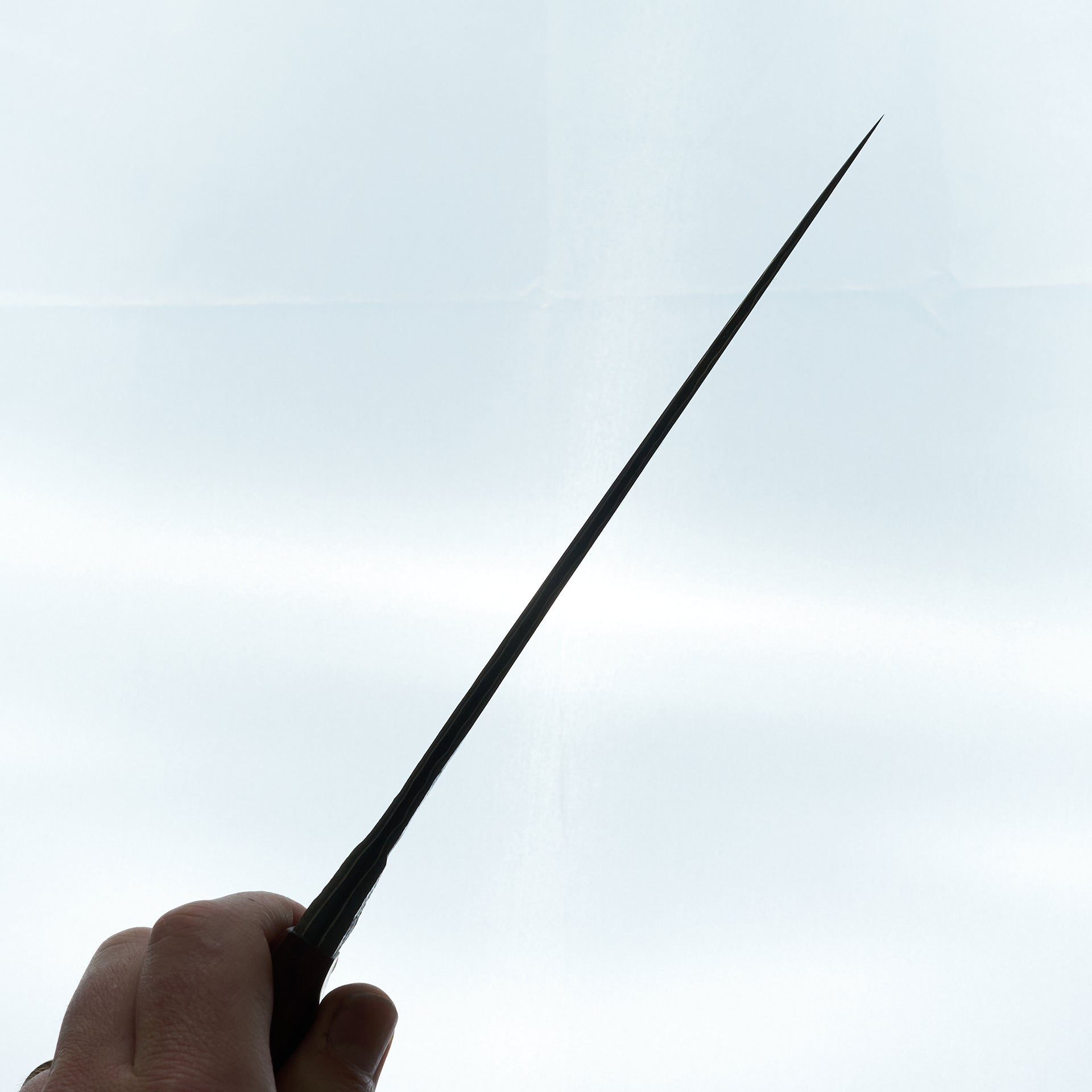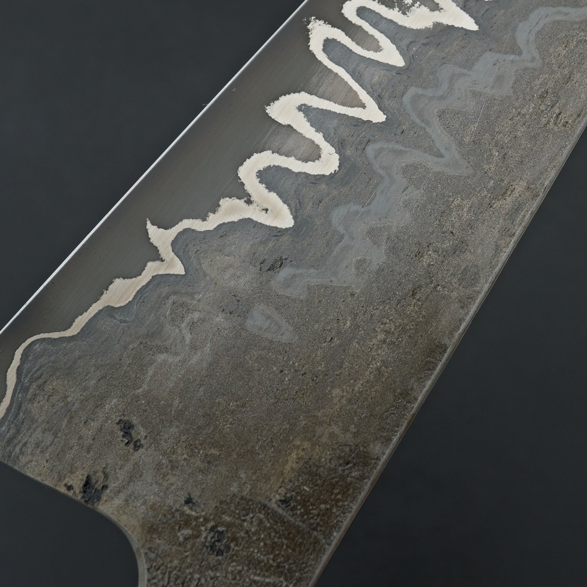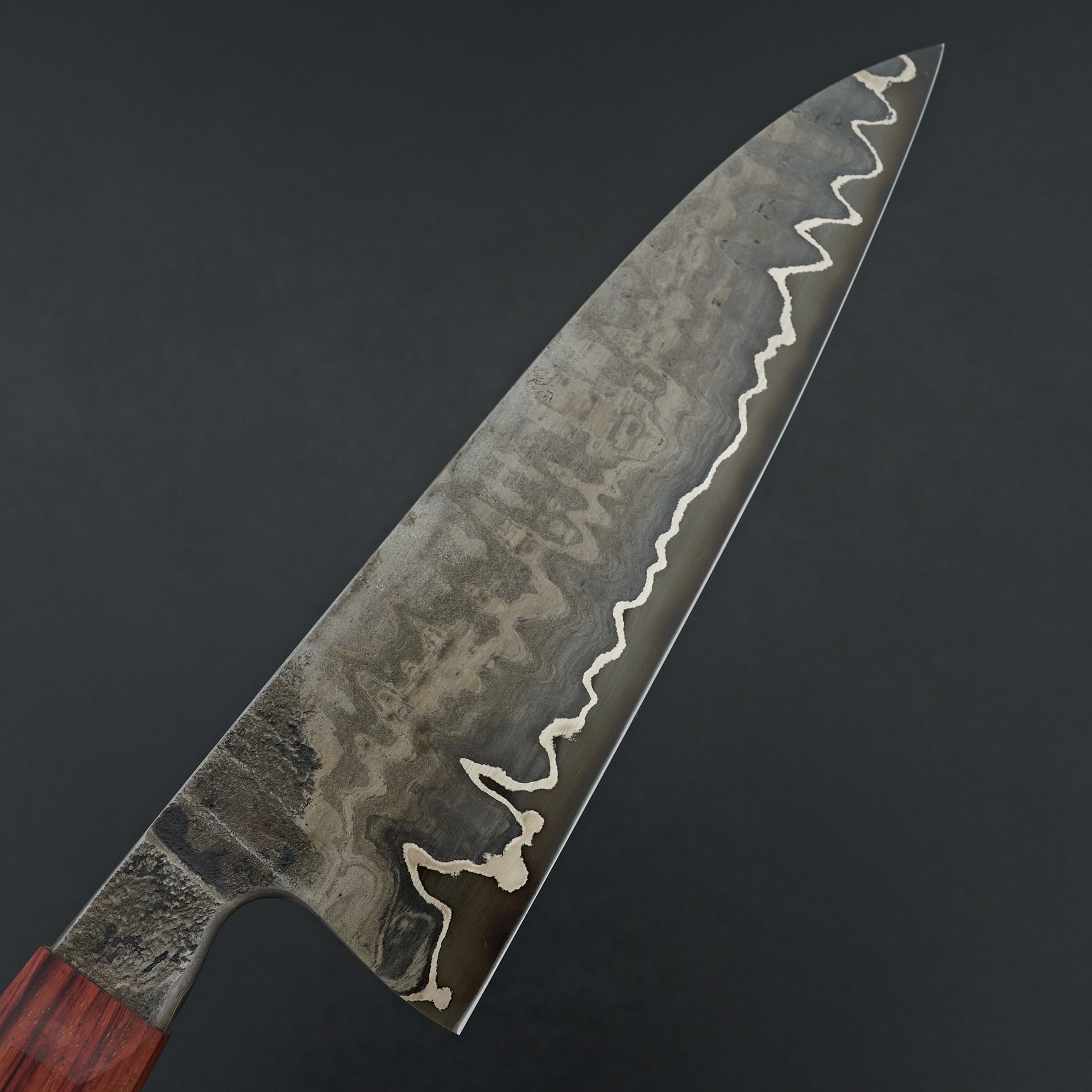 This blade is a hand forged and laminated chef knife made using a core of 80CrV2 with wrought iron cladding hardened to 61hrc. The blade had a dramatic distal taper and forged integral neck that is great for a pinch grip. The finish is etched and has tons of fine detail and character running throughout. The handle is a hybrid style made from Burmese rosewood