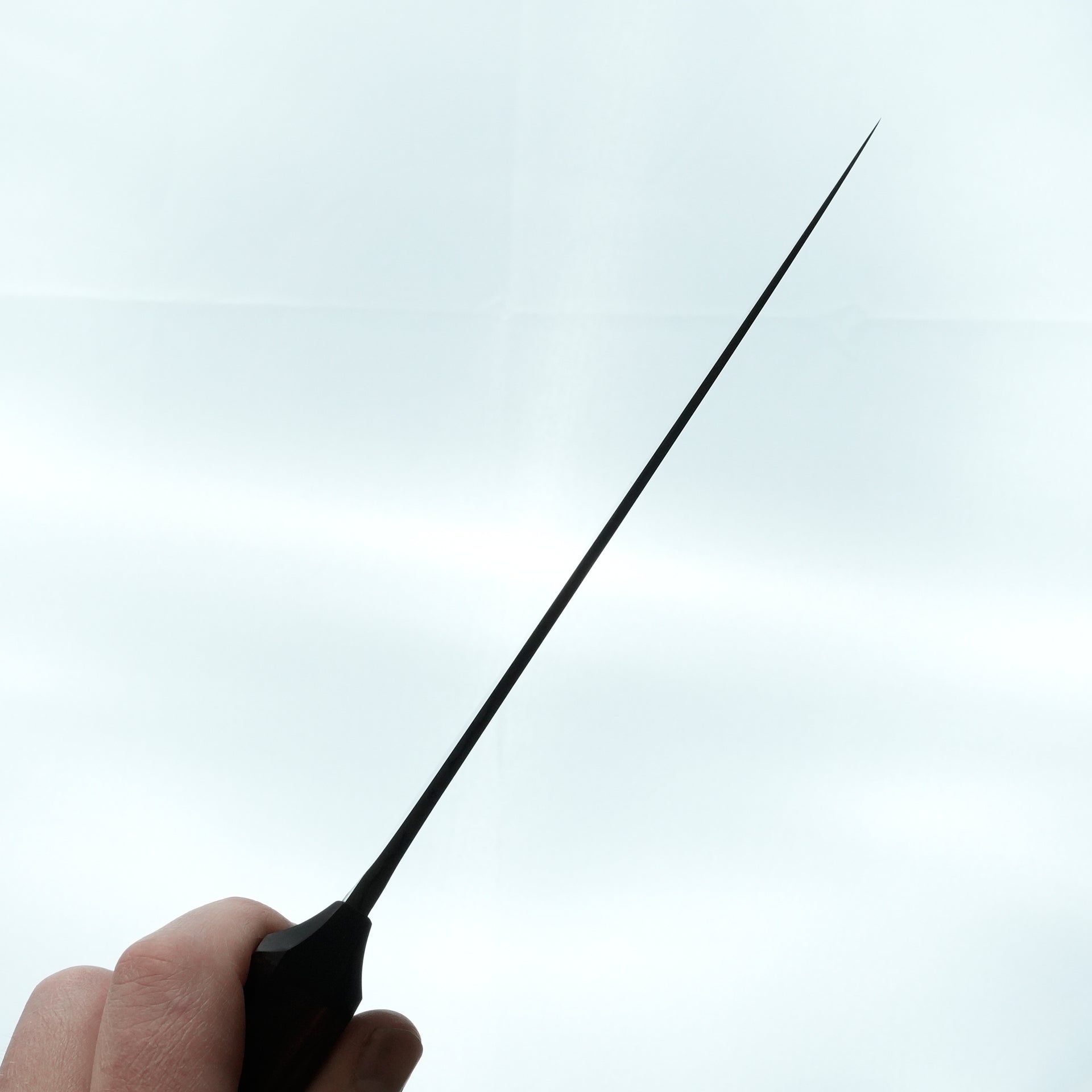 This blade is a hand forged integral mosaic damascus chefs knife made from two different steel combinations. The middle "river" portion uses 1084/15n20 high carbon steels and the "pebble" portion is canister damascus made from 52100 and 1090 high carbon steels. These steels were laminated together to give a river and pebble effect. The grind is thin a deeply etched finish. The hybrid western handle is made from cocobolo wood and buffalo horn ferrule. This knife is very nimble with a flatter edge profile.