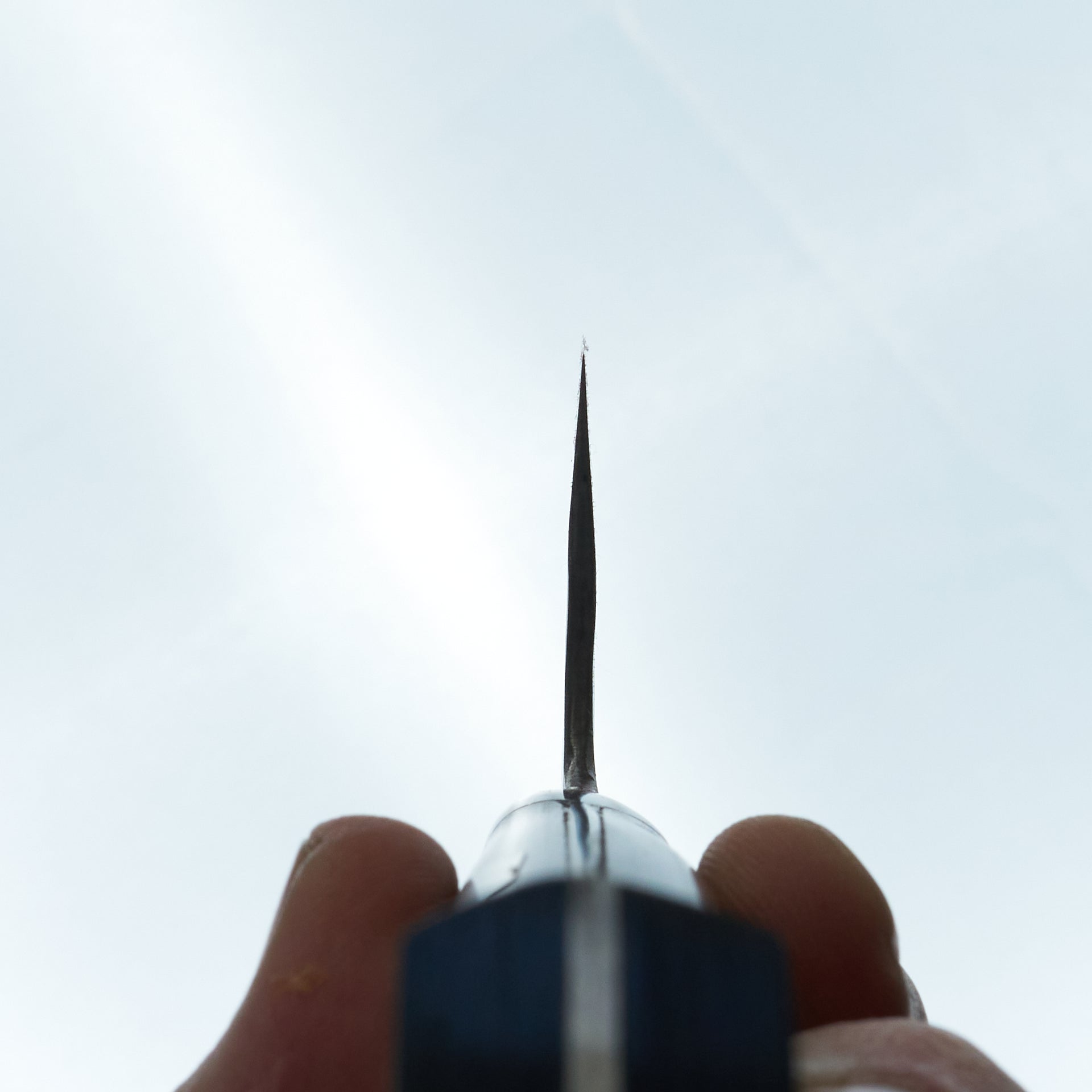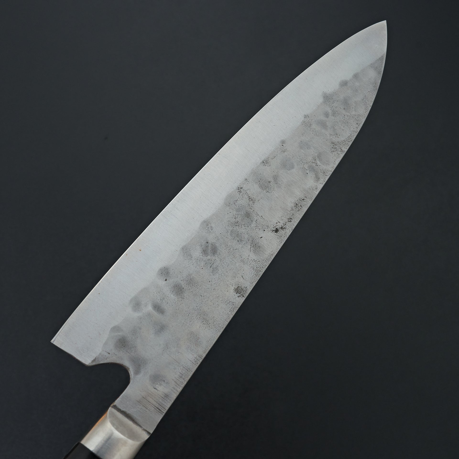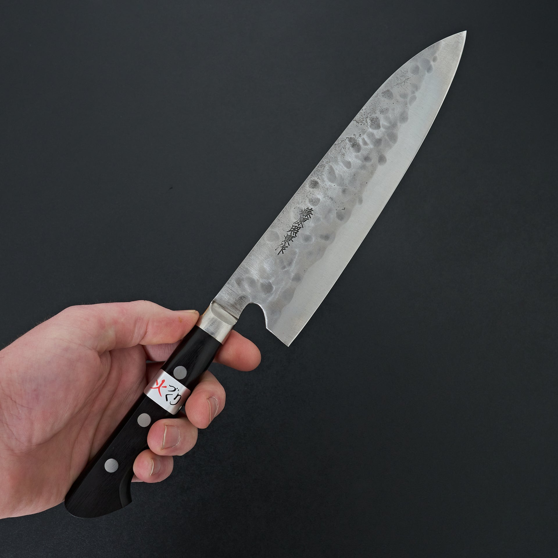 Teruyasu Fujiwara makes some of the highest regarded knives on the market for their ability to take an incredibly sharp edge. The Maboroshi line is forged from white #1 steel rated at 64-65 HRC. They are cladded with a stainless steel and hammered finish. Fitted with a western handle and his signature finger notch makes for a very comfortable cutting experience.