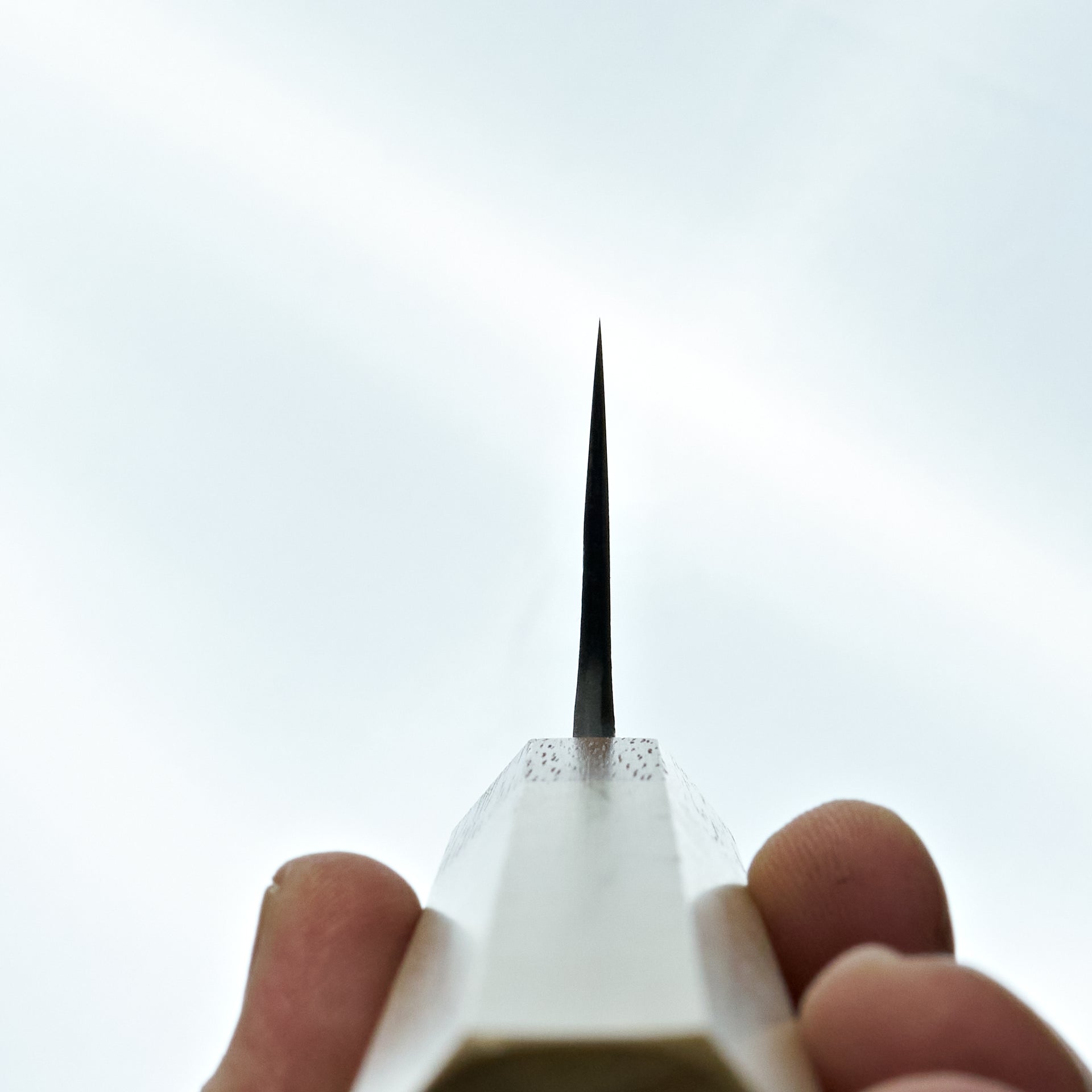 He focuses primarily on forging Shirogami (White) #2 carbon steel cladded in iron. The nashiji kurouchi displays all of the character and detail that happens during the forging process. The bevels are finished by hand on Japanese whetstones to ensure an even grind and geometry. The forged distal taper is quite impressive and has a nice progressive thinness towards the tip. Lightly convexed bevels and very thin behind the cutting edge. The octagonal handle is made from magnolia and walnut ferrule.