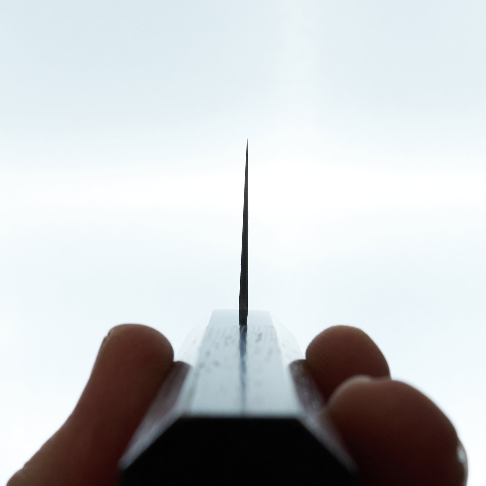 The Hatsukokuro Hayabusa series is made from HAP40 high carbon steel laminated in soft stainless steel for easy maintenance. HAP40 steel has a hardness of ~66 HRC and is known for its incredible edge retention and great toughness despite being very hard. HAP40 will form a patina over time but more slowly than some purer carbon steels.