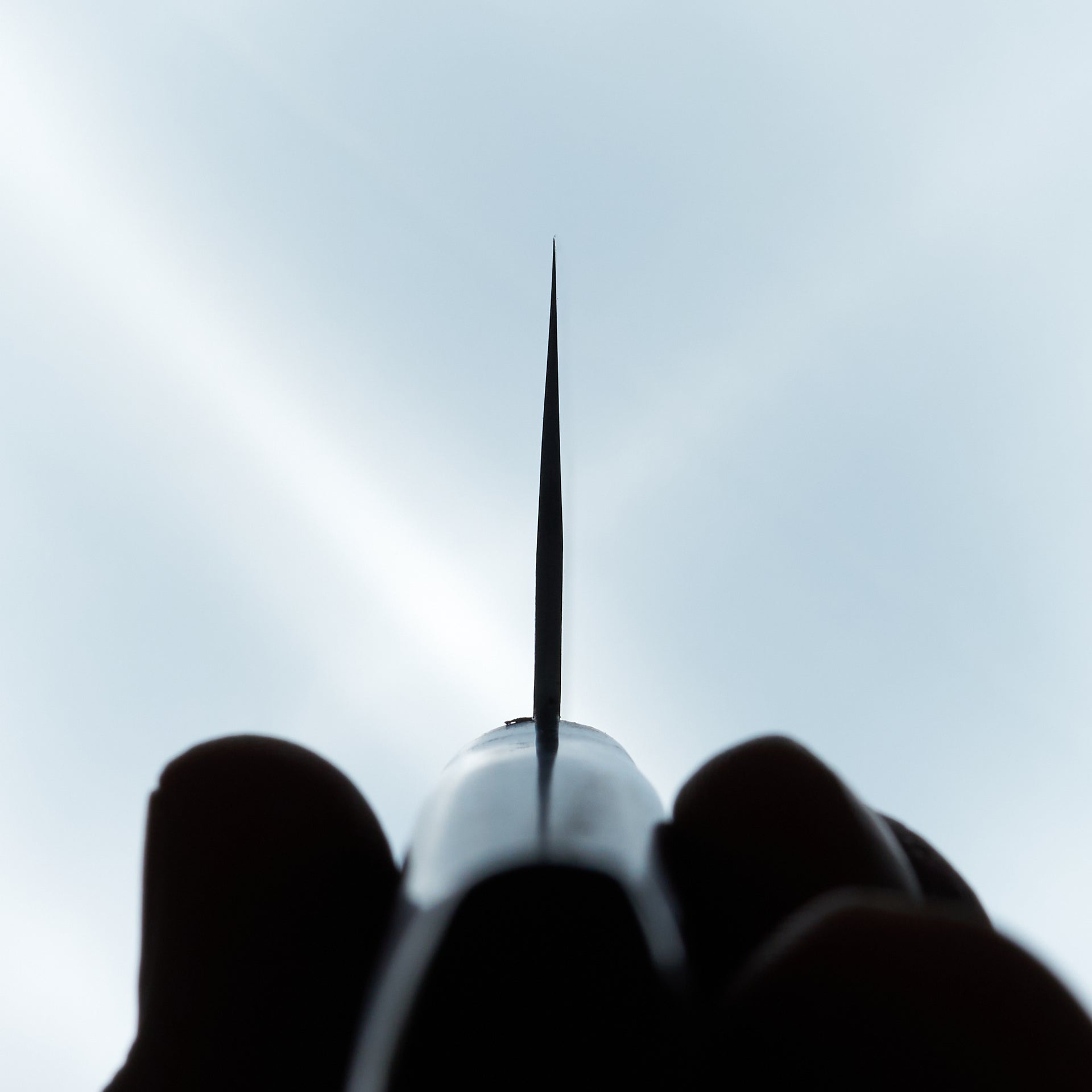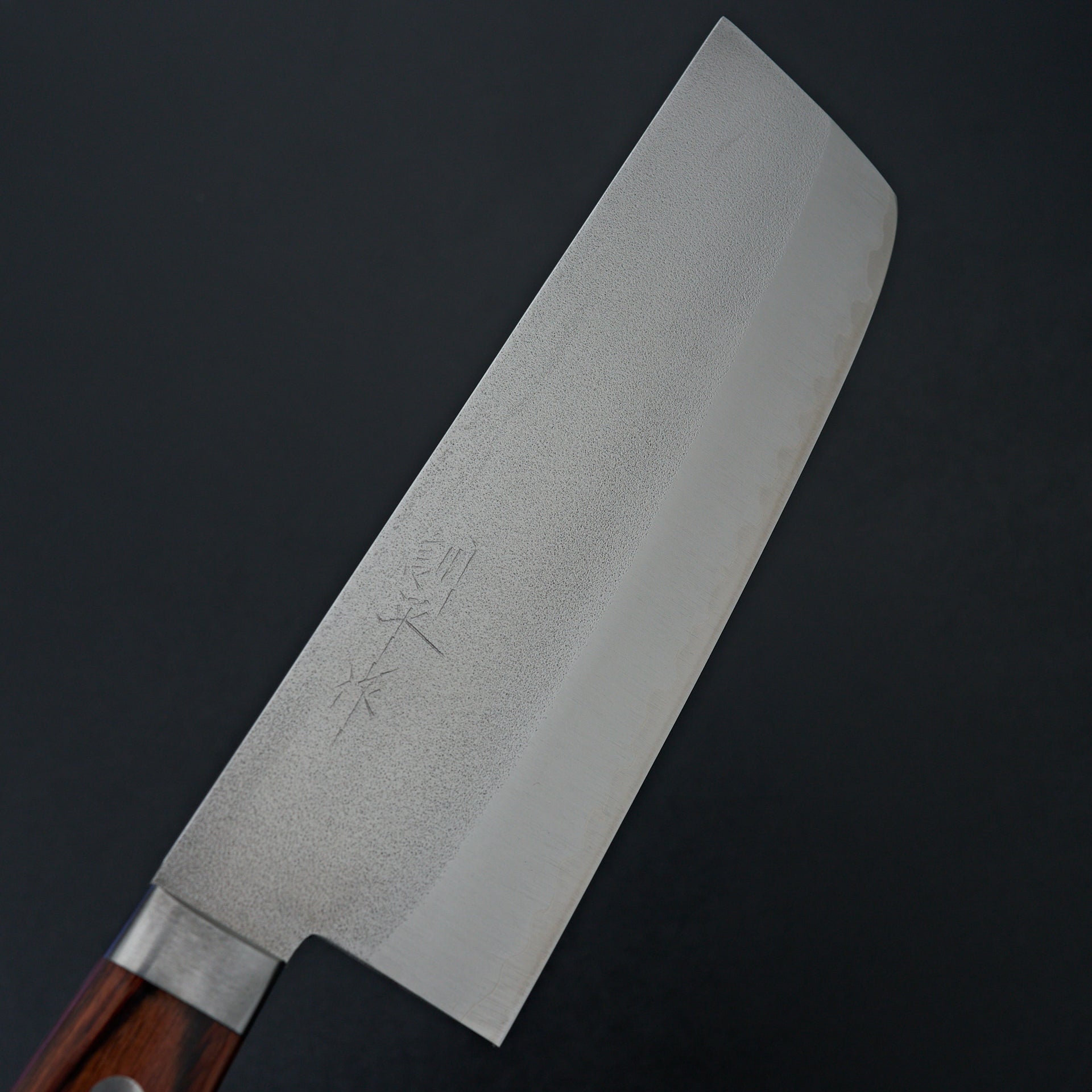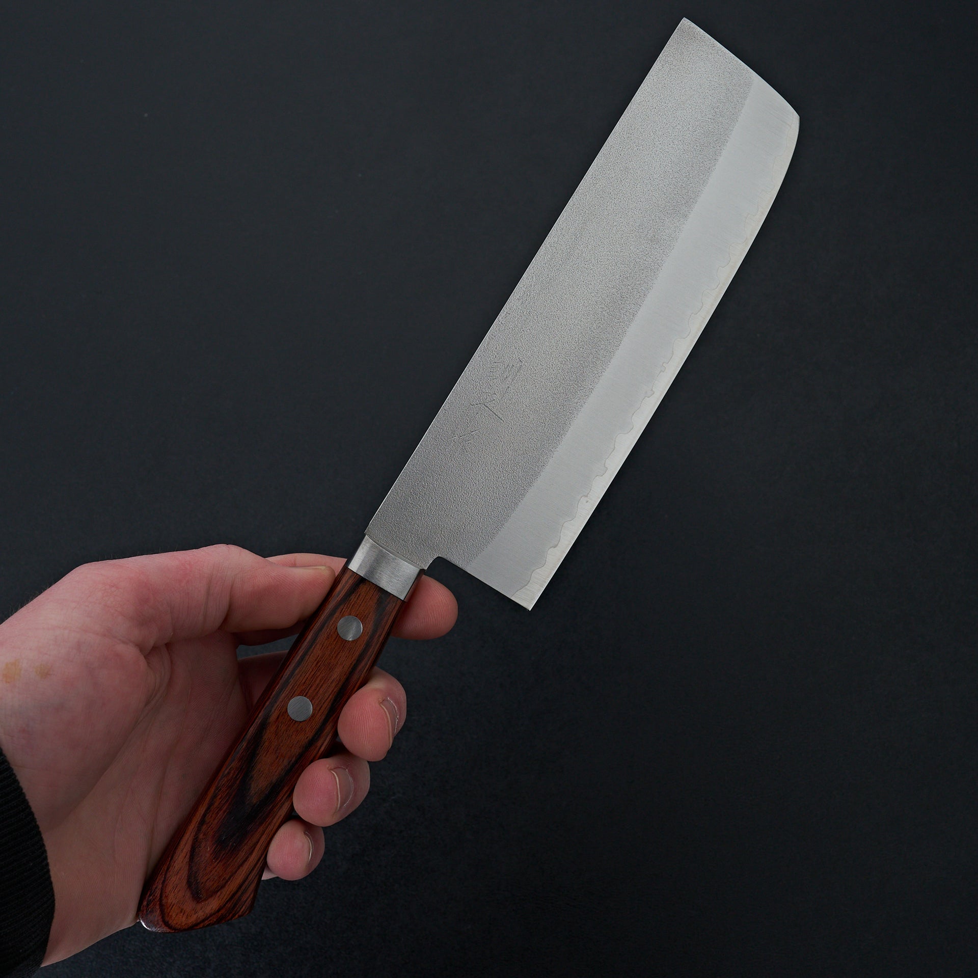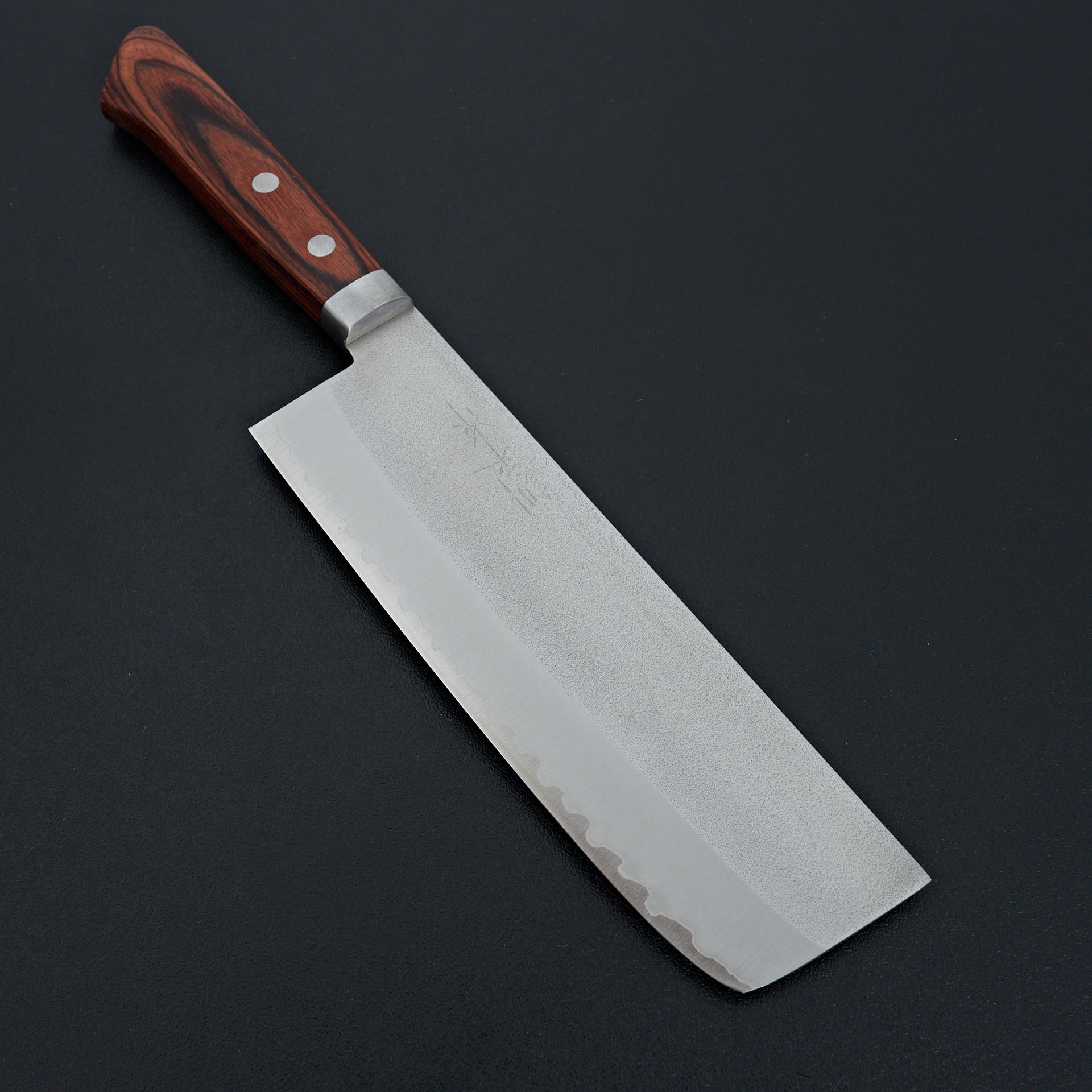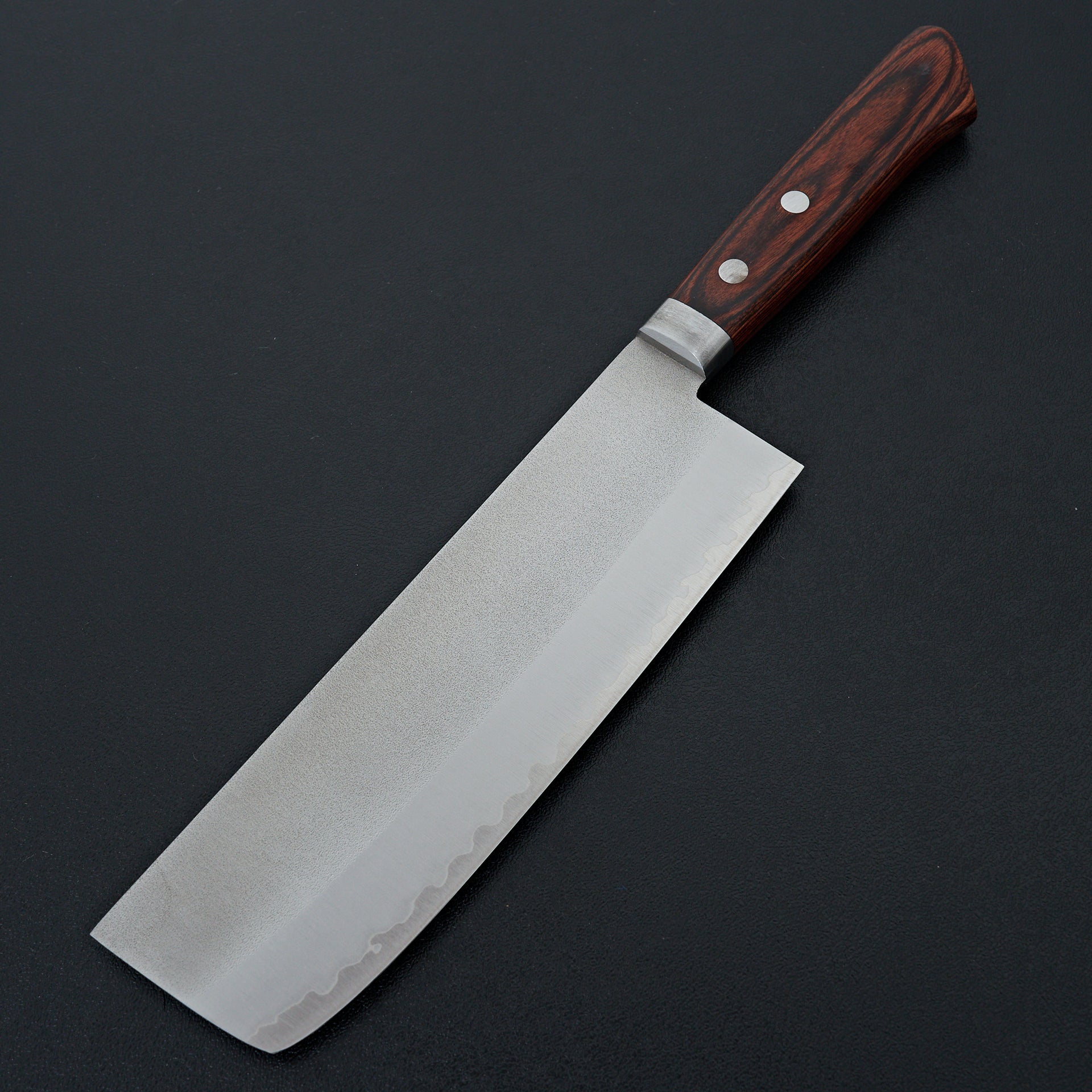 Masutani knives are made in Echizen Japan and offer incredible value. The blade is forged from VG1 core steel with stainless cladding. The blade face is finished with the nashiji (skin of an Asian pear) pattern. Thin grinds provide excellent cutting ability and the initial edge is very good from Masutani. The handles are a unique western style with partial tang made from pakka wood.