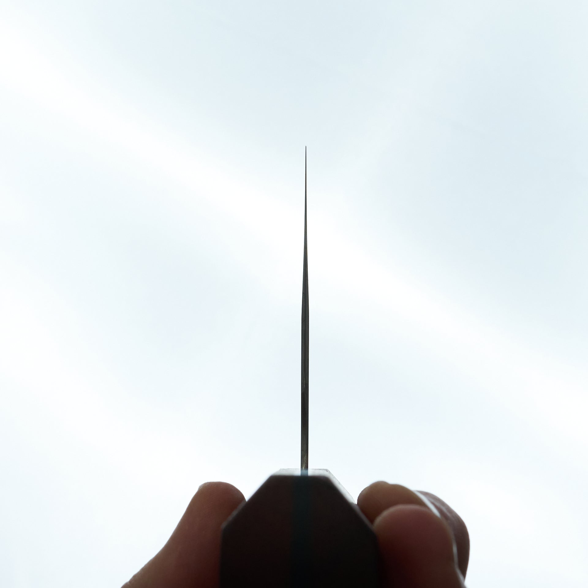 Hyde Handmade Knives are based out of Baltimore, MD by bladesmith Henry Hyde. This blade was hand forged from high carbon 125cr1 high carbon steel and left with some natural texture from forging. The octagonal handle is made from padauk. The fit and finish is excellent with rounded spine and choil. This blade has a very tall heel height and a very nice feel in hand.
