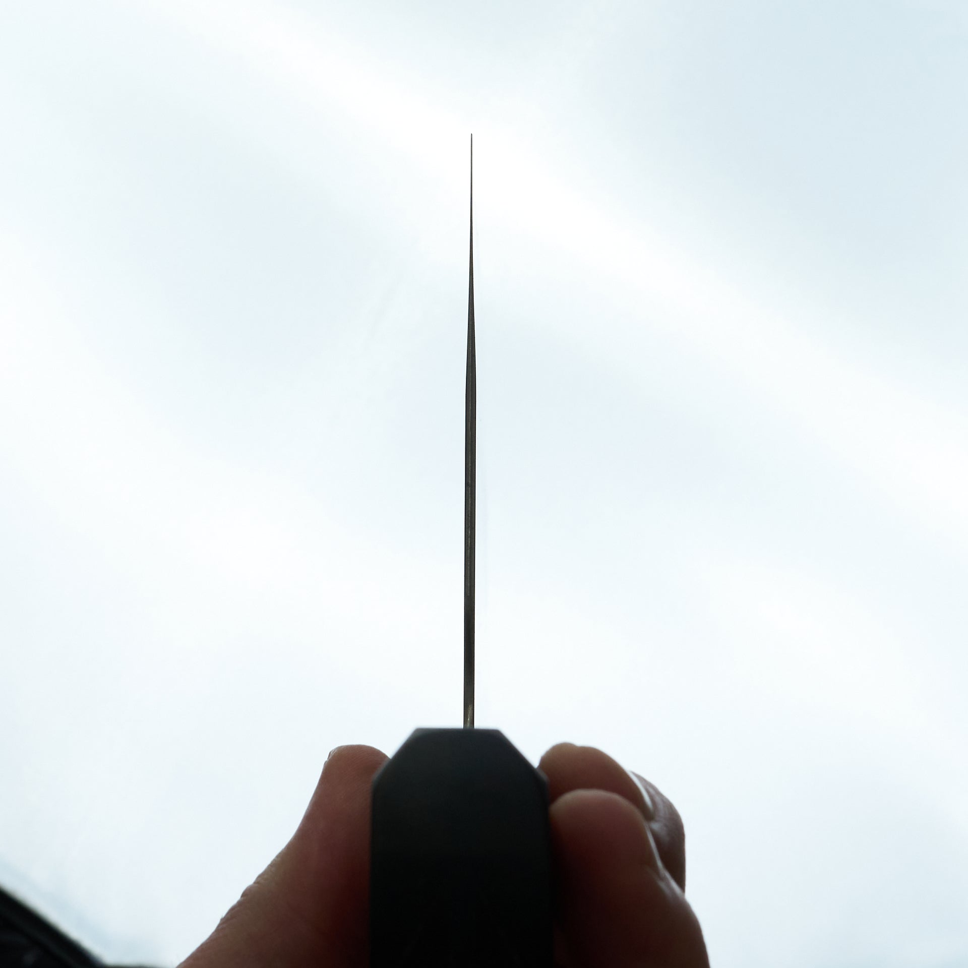 Hyde Handmade Knives are based out of Baltimore, MD by bladesmith Henry Hyde. This blade was hand forged from high carbon 125cr1 high carbon steel and left with some natural texture from forging. The octagonal handle is made from snakewood. The fit and finish is excellent with rounded spine and choil. This blade has a very tall heel height and a very nice feel in hand.