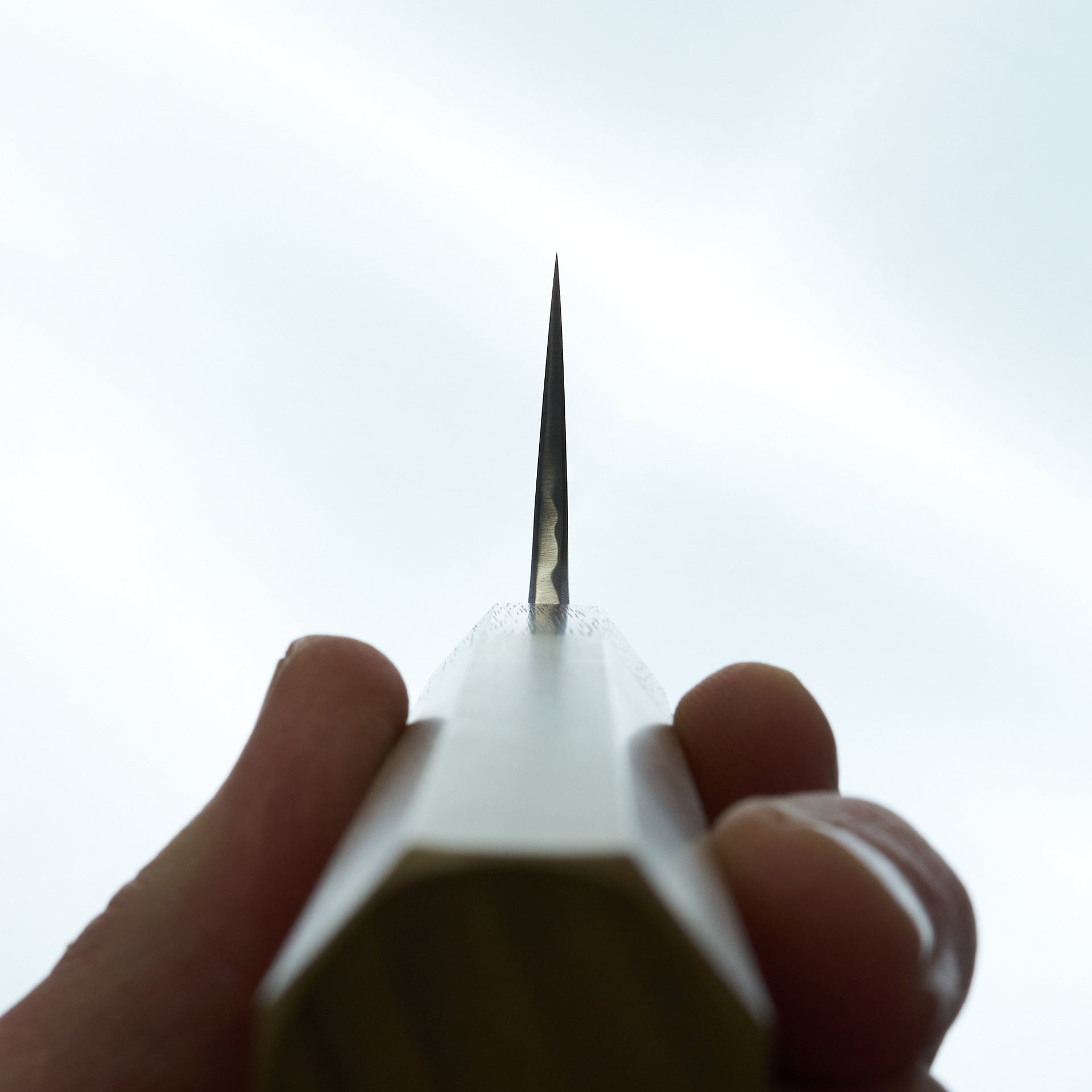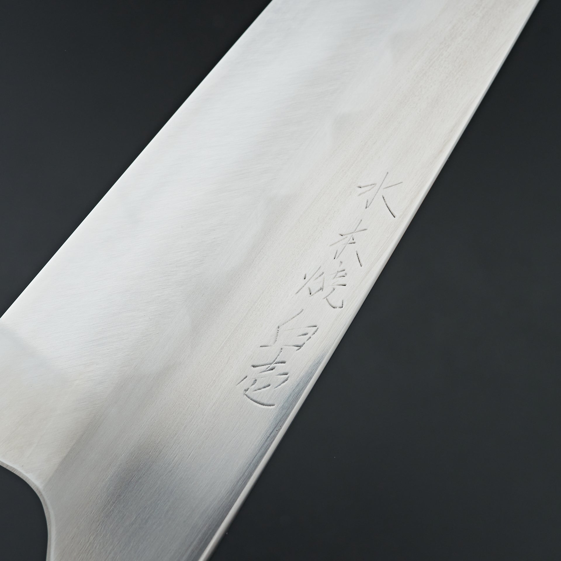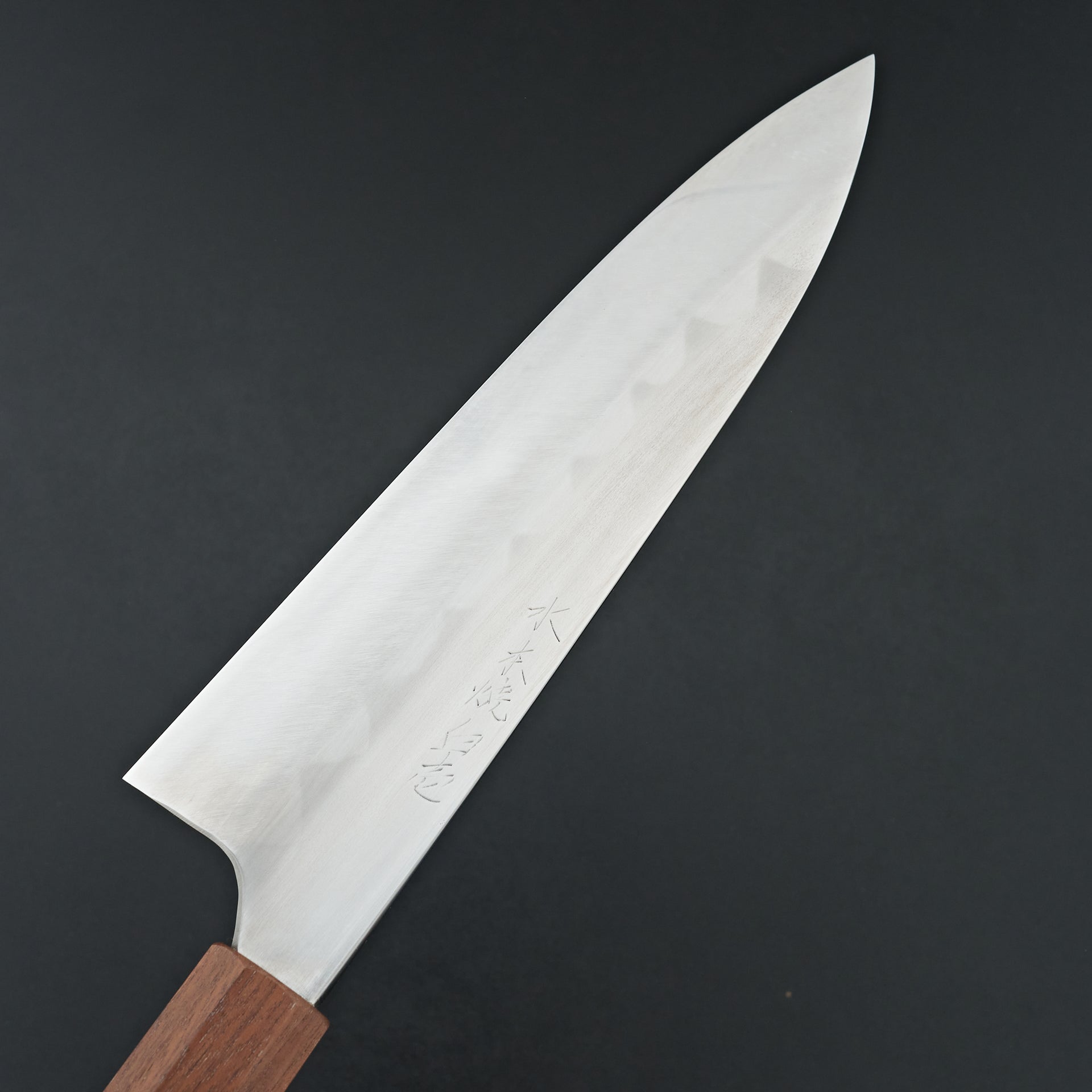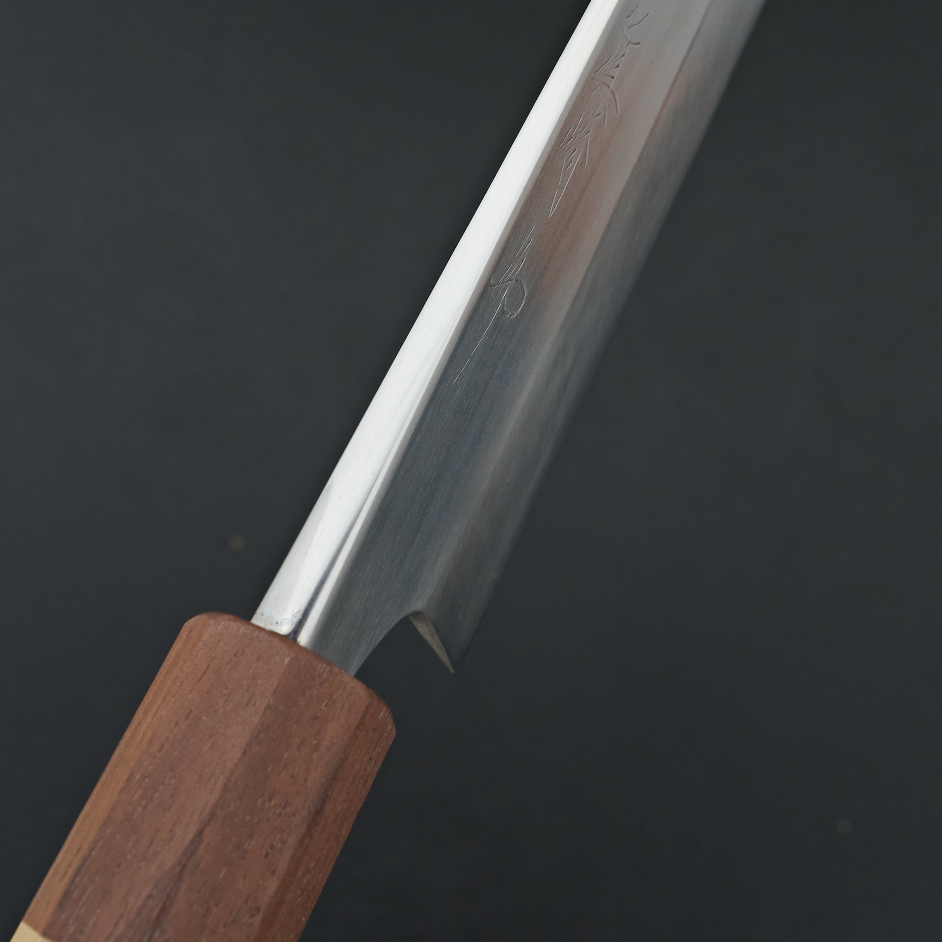 This knife is made from solid hand forged Shirogami #1, water quenched and differentially heat treated to ~65 hrc. Hand finished on stone, lightly convexed bevels and very thin behind the cutting edge. The blade is satin finished with rounded spine and choil. Hand engraved backside marking bearing the honyaki signature. Octagonal magnoklia and walnut ferrule.