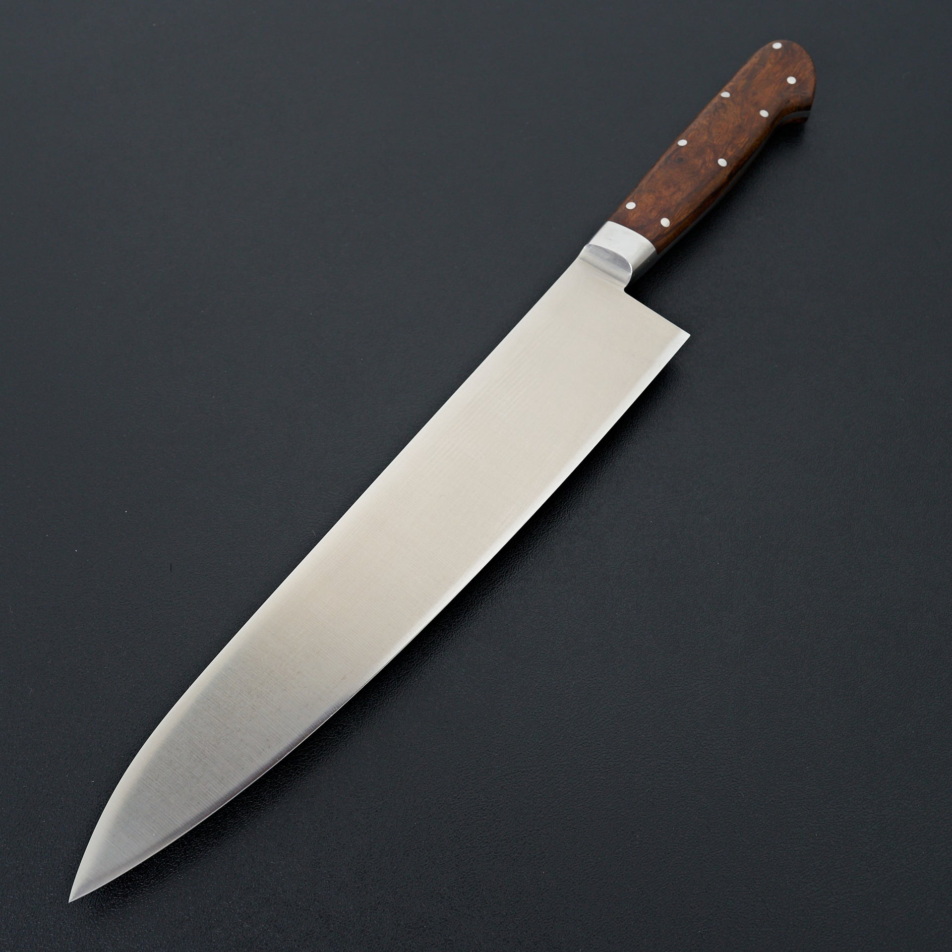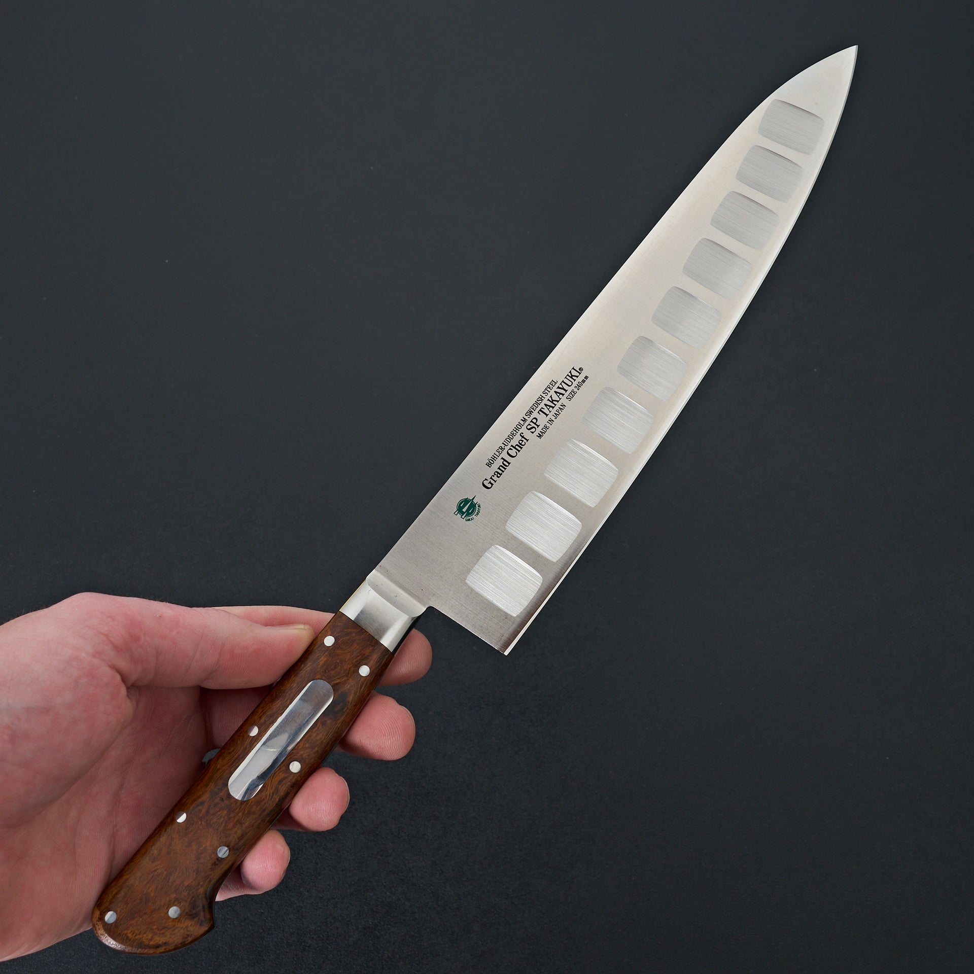 Grand Chef Series SP by Sakai Takayuki is a professional series of knives using high grade Bohler-Uddeholm stainless steel hardened to 61 HRC. This steel has very fine grain, good toughness and excellent edge life. Many professionals adore this series for its long lasting edge. The blade is ground thin and the blade face is hollow ground on the right side for excellent food release. The riveted western handle is made from Arizona desert ironwood, crafted by woodworker Sugihara.