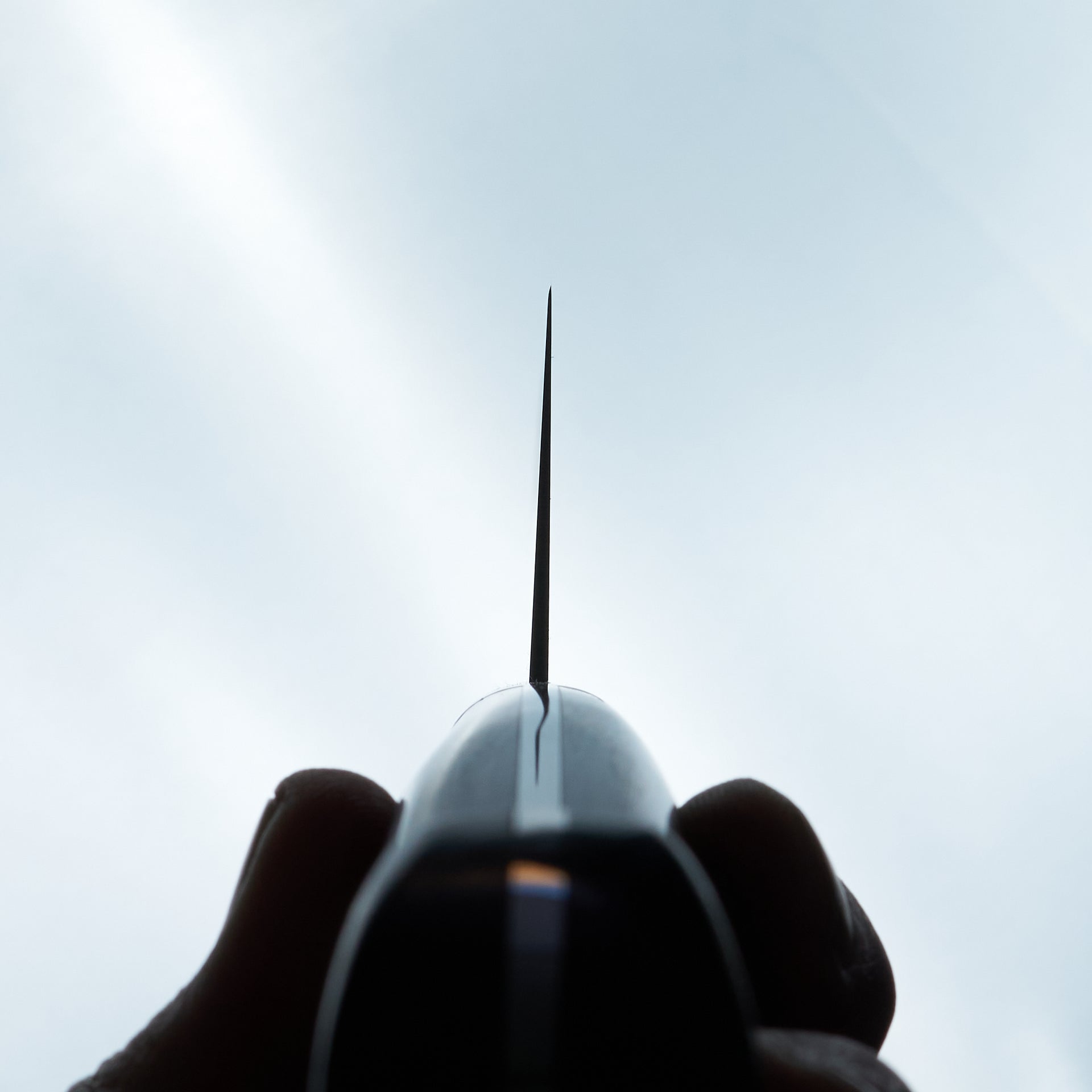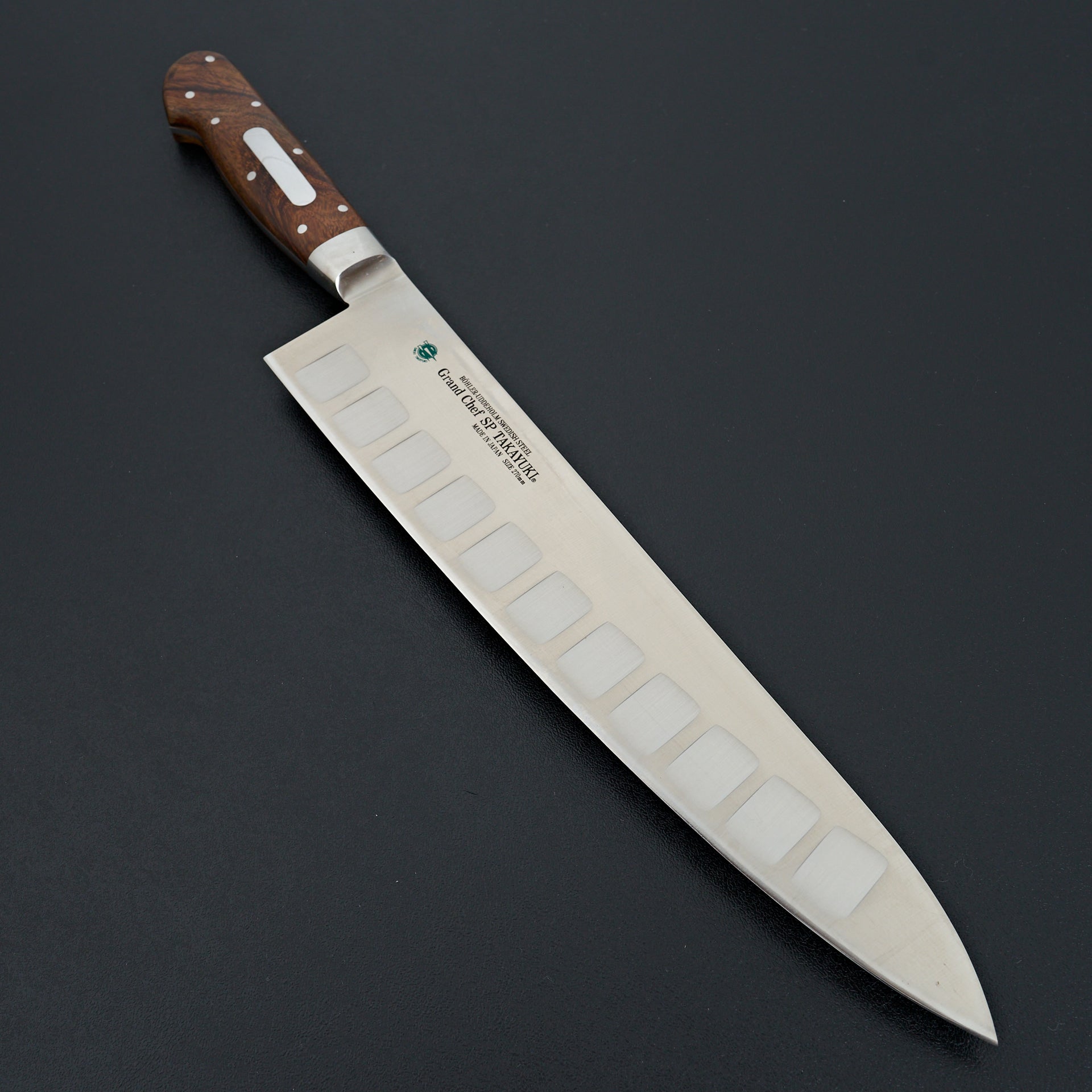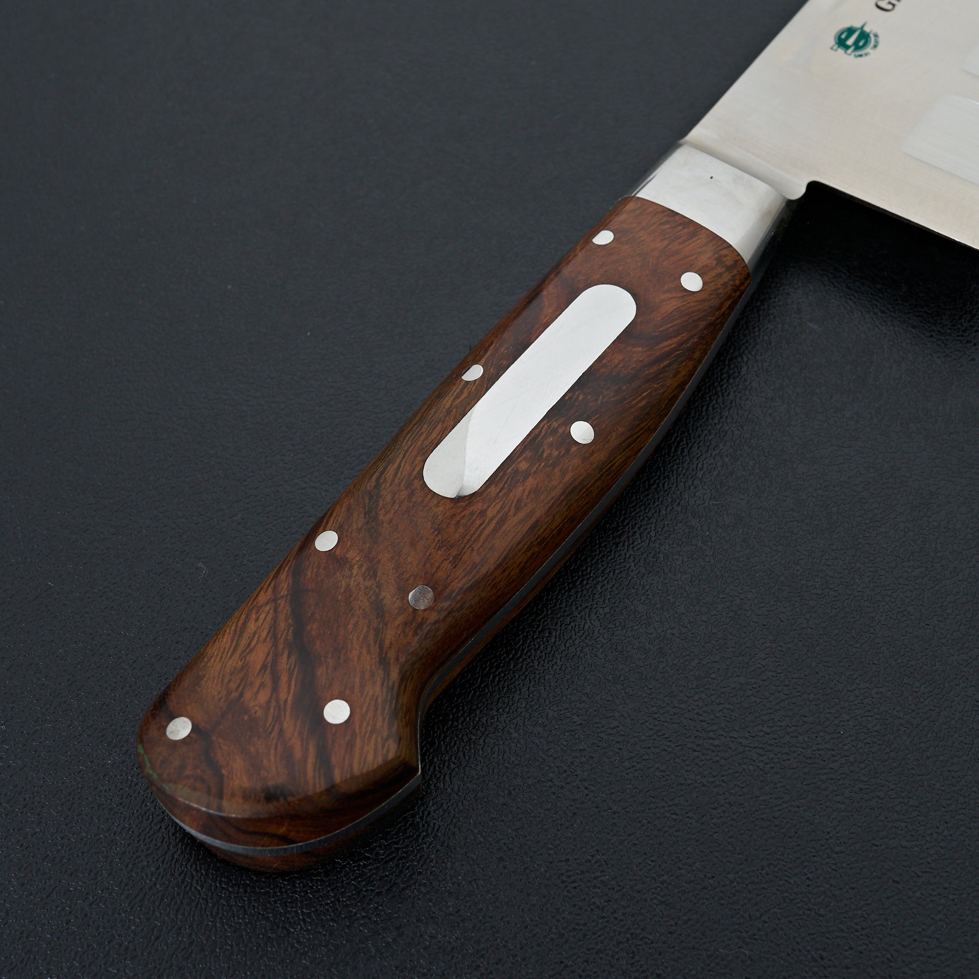 Grand Chef Series SP by Sakai Takayuki is a professional series of knives using high grade Bohler-Uddeholm stainless steel hardened to 61 HRC. This steel has very fine grain, good toughness and excellent edge life. Many professionals adore this series for its long lasting edge. The blade is ground thin and the blade face is hollow ground on the right side for excellent food release. The riveted western handle is made from Arizona desert ironwood, crafted by woodworker Sugihara.