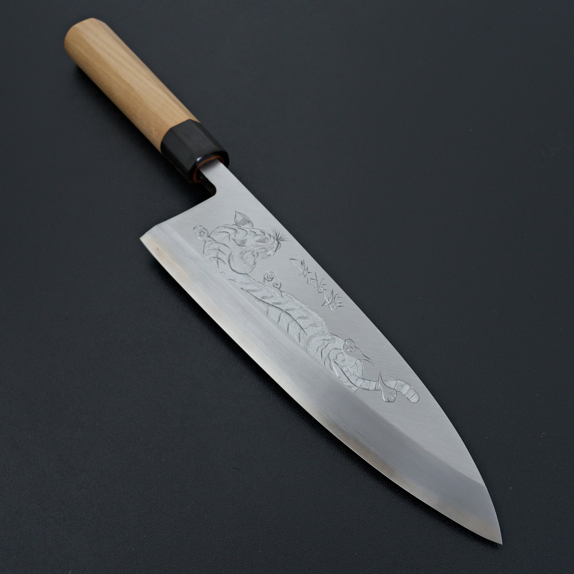 One of a kind piece, hand engraved by Michiko Kubota of Sakai Takayuki. Michiko San's work is unmistakable and each engraving takes an hours of work from conception to finished product. Each knife comes with a custom box, all hand personalized by Michiko.