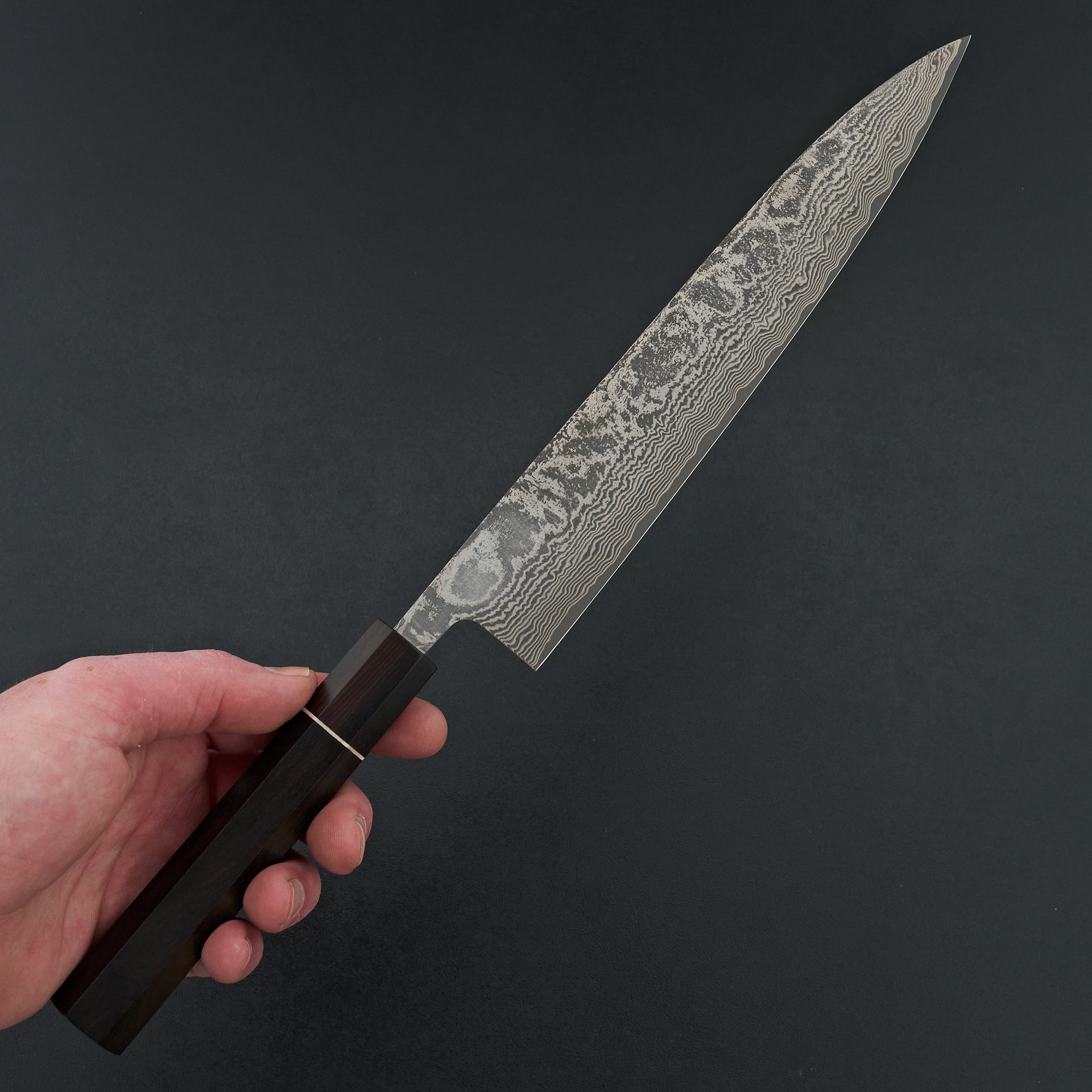 Shiro Kamo is a master certified bladesmith working out of Takefu knife village in Echizen Japan. This series is made from hand forged SG2 powdered steel laminated in damascus cladding. Tjhe blade face has a darkened etch for a high contrast finish showcasing the damascus patterning. Kamo sans knives are loved for their tall profiles and very smooth sharpening work. His blade geometry is thin, but still has a bit of body to it. The octagonal handles are made from ebony with a white synthetic spacer.