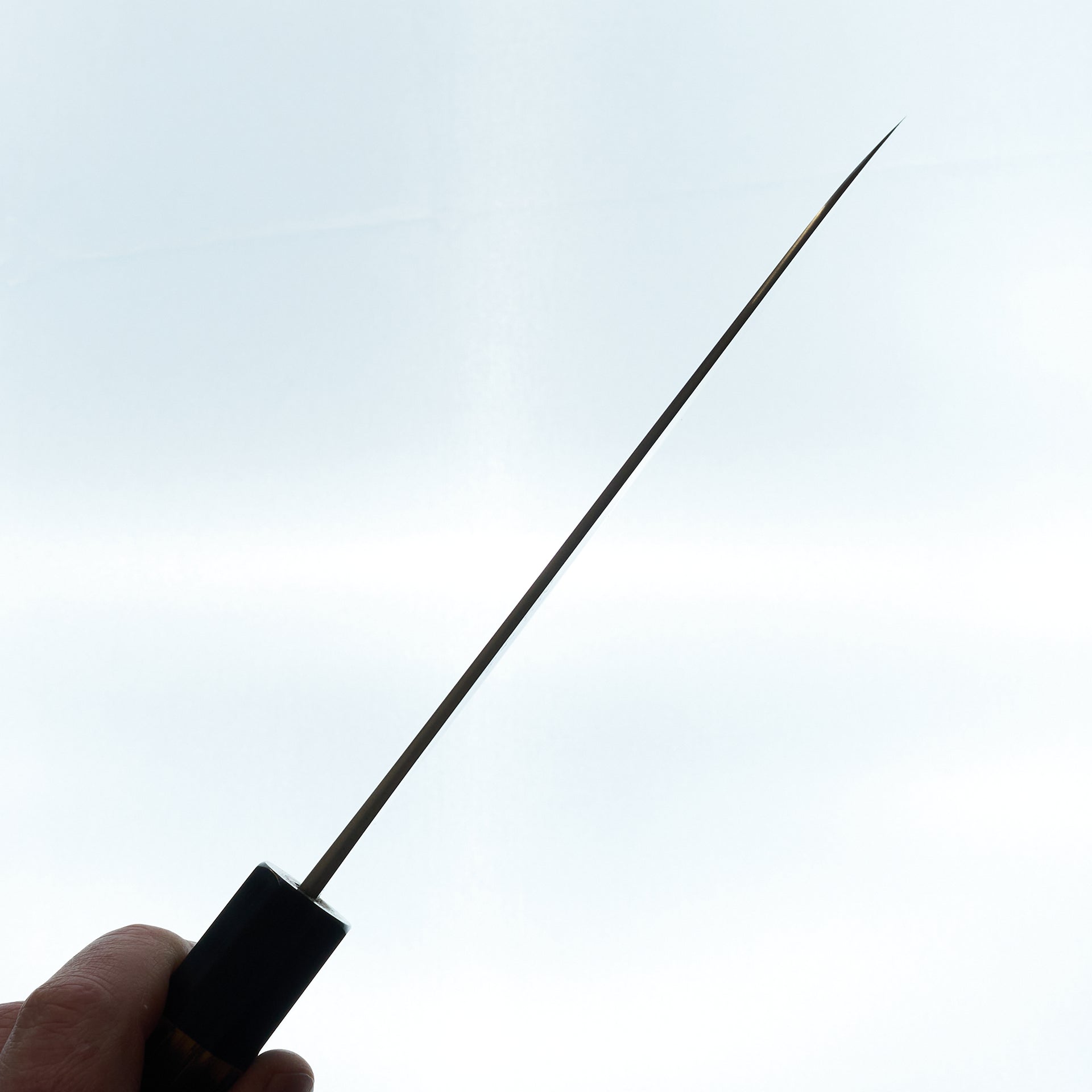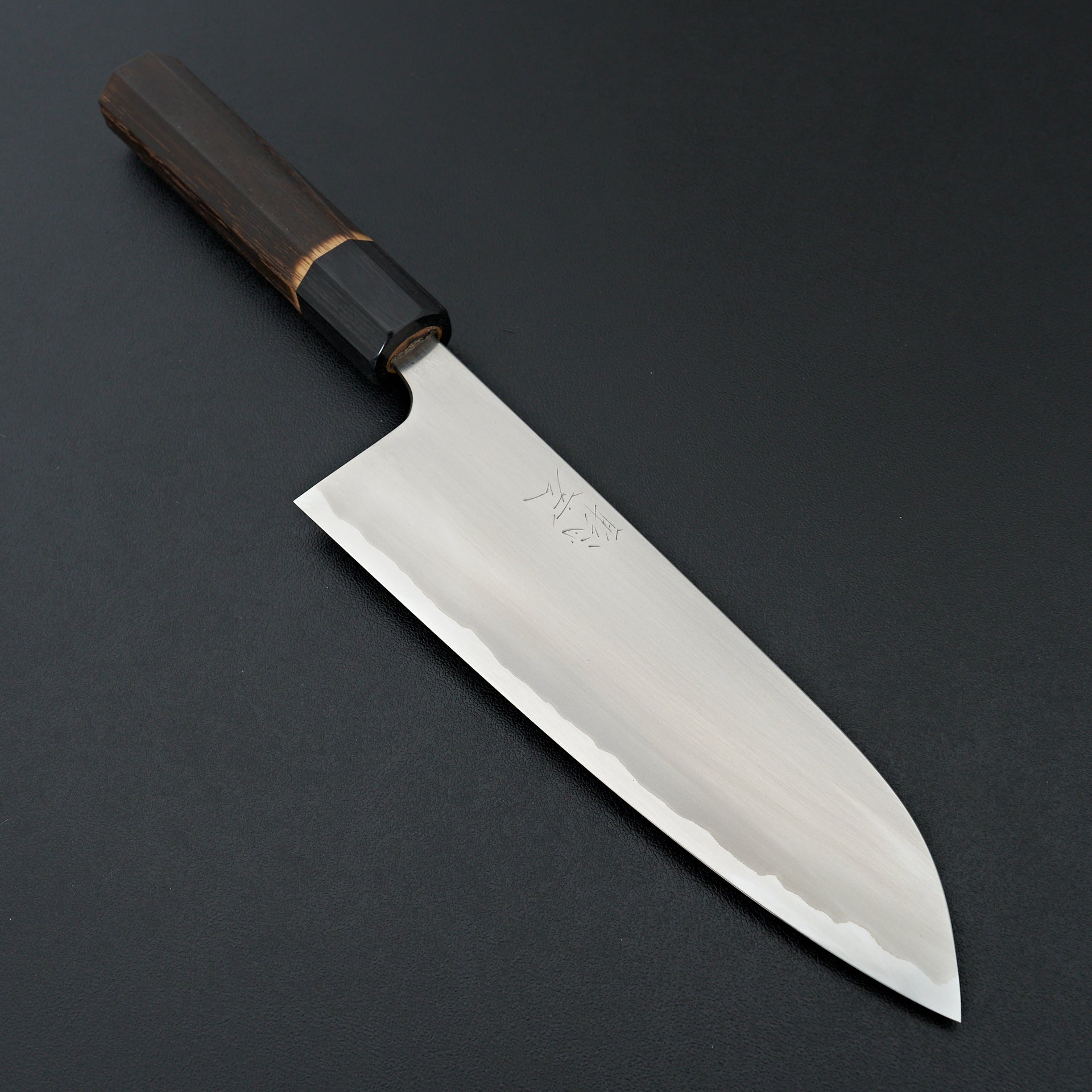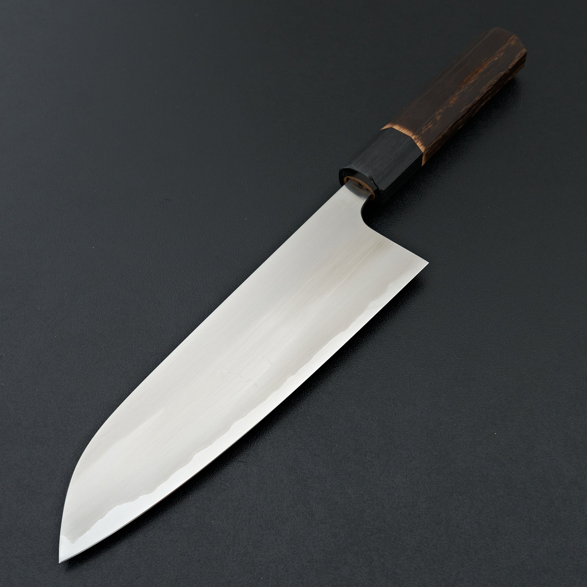 Toshihiro Wakui is a very talented blacksmith who is known for his superb grind and craftmanship. This series is forged from shirogami #2 (white #2) core steel with stainless cladding and a hardess of 63-64 hrc. The blades are very thin behind the edge while still retaining a stiffness at the spine. Wakui's blades have a very enjoyable cutting feel and move through ingredients with ease. Handle is octagonal burnt chestnut with a buffalo horn ferrule.