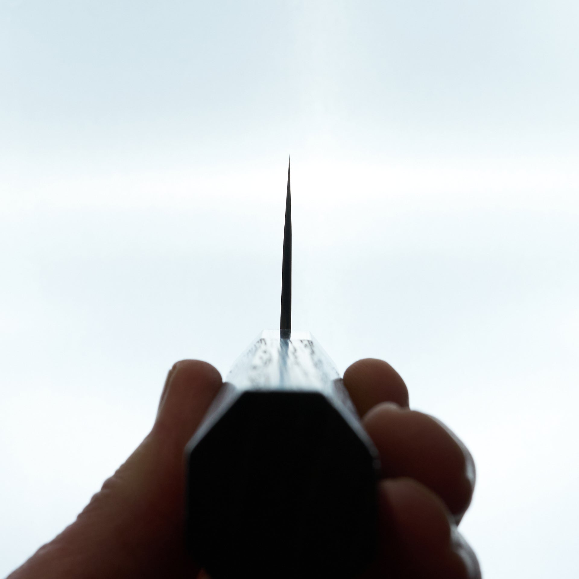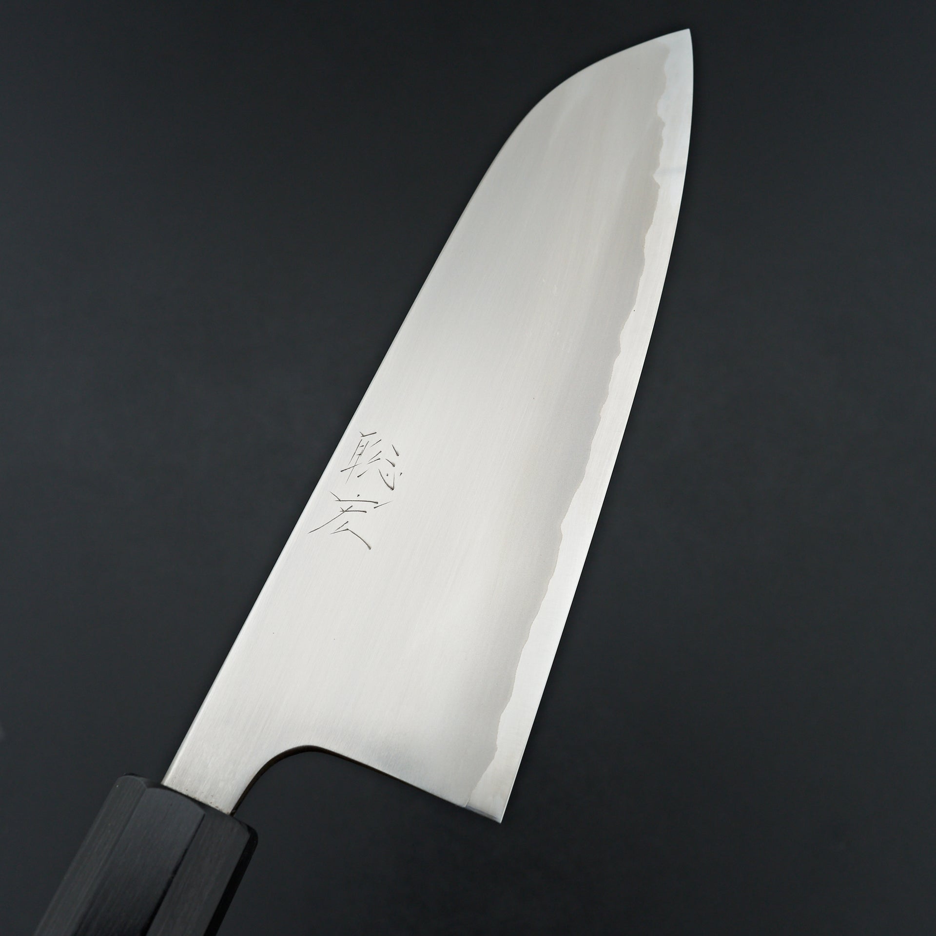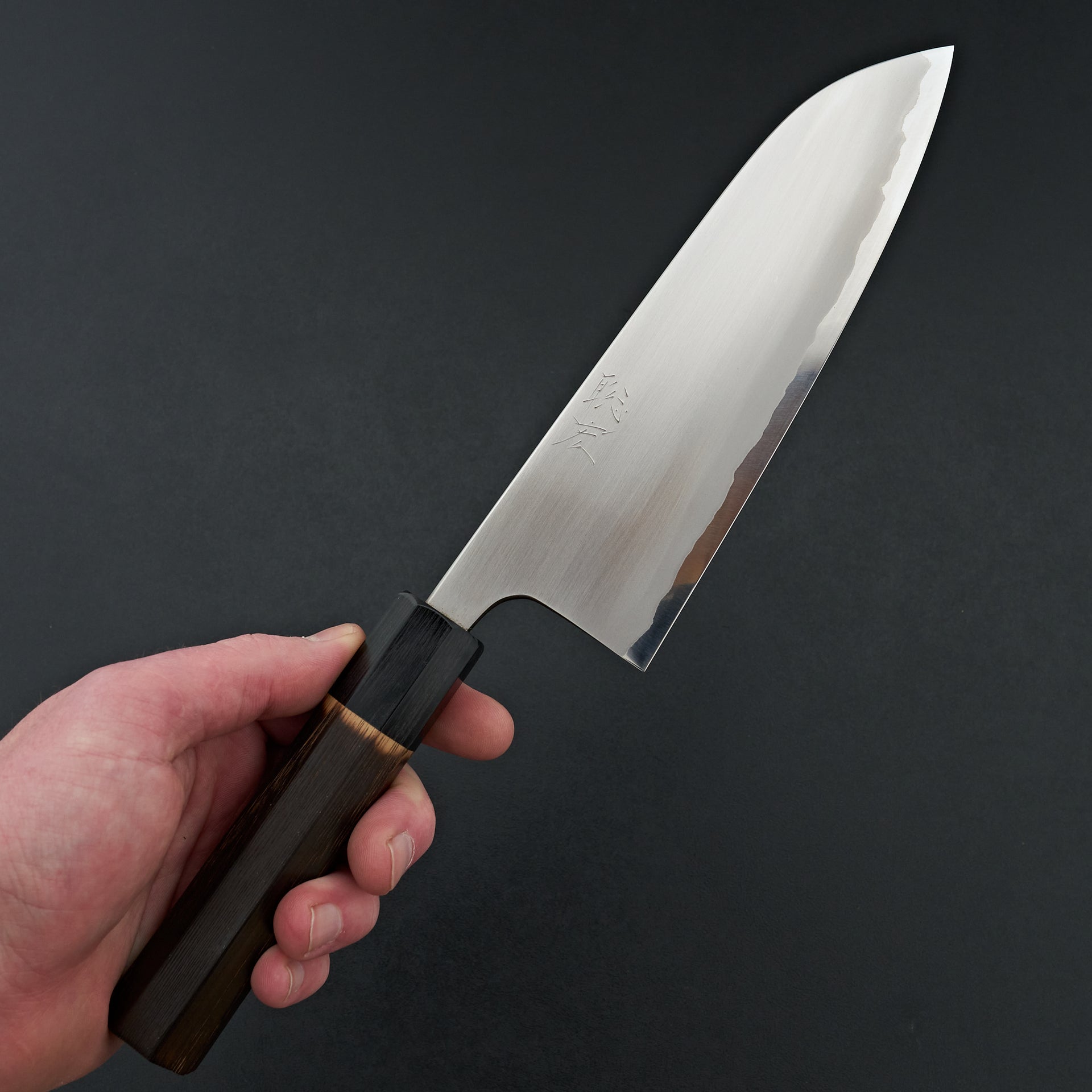 Toshihiro Wakui is a very talented blacksmith who is known for his superb grind and craftmanship. This series is forged from shirogami #2 (white #2) core steel with stainless cladding and a hardess of 63-64 hrc. The blades are very thin behind the edge while still retaining a stiffness at the spine. Wakui's blades have a very enjoyable cutting feel and move through ingredients with ease. Handle is octagonal burnt chestnut with a buffalo horn ferrule.
