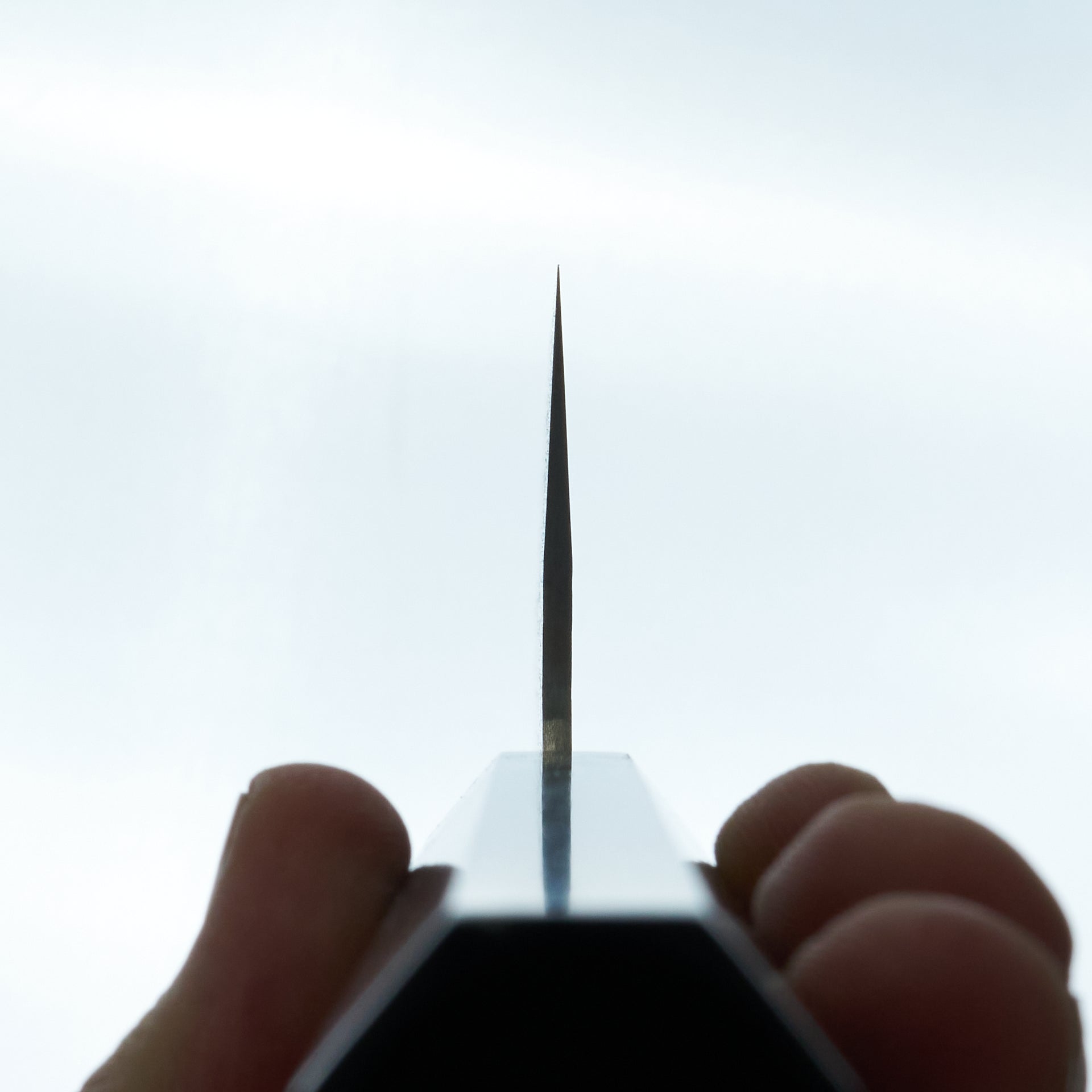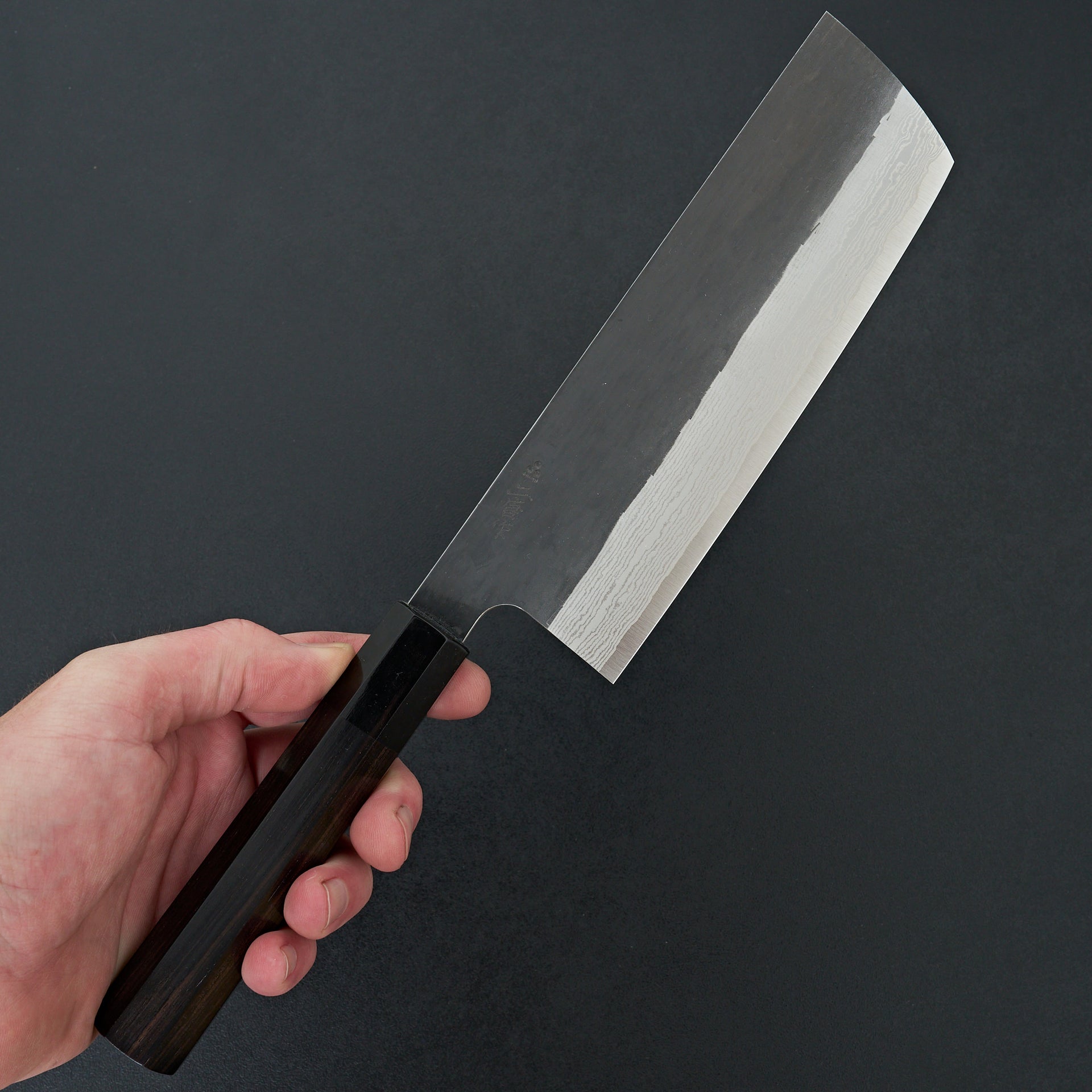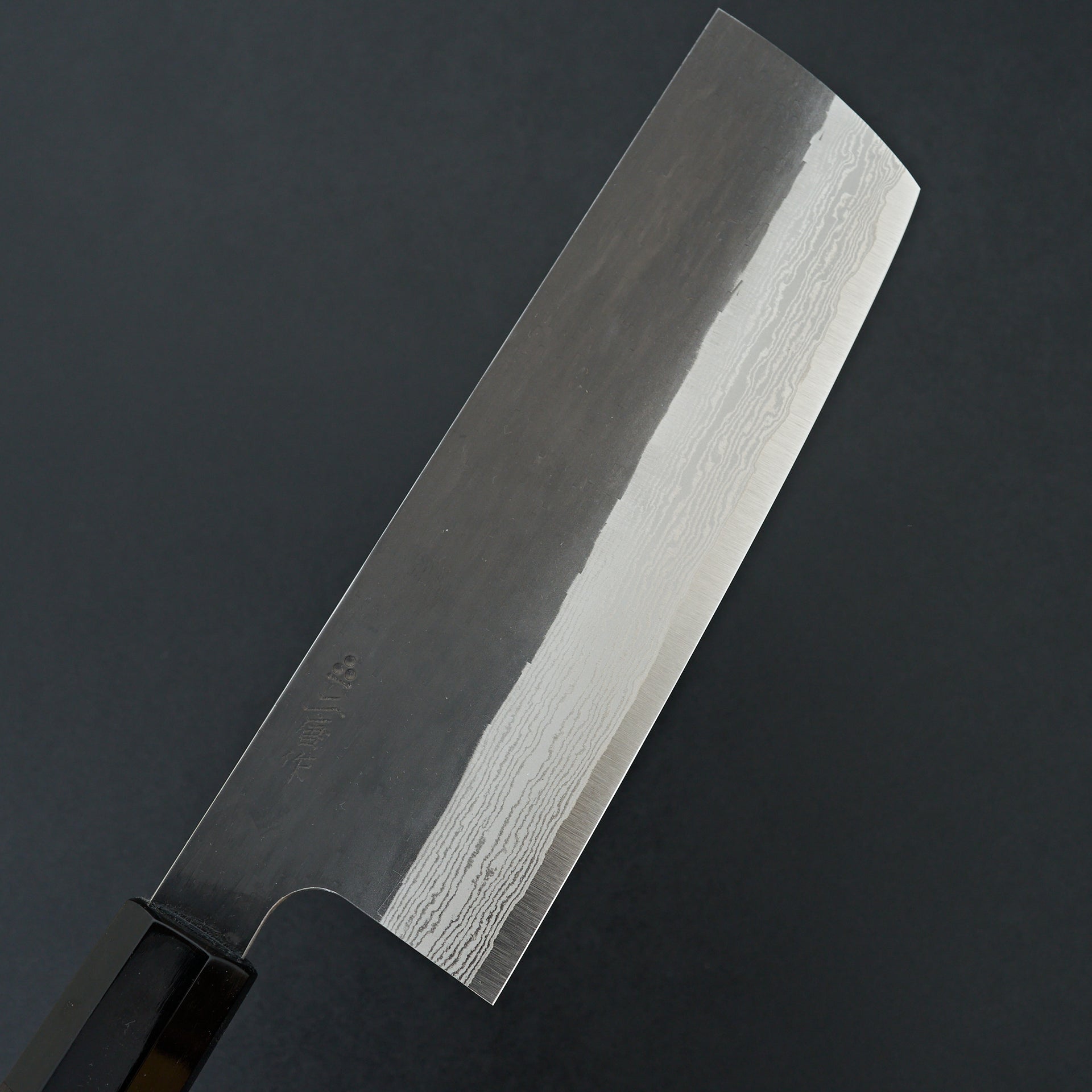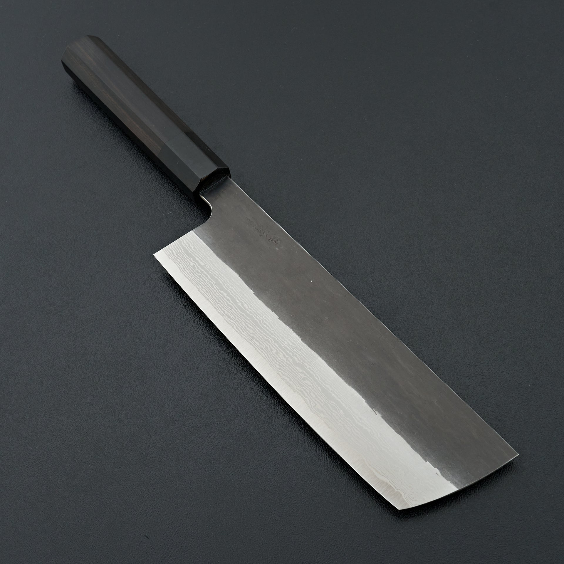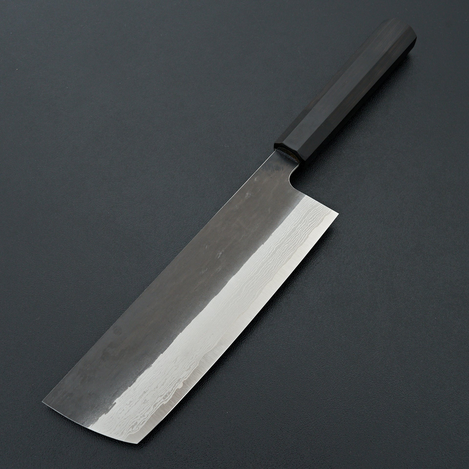 This blade is forged from VG Xeos steel laminated in damascus with a kurouchi finish. The blade face is finished with a light hammered pattern. These have improved sharpenability and edge retention over VG10 while still being a very well rounded and durable steel. These have a medium weight feel but still very performance focused in terms of cutting feel. Fitted with octagonal ebony handle and horn ferrule.