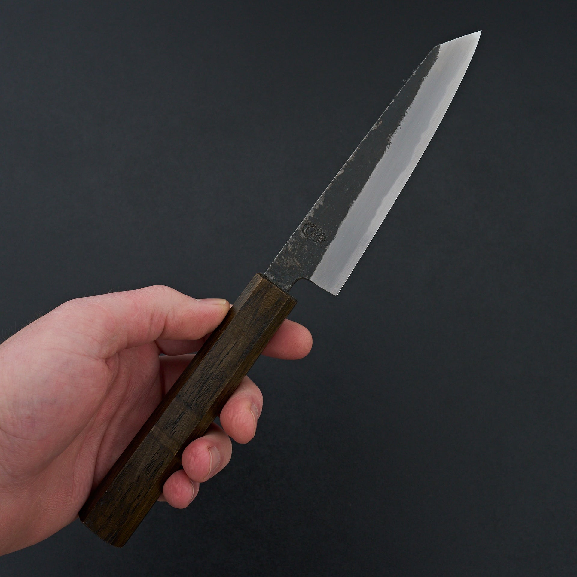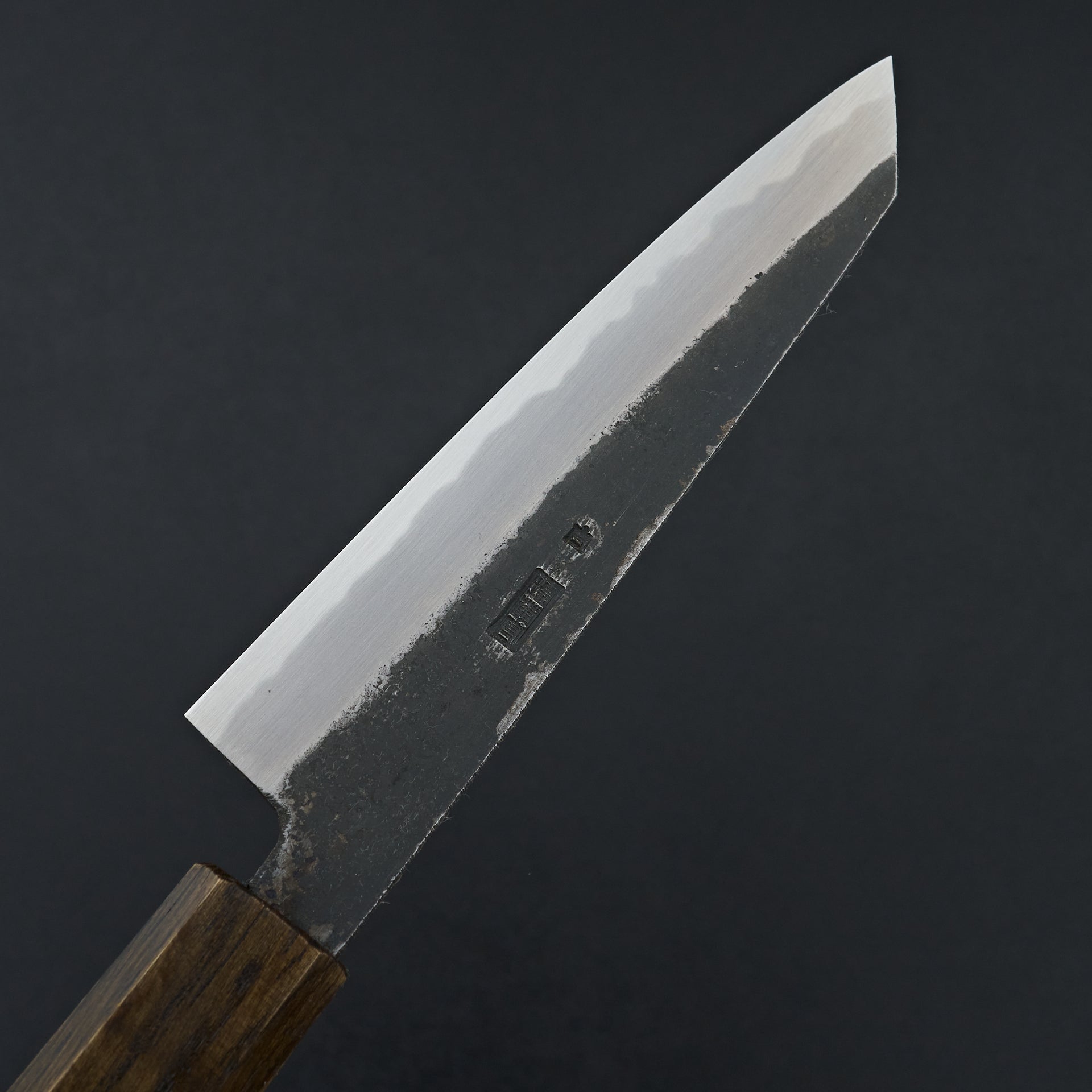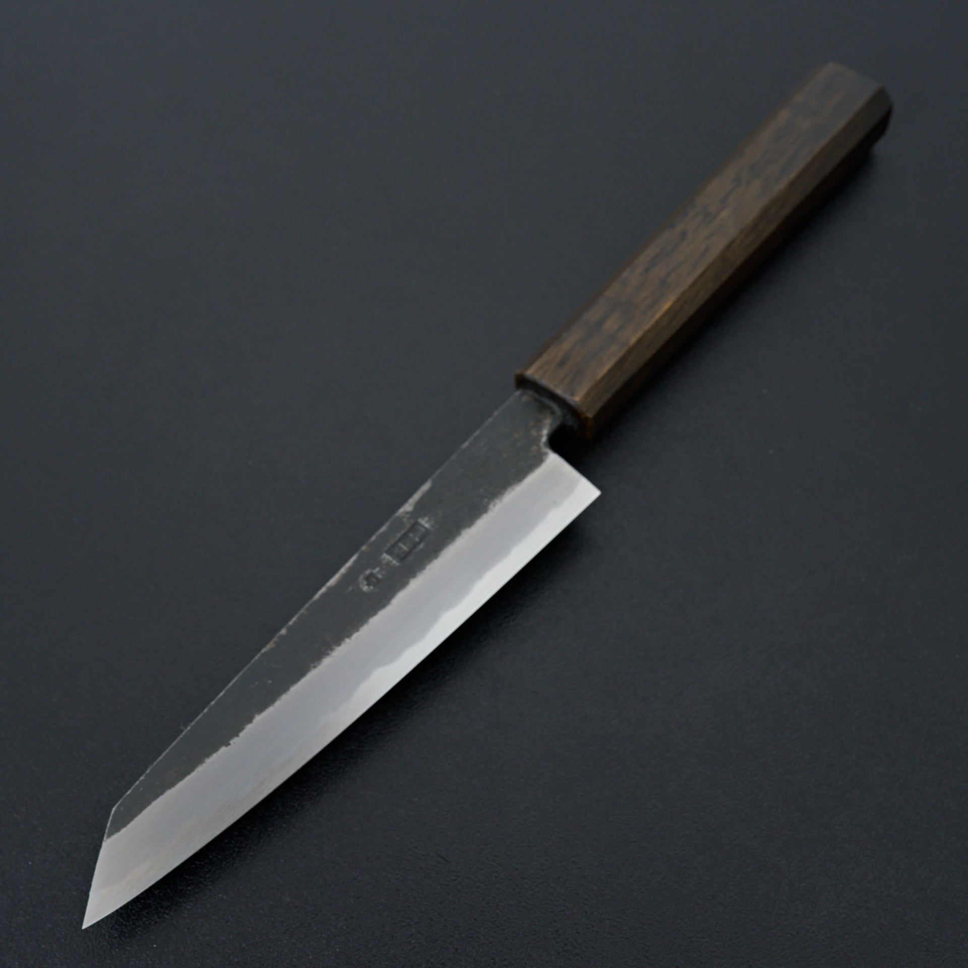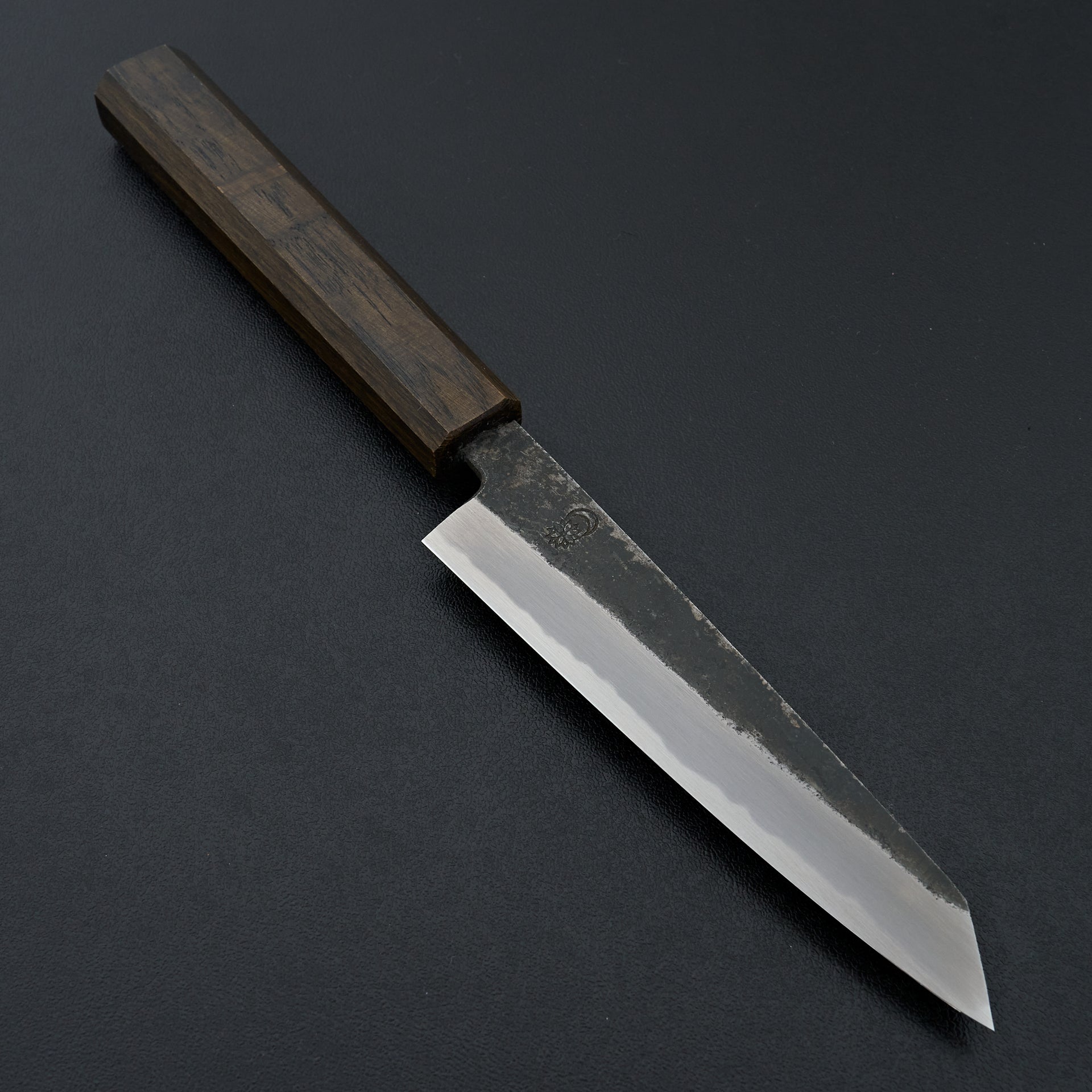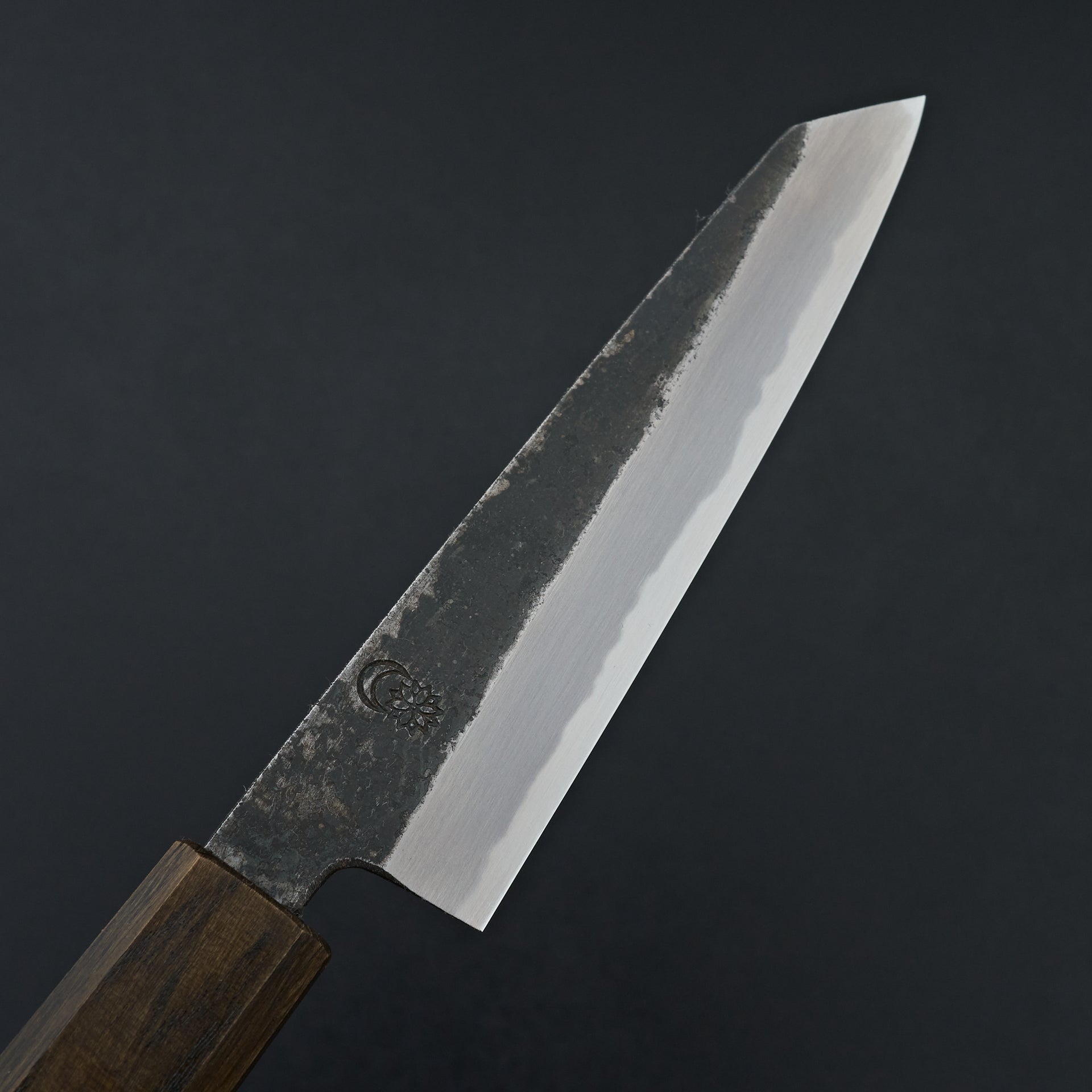 Kawamura Hamono was founded in 1926 in Sakai. Kikumori is praised for their beautiful craftsmanship utilizing traditional techniques specific to their region. Sakai Kikumori Kikuzuki is made from Shirogami #2 steel core and cladded in iron. The geometry of the kurouchi series is all forged in by the blacksmith, leaving the top of the blade with a light nashiji pattern. The mono octagonal handle is Japanese lacquered Oak wood.