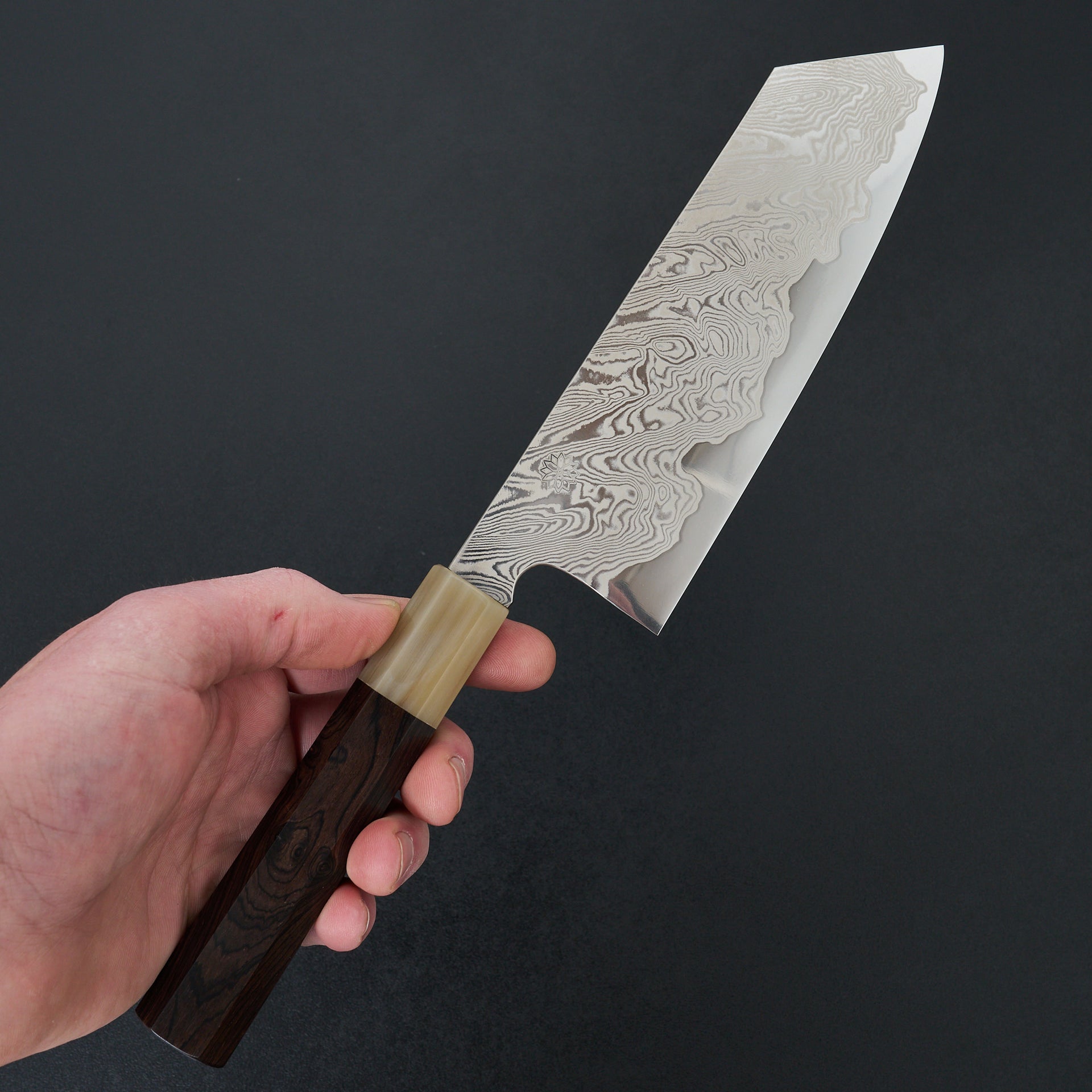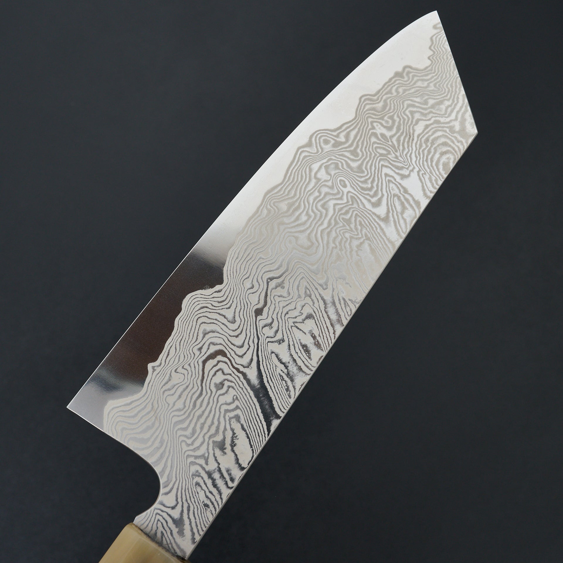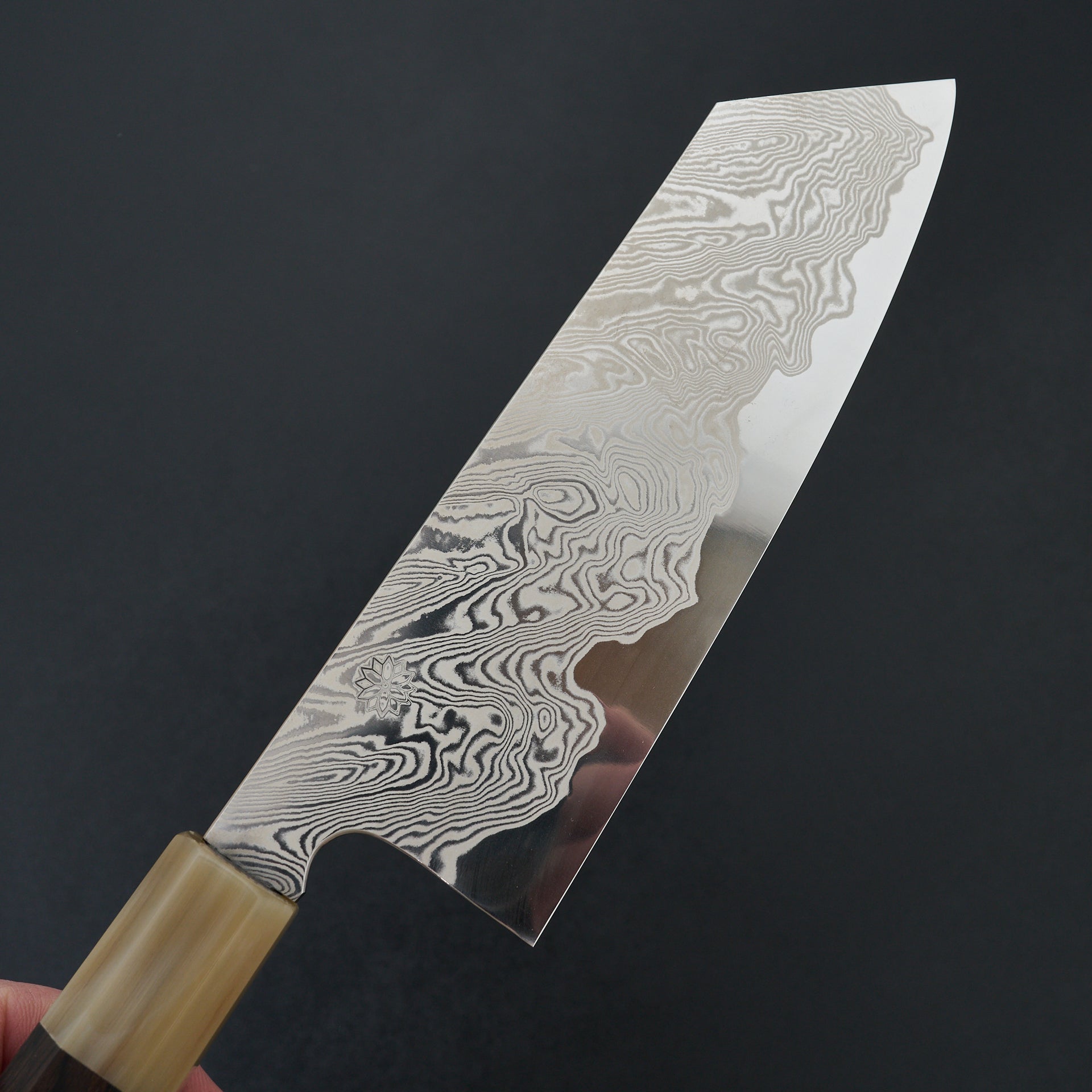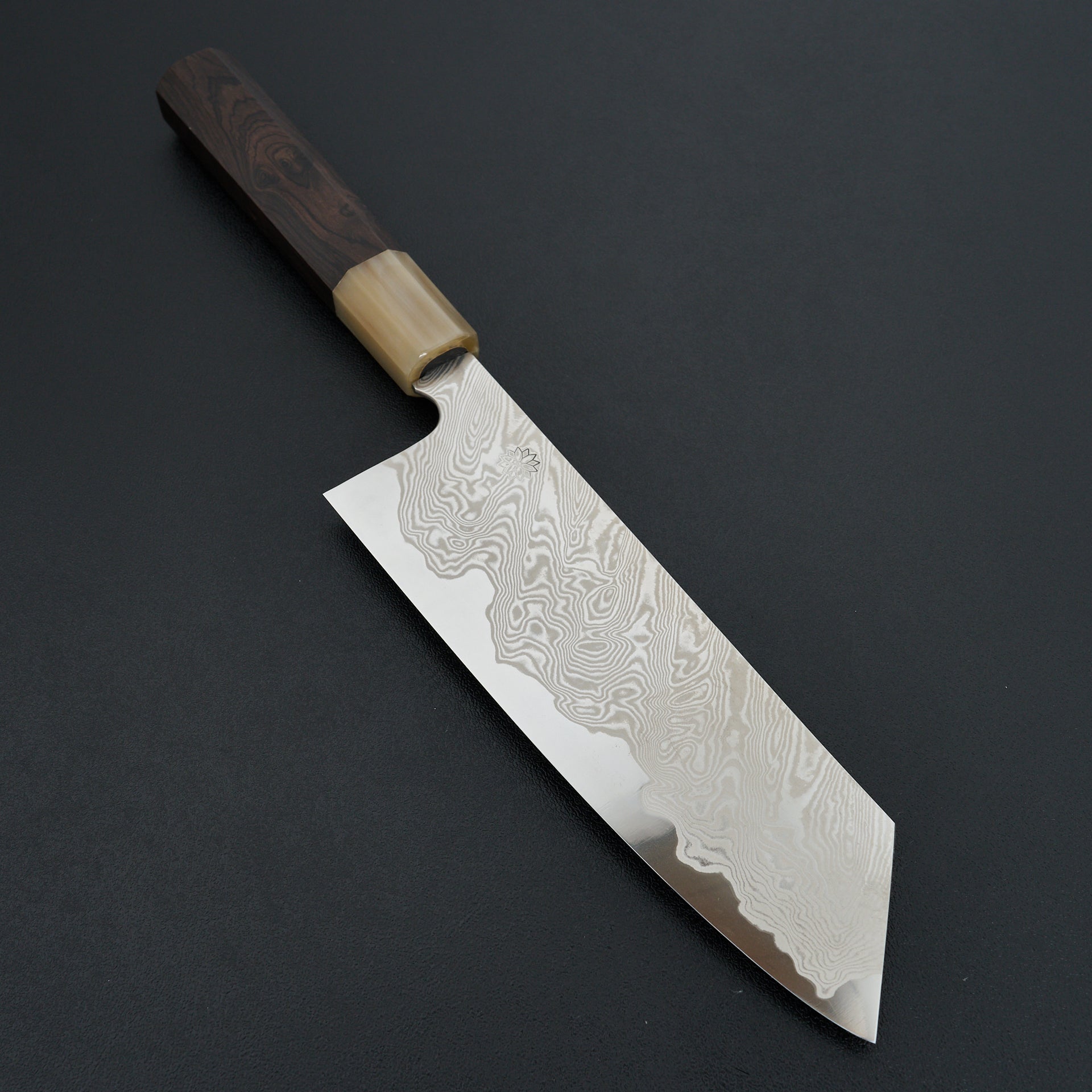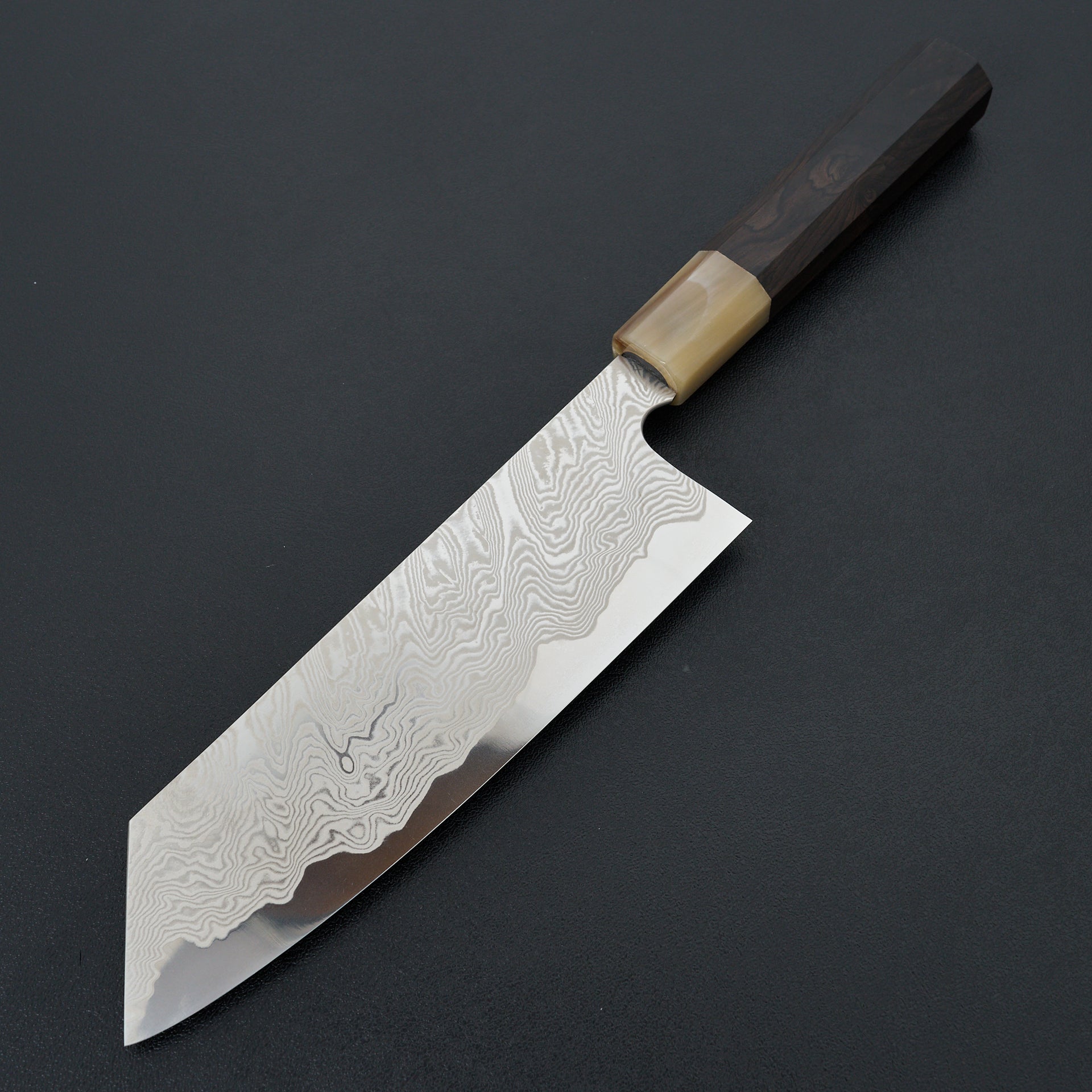 Kawamura Hamono was founded in 1926 in Sakai. Kikumori is praised for their beautiful craftsmanship utilizing traditional techniques specific to their region. This series is forged from ATS34 stainless steel with a damascus pattern. The grind is super thin and very performance oriented. The handle is made from Ebony wood and fitted with buffalo horn.