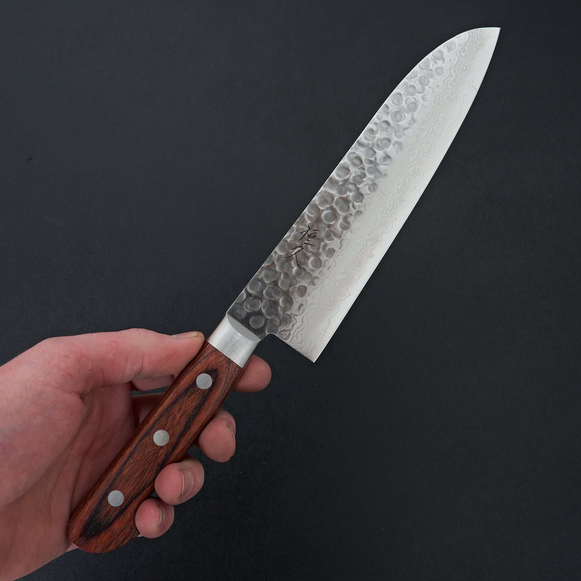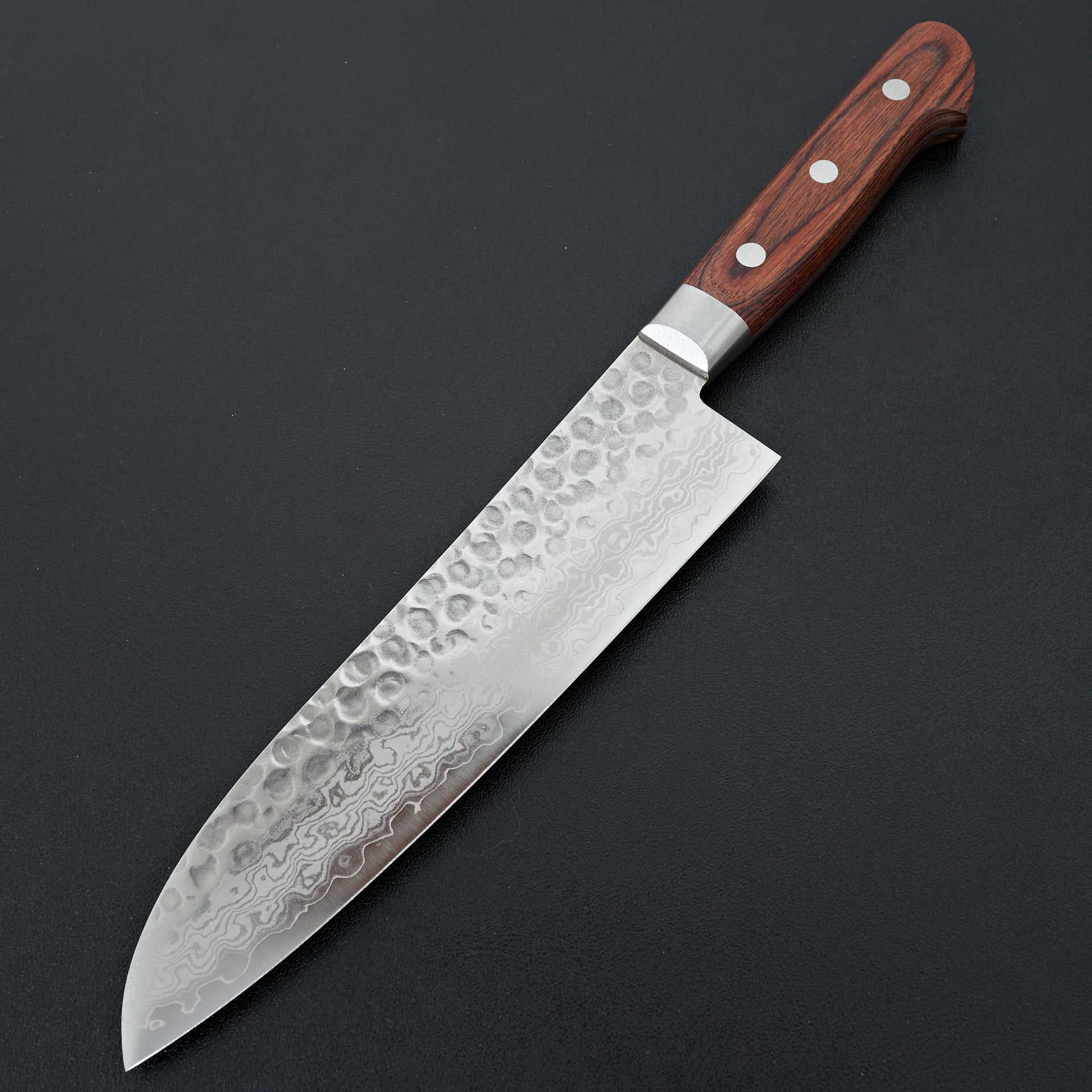 Tsunehisa VG-10 Damascus is forged from VG-10 stainless core steel with a damascus cladding. The blade face is finished with a tsuchime (hammered patterning that aids with food release. The bevels show the beautiful damascus pattern. Great all around series for professional or home cooking. Fitted with a western-style, pakka handle