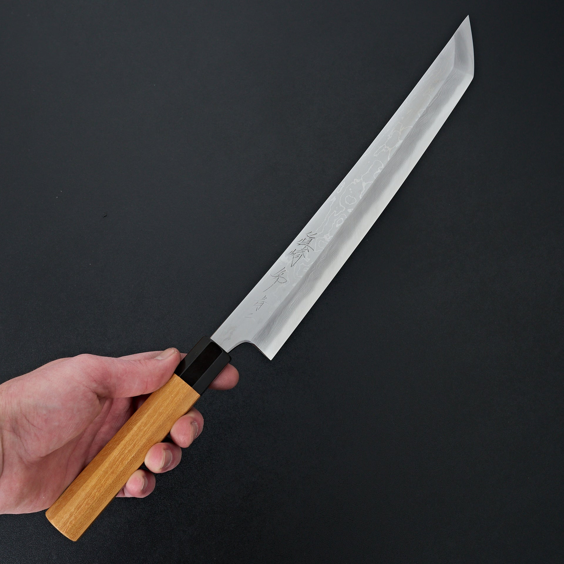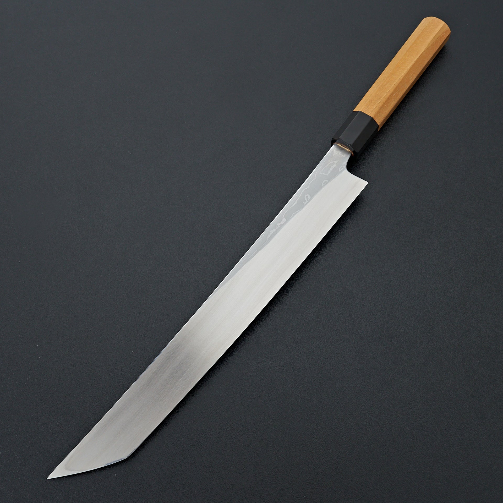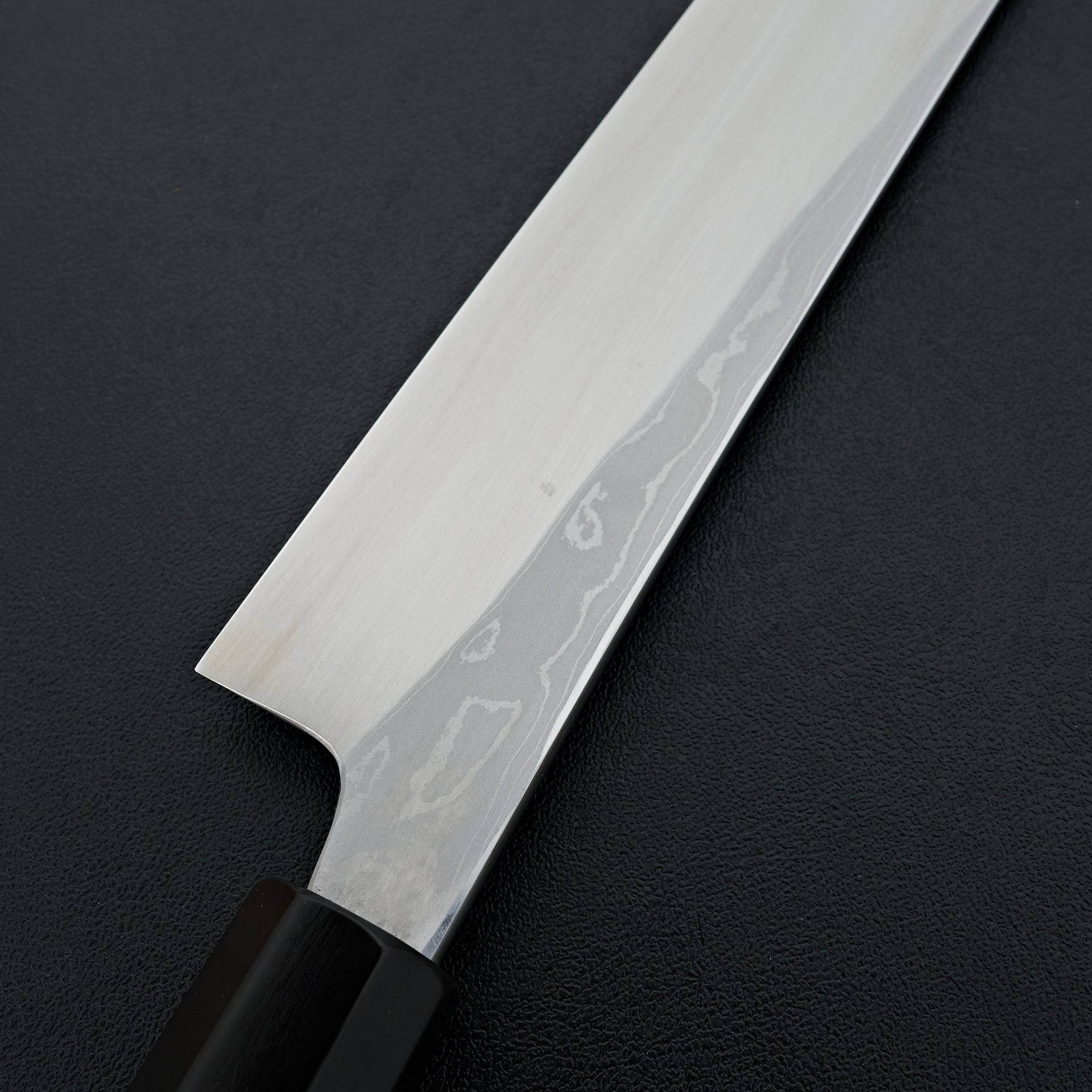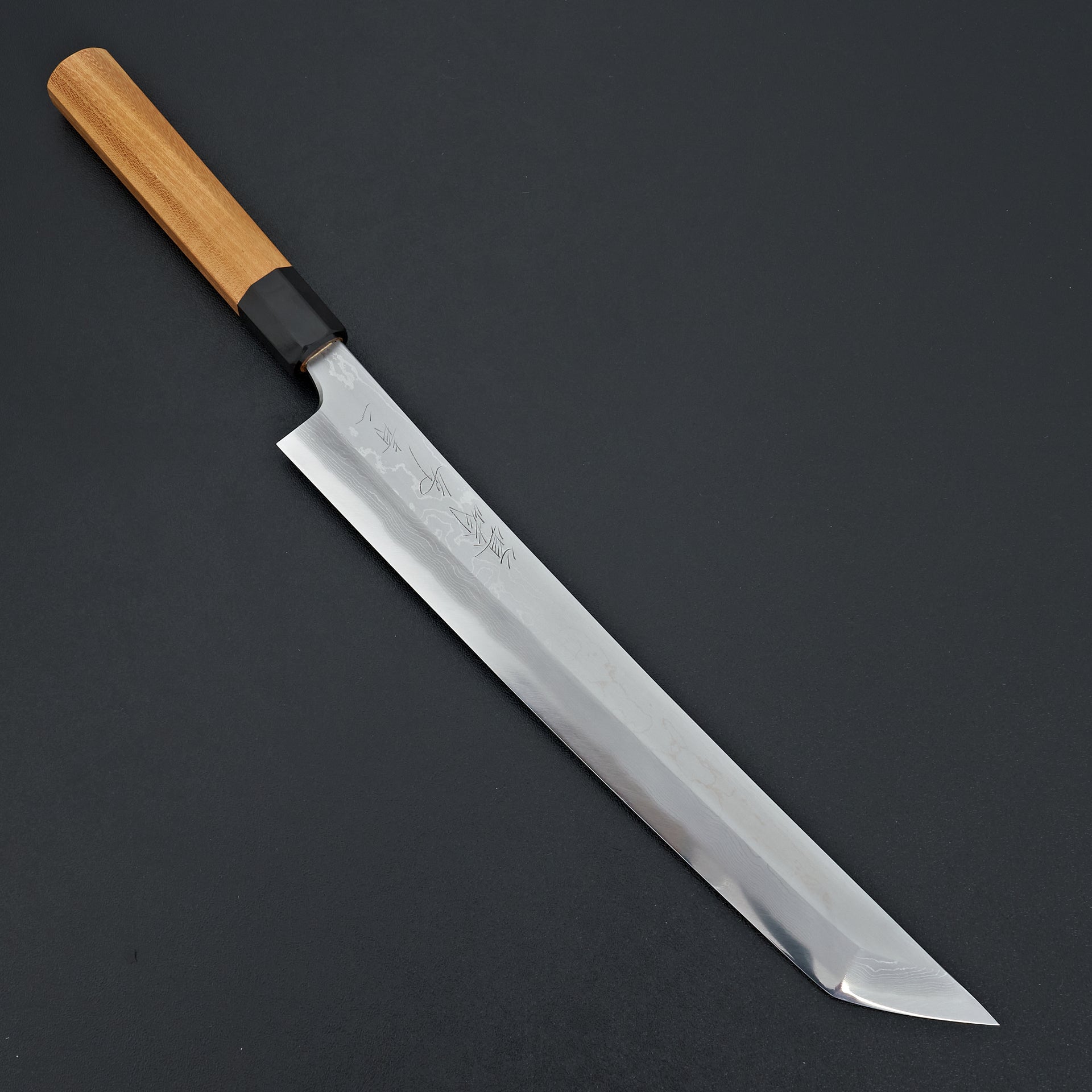 This blade is forged from Aogami #2 steel laminated in hand made suminagashi damascus. Most damascus knives in Japan are made using premade prelaminated materials, Mazaki painstakingly makes all of his sumiagashi by hand himself. Very unique profile with gentle curve in the spine and aggressive shaped sakimaru tip. Lightly convexed bevels and very thin behind the cutting edge. The octagonal handle is made from magnolia and walnut ferrule.