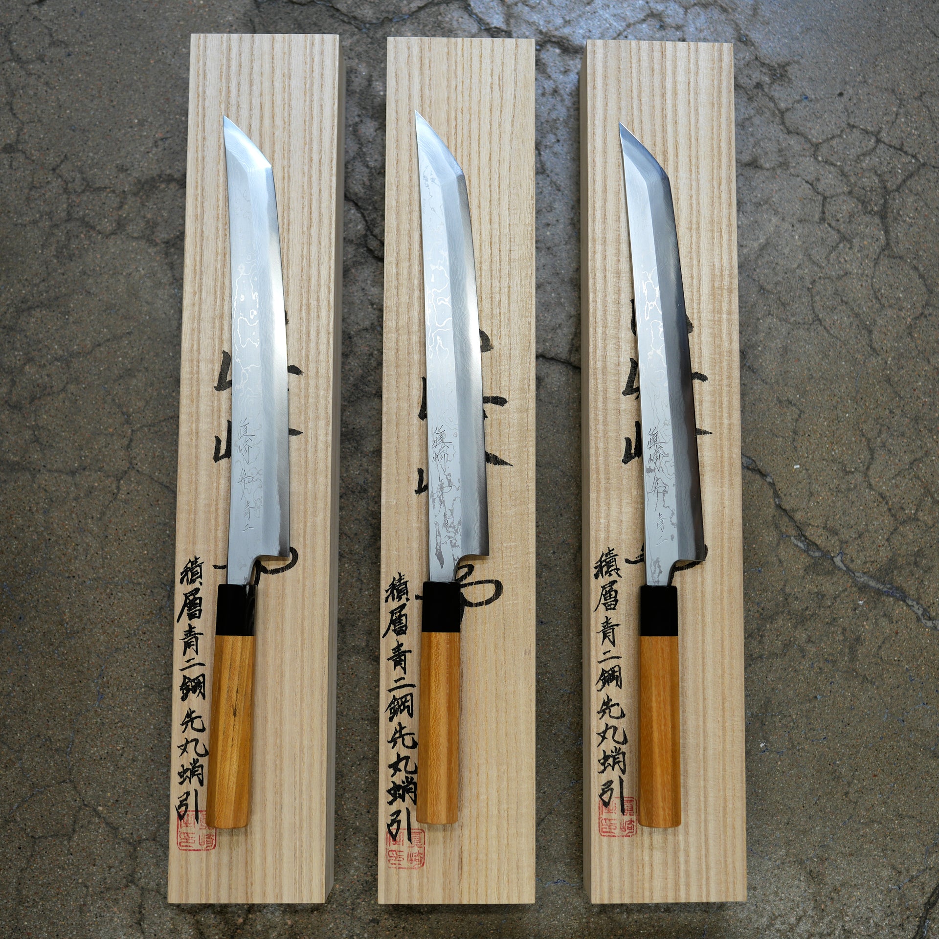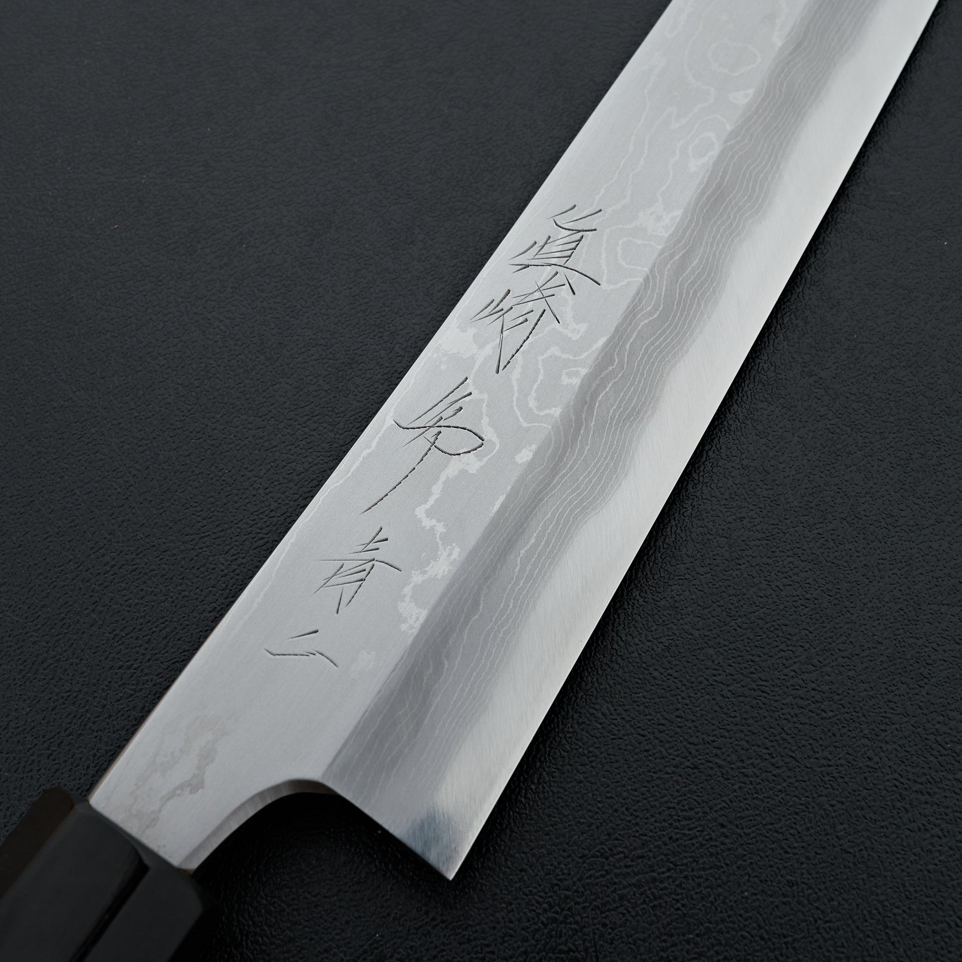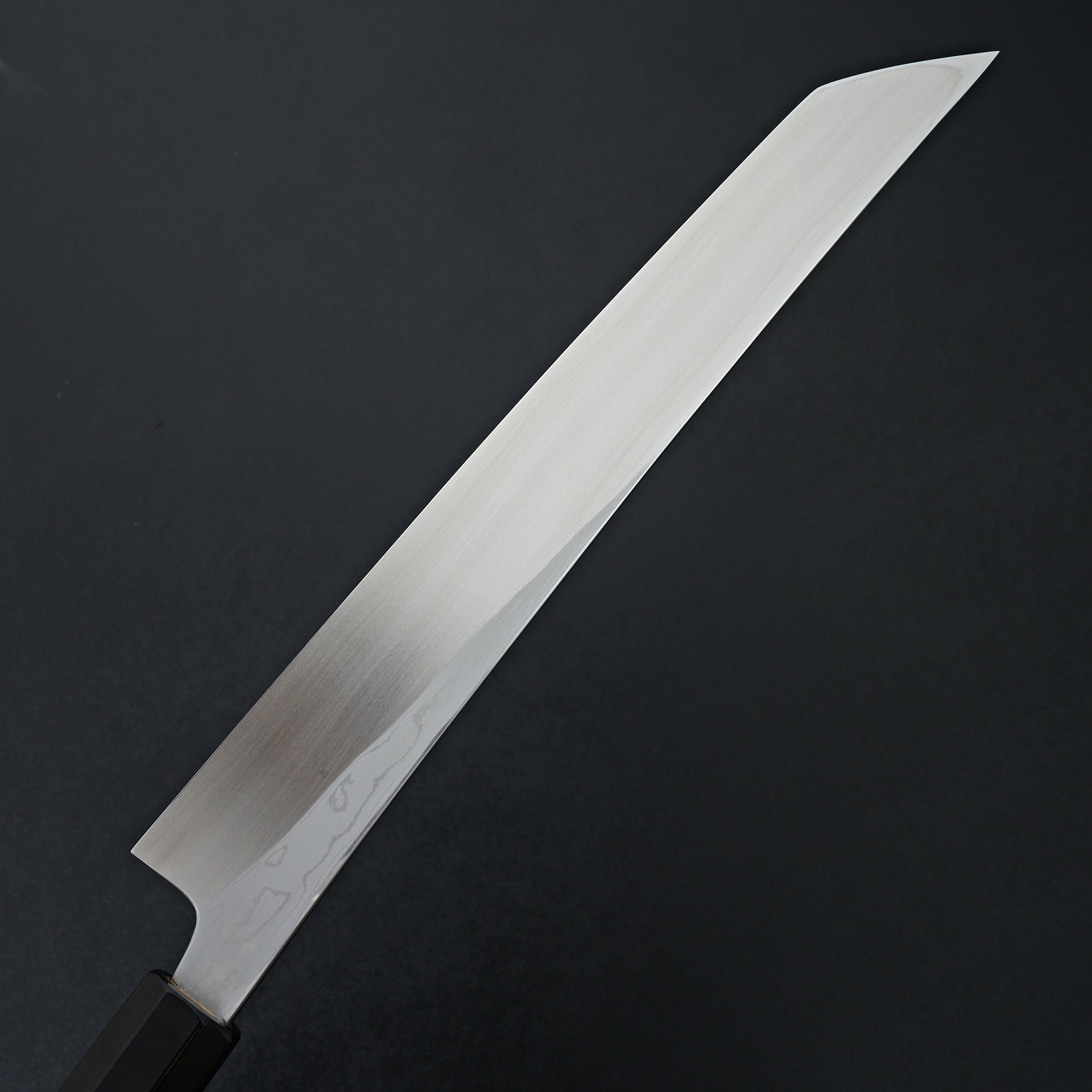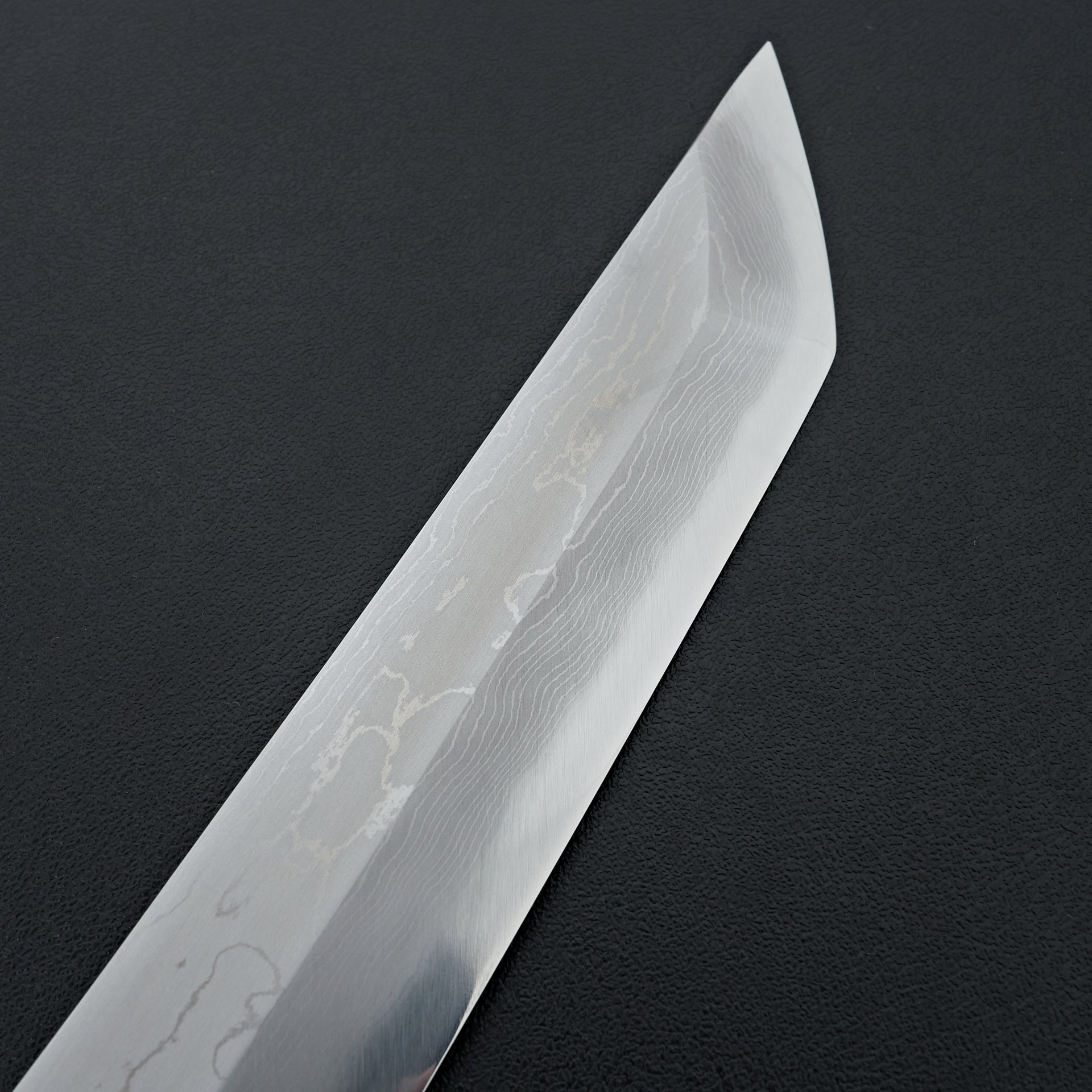 This blade is forged from Aogami #2 steel laminated in hand made suminagashi damascus. Most damascus knives in Japan are made using premade prelaminated materials, Mazaki painstakingly makes all of his sumiagashi by hand himself. Very unique profile with gentle curve in the spine and aggressive shaped sakimaru tip. Lightly convexed bevels and very thin behind the cutting edge. The octagonal handle is made from magnolia and walnut ferrule.