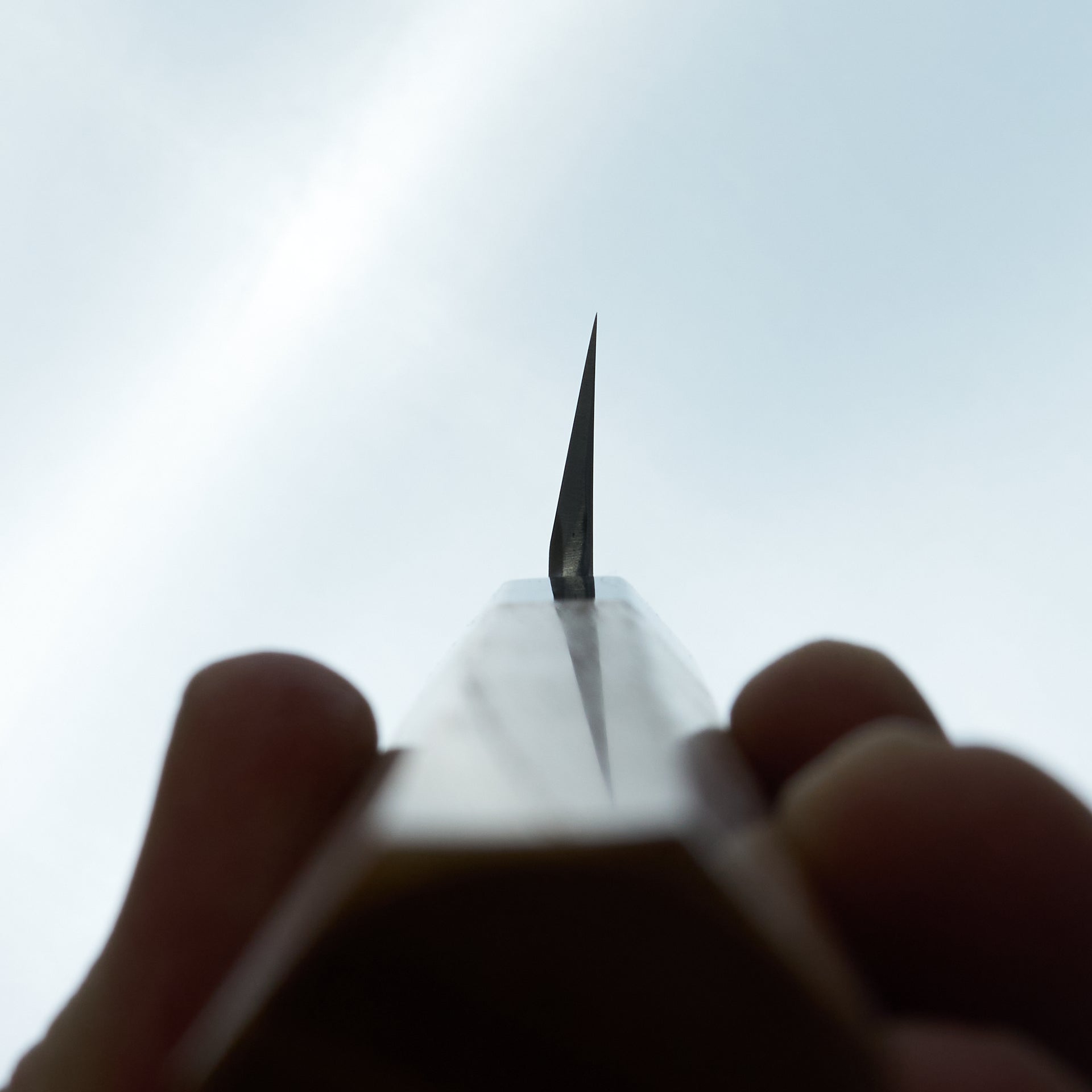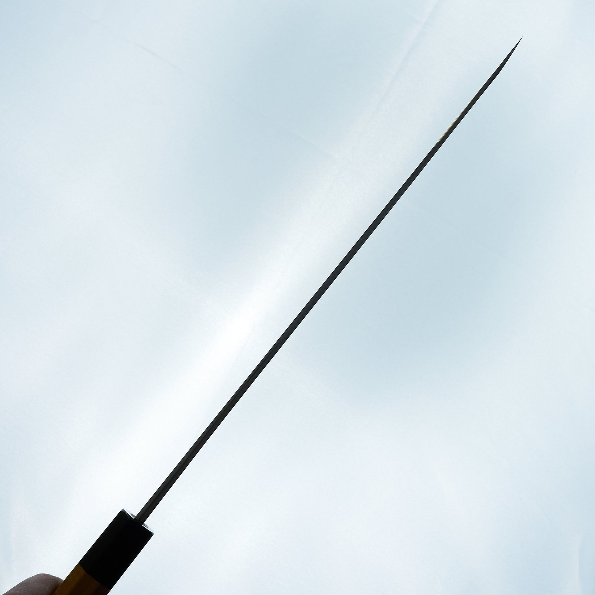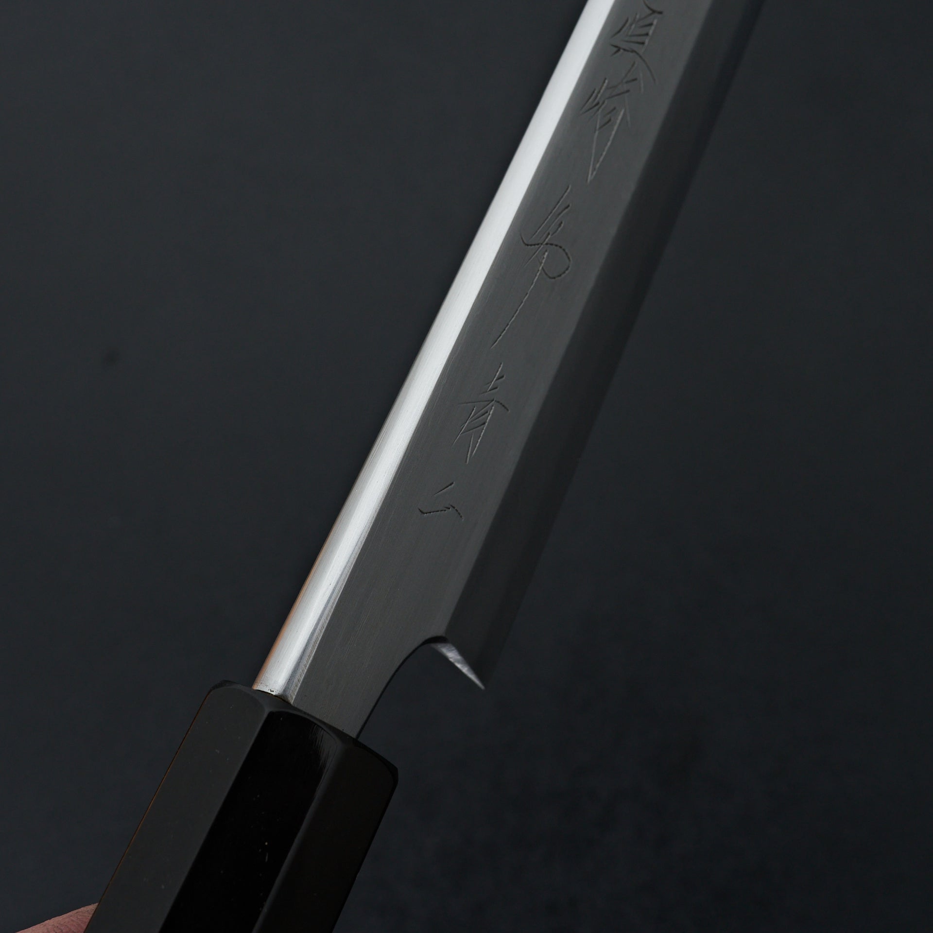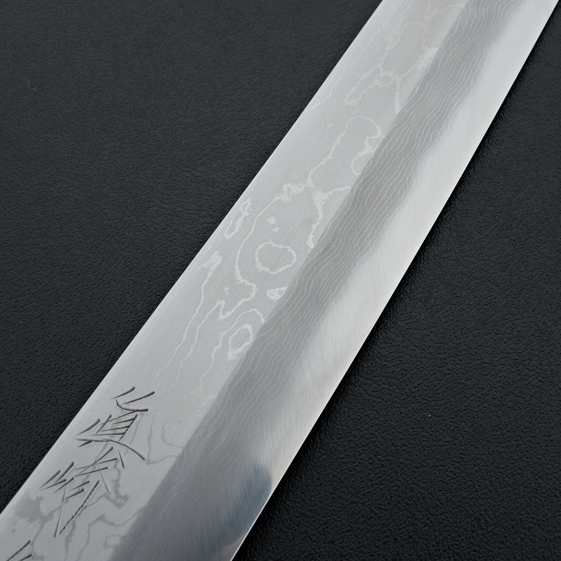 This blade is forged from Aogami #2 steel laminated in hand made suminagashi damascus. Most damascus knives in Japan are made using premade prelaminated materials, Mazaki painstakingly makes all of his sumiagashi by hand himself. Very unique profile with gentle curve in the spine and aggressive shaped sakimaru tip. Lightly convexed bevels and very thin behind the cutting edge. The octagonal handle is made from magnolia and walnut ferrule.