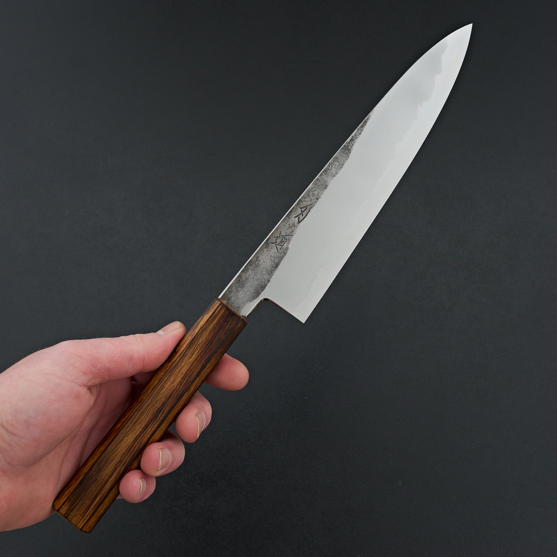 The HADO Kirisame series is forged by Yoshikazu Tanaka from Shirogami #1 steel laminated in stainless steel for easy maintenance. The handle is a oak wood Japanese lacquered urushi octagonal.