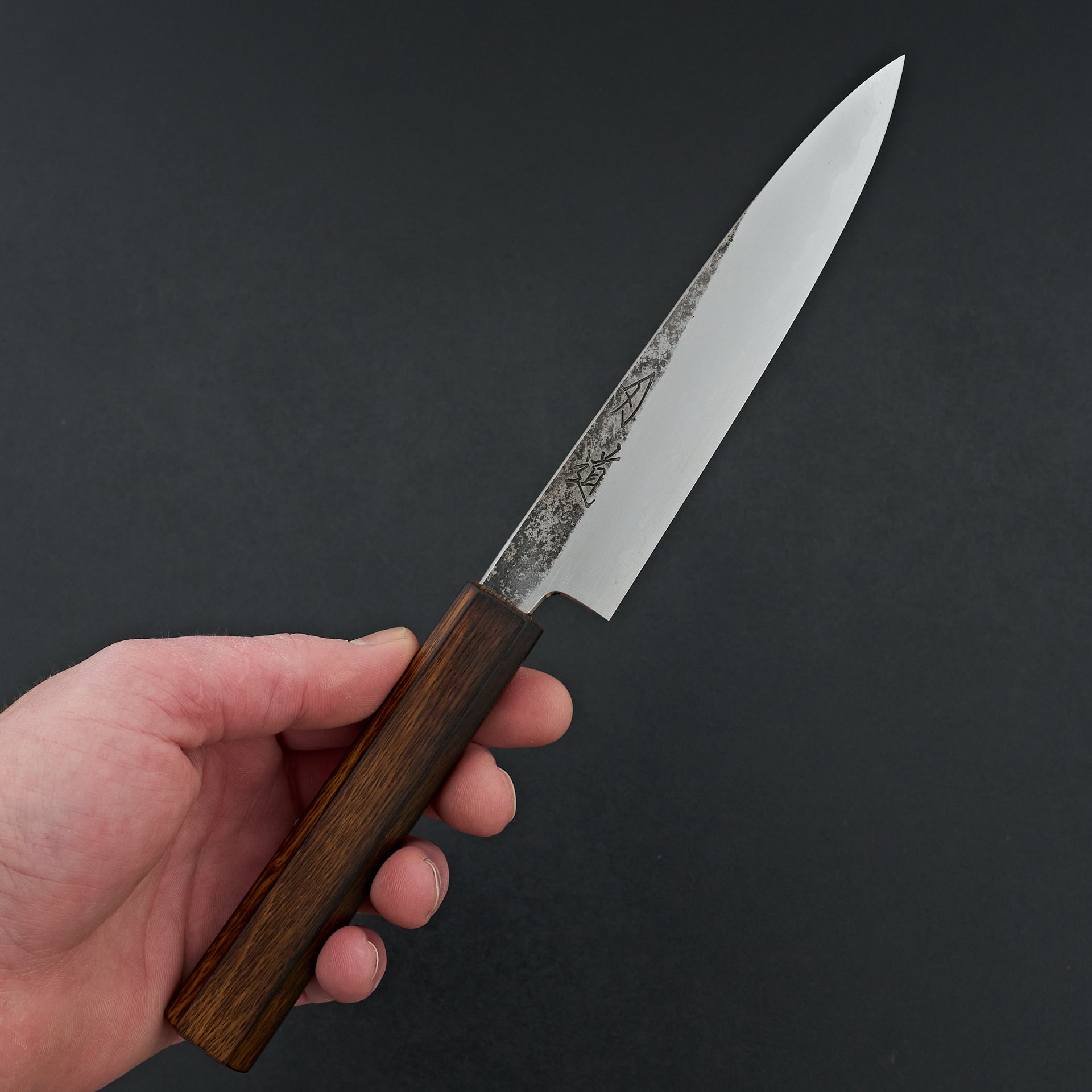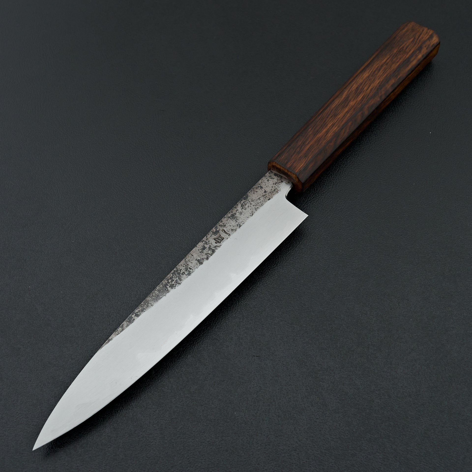 The HADO Kirisame series is forged by Yoshikazu Tanaka from Shirogami #1 steel laminated in stainless steel for easy maintenance. The handle is a oak wood Japanese lacquered urushi octagonal.
