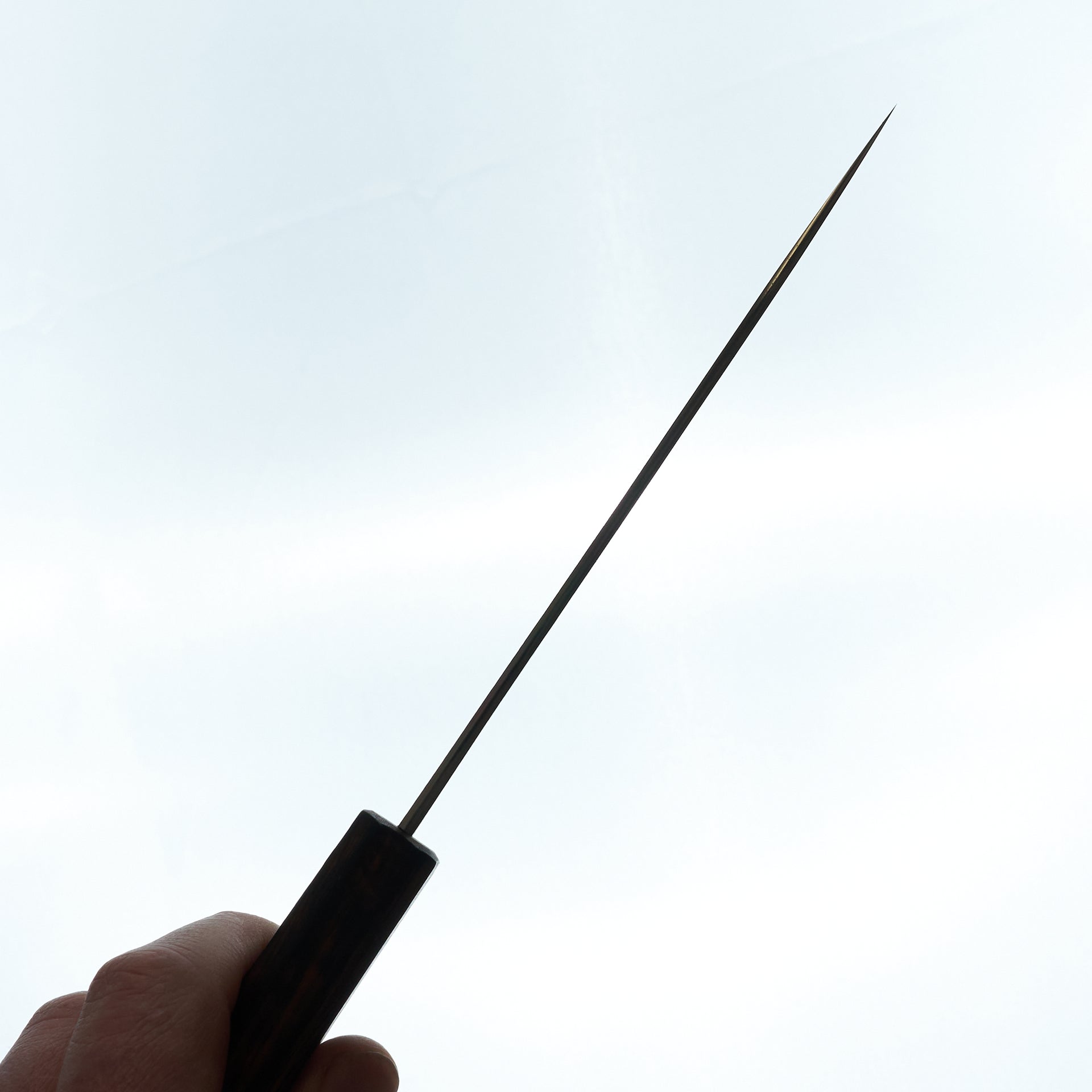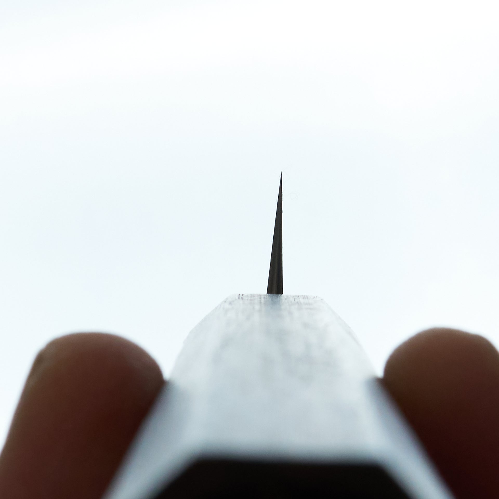 HADO knives are produced in Sakai in collaboration with master blacksmiths Yoshikazu Tanaka and Shogo Yamatsuka. HADO knives are sharpened by in house sharpener Maruyama-san who utilizes a wide style grind that has great symmetry and consistency. The fit and finish on all of HADO knives is superb with no detail spared.