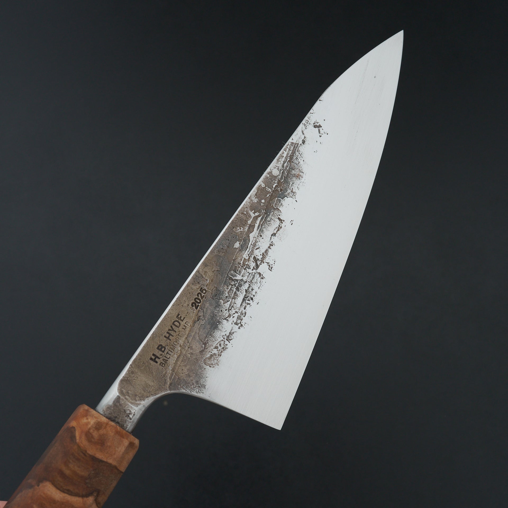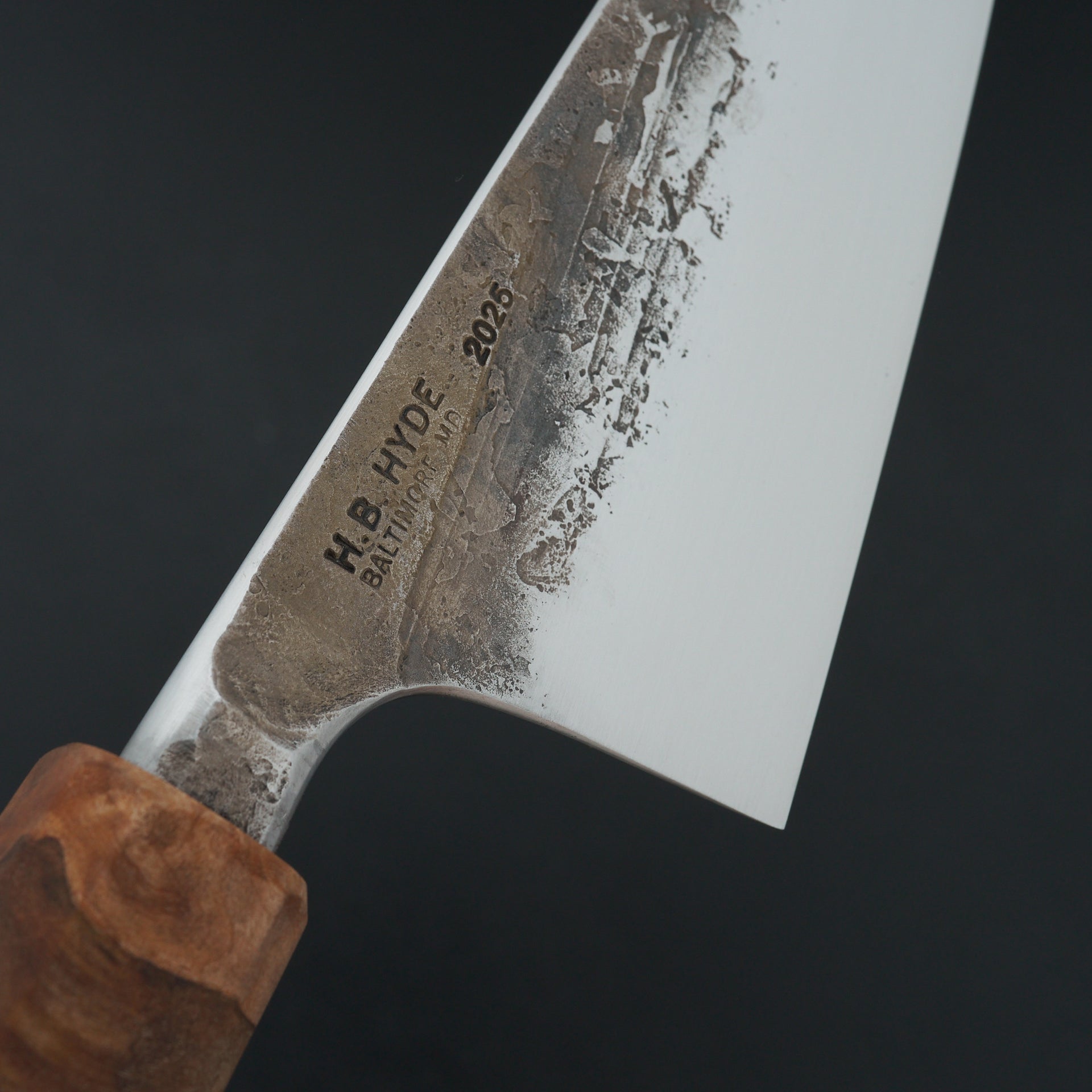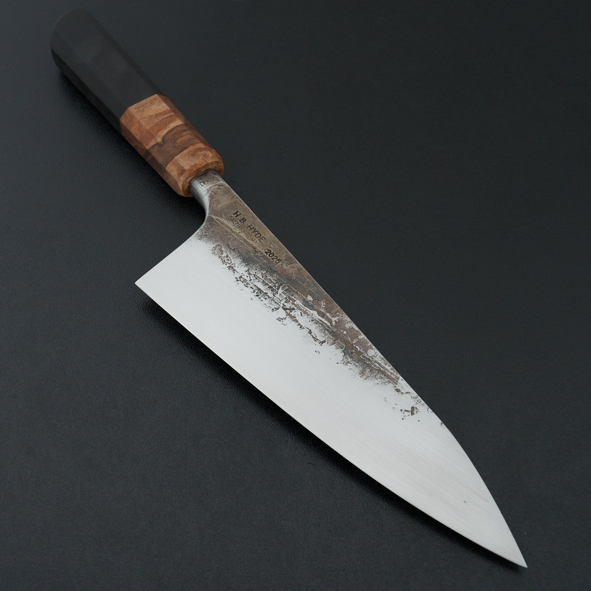 Hyde Handmade Knives are based out of Baltimore, MD by bladesmith Henry Hyde. This blade was hand forged from high carbon 125cr1 high carbon steel and left with some natural texture from forging. The octagonal handle is made from ebony wood with maple burl ferrule. The fit and finish is excellent with rounded spine and choil. This blade has a very tall heel height and a very nice feel in hand.