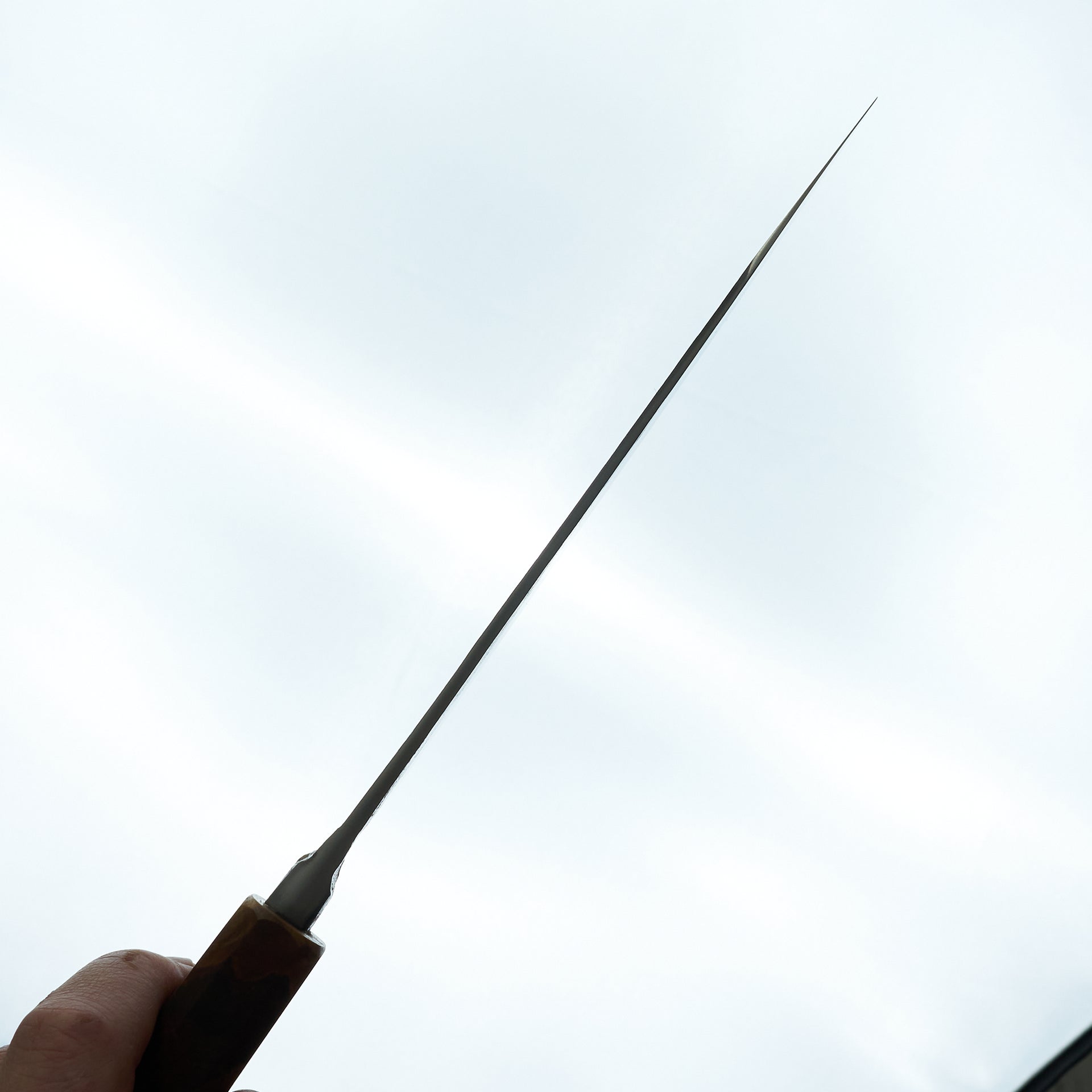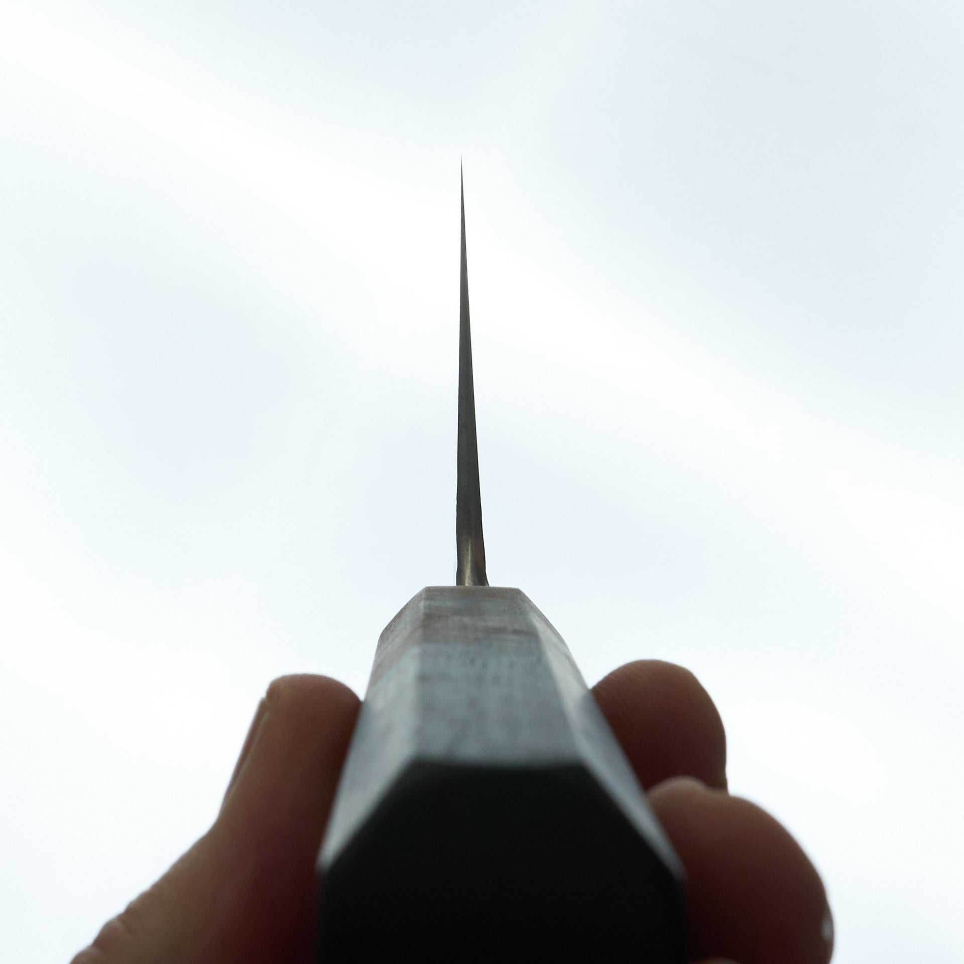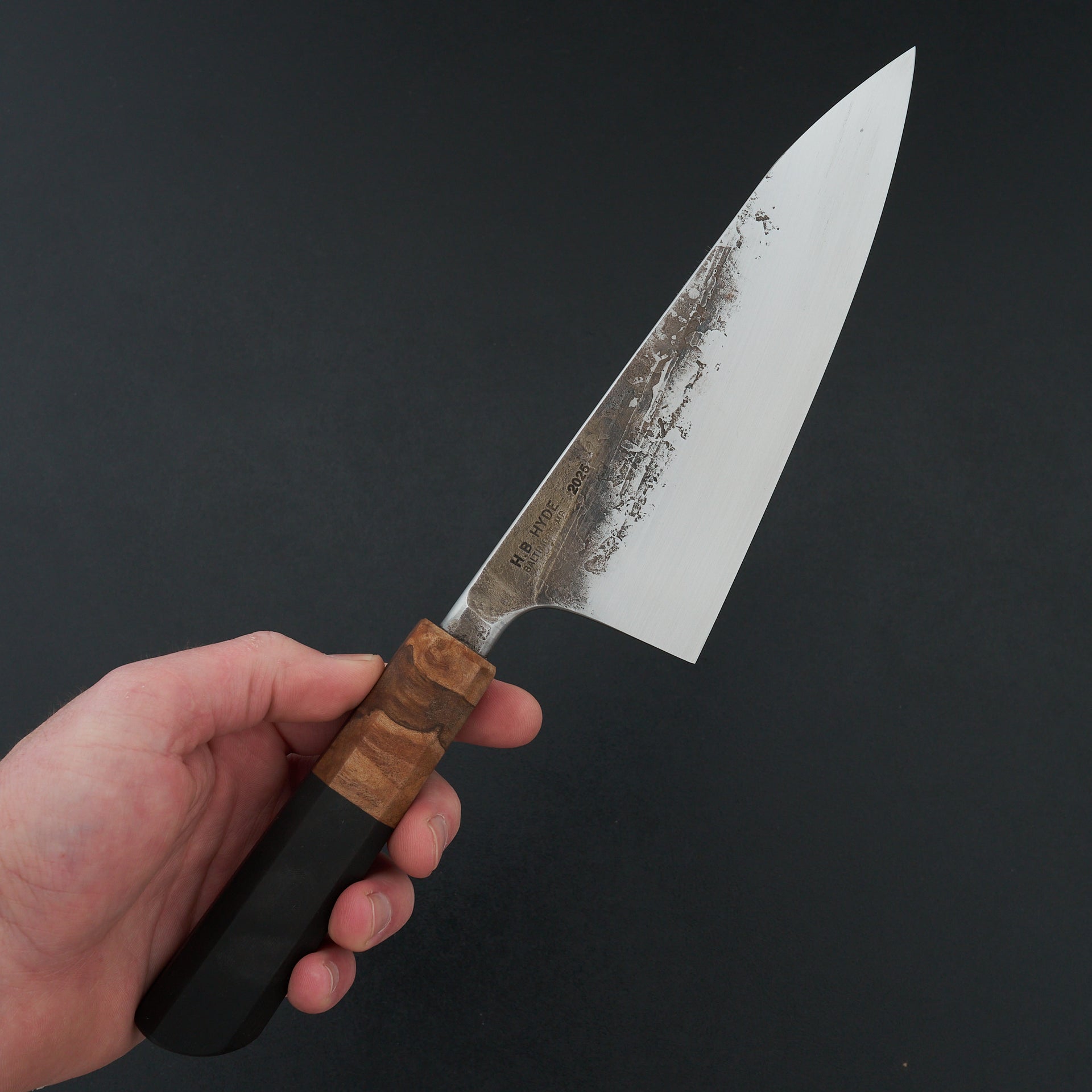 Hyde Handmade Knives are based out of Baltimore, MD by bladesmith Henry Hyde. This blade was hand forged from high carbon 125cr1 high carbon steel and left with some natural texture from forging. The octagonal handle is made from ebony wood with maple burl ferrule. The fit and finish is excellent with rounded spine and choil. This blade has a very tall heel height and a very nice feel in hand.