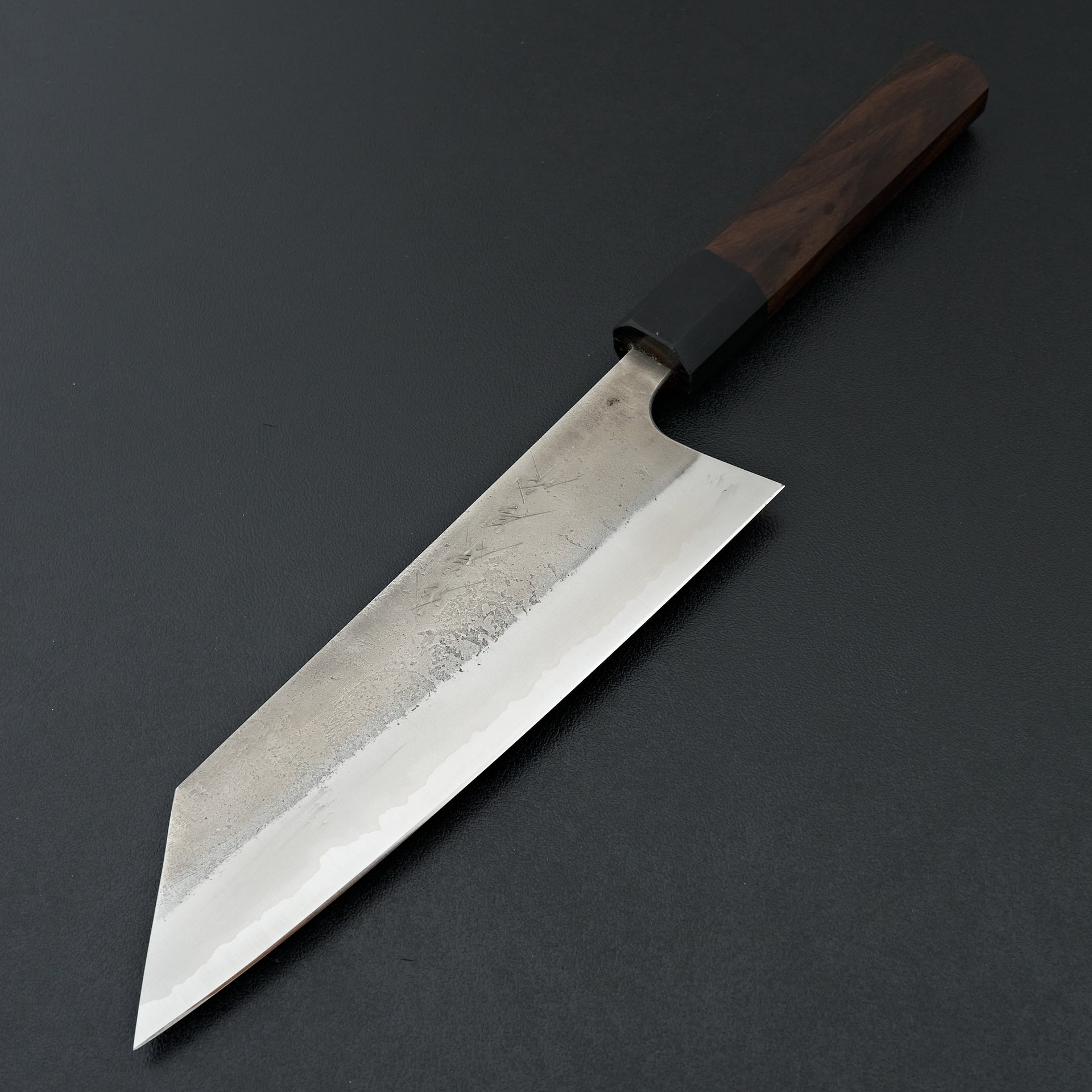 This series is made from Aogami #2 (Blue #2) stainless steel laminated in soft stainless. Theblade is hand forged and left with a natural nashiji texture. These have a bit of a forged hollow above the shinogi that provides outstanding food release. Fitted with rosewood handles.