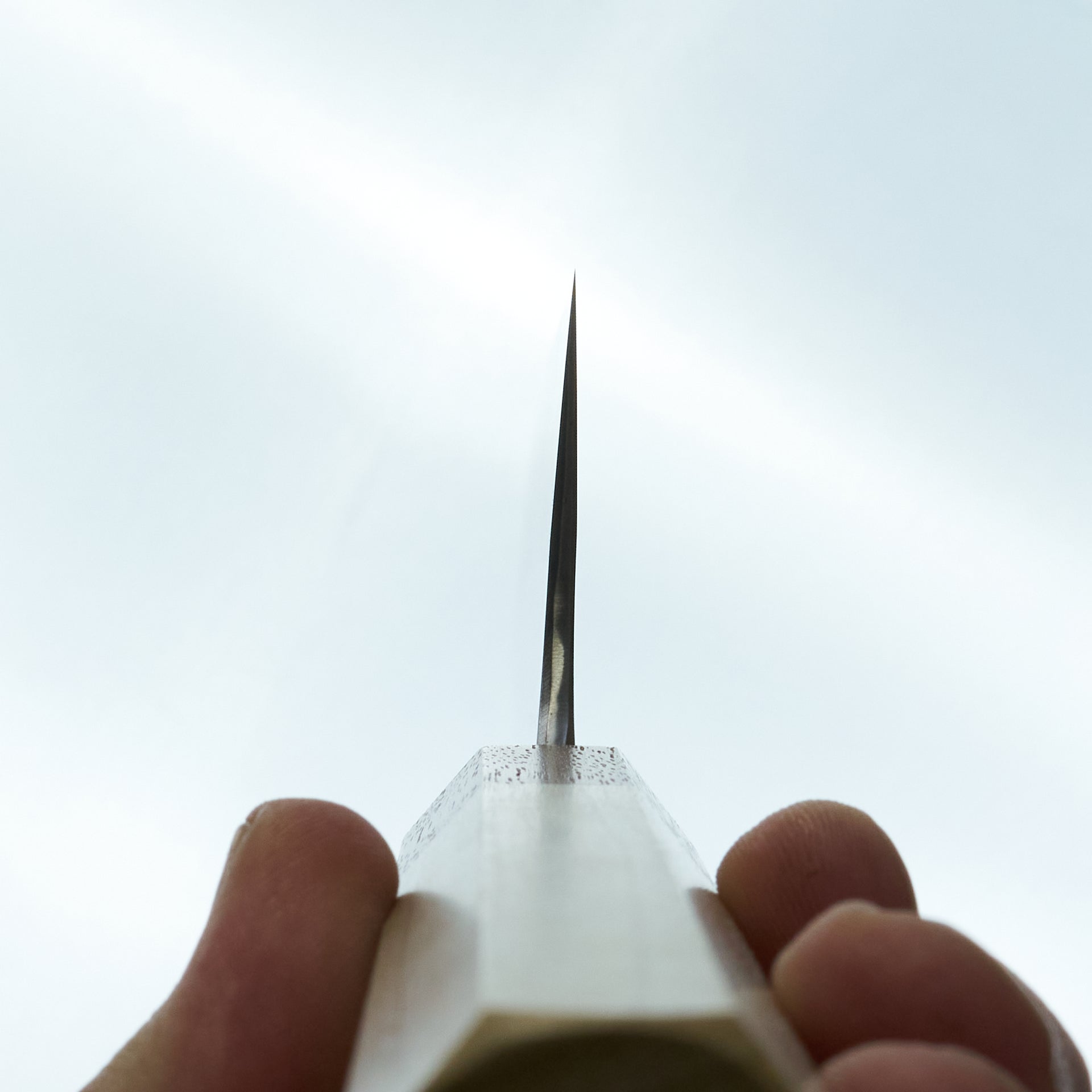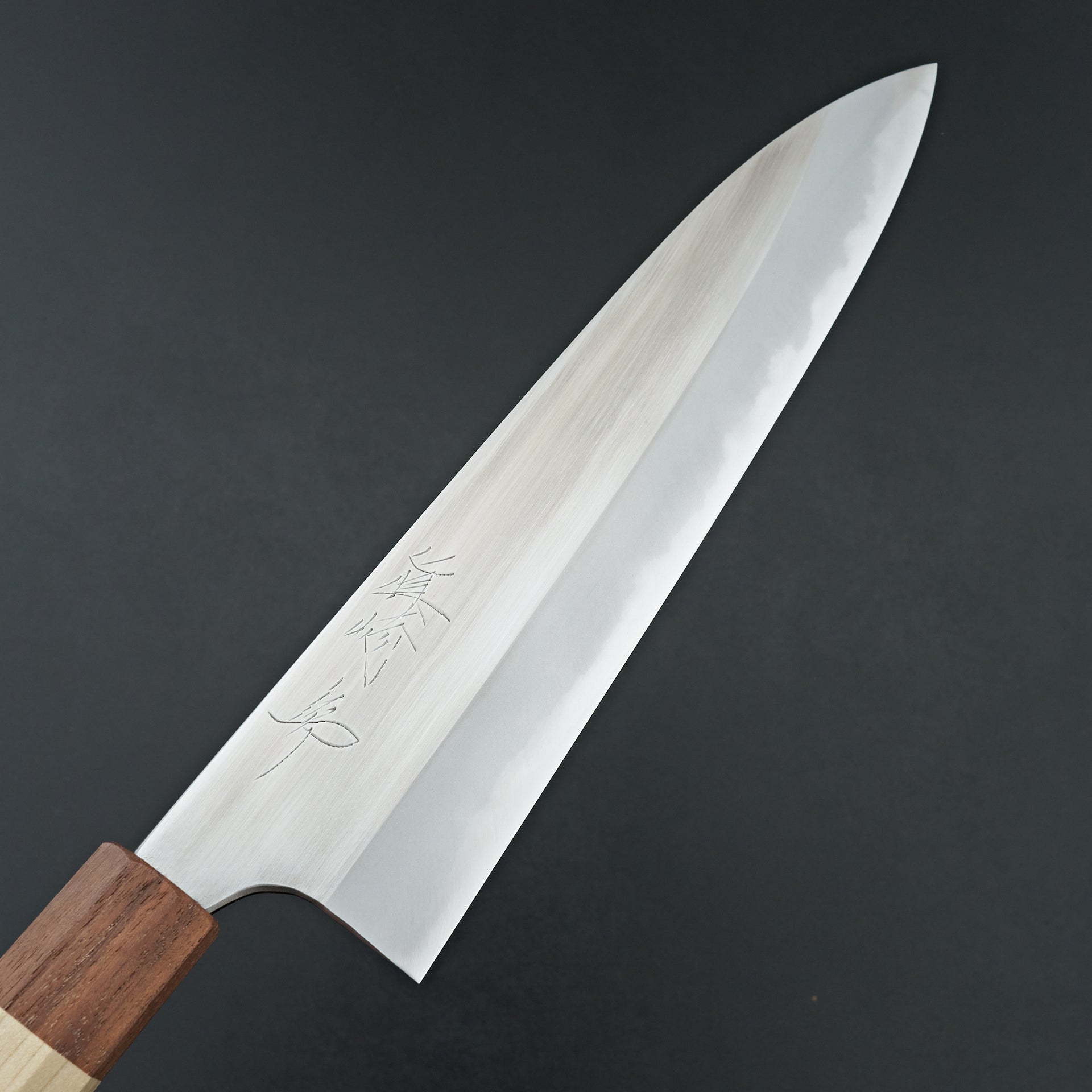 He focuses primarily on forging Shirogami (White) #2 carbon steel cladded in iron. The blade is migaki polished for ease of maintenance and cleaning in future. The bevels are finished by hand on Japanese whetstones to ensure an even grind and geometry. The forged distal taper is quite impressive and has a nice progressive thinness towards the tip. Lightly convexed bevels and very thin behind the cutting edge. The octagonal handle is made from keyaki and horn ferrule.