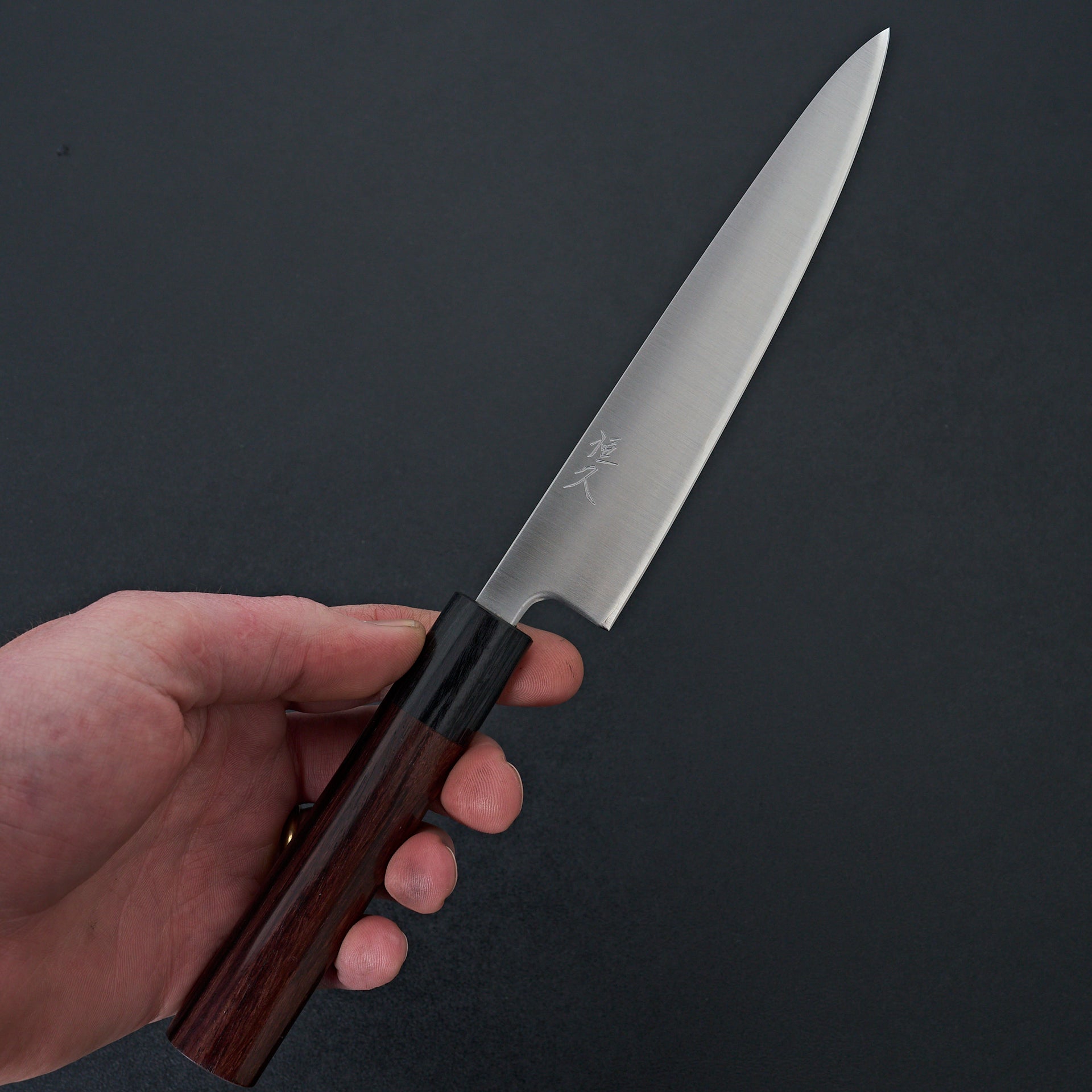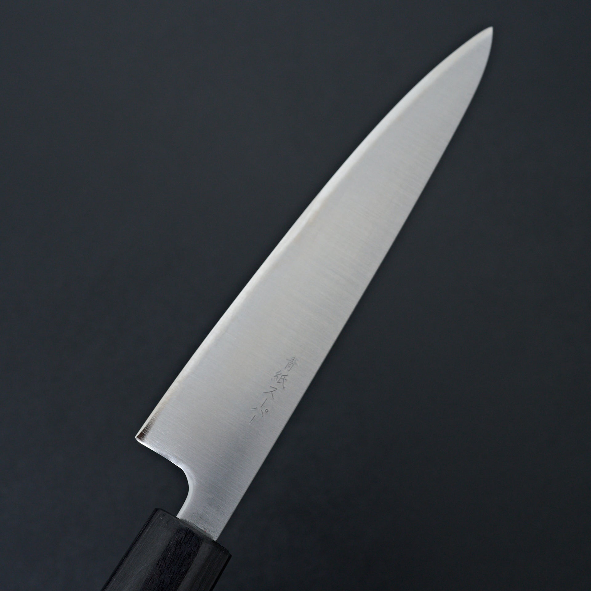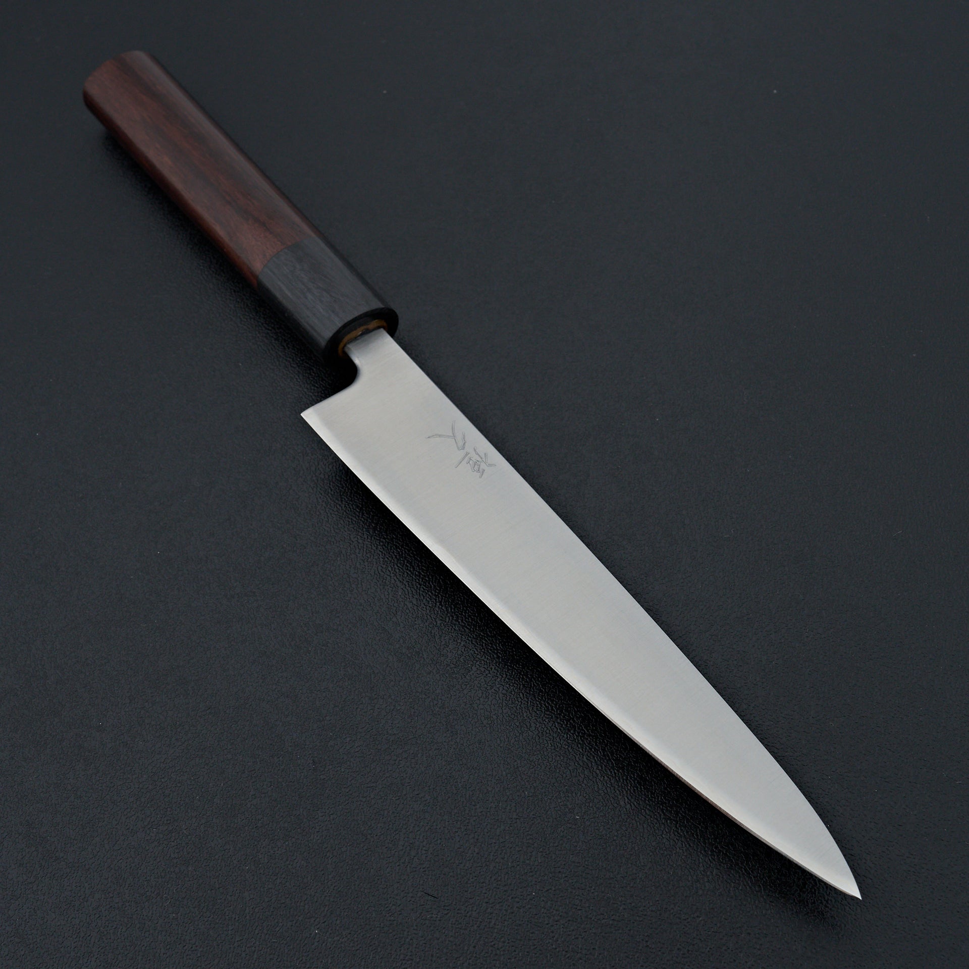 Tsunehisa AS line is forged from Aogami super steel and cladded in stainless. Hardness rating is ~63HRC. These knives have great edge retention and sharpenability. The blade is satin finished very beautifully. These have nice thin grinds but still feel very confident and durable. They are fitted with oval rosewood handles.