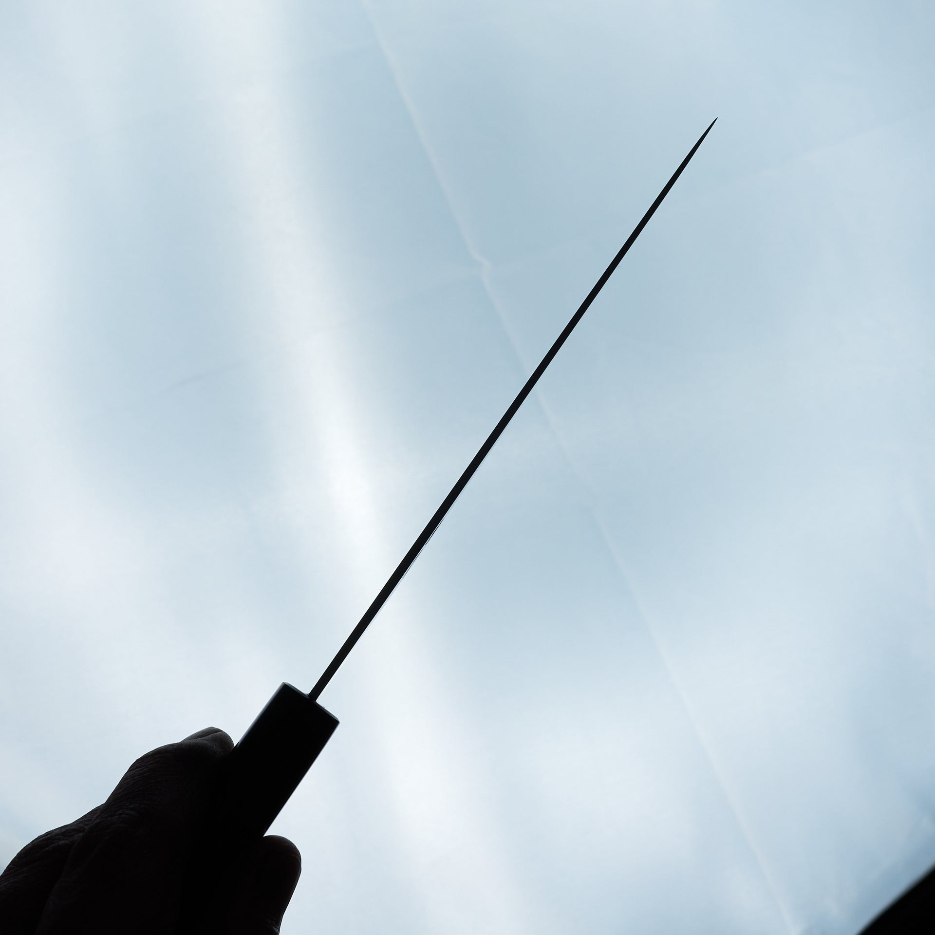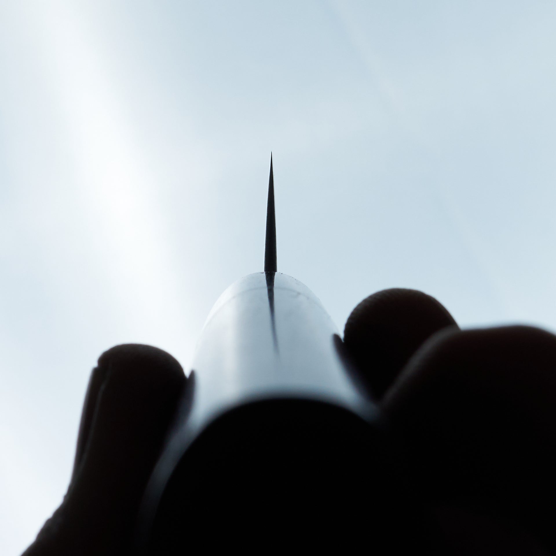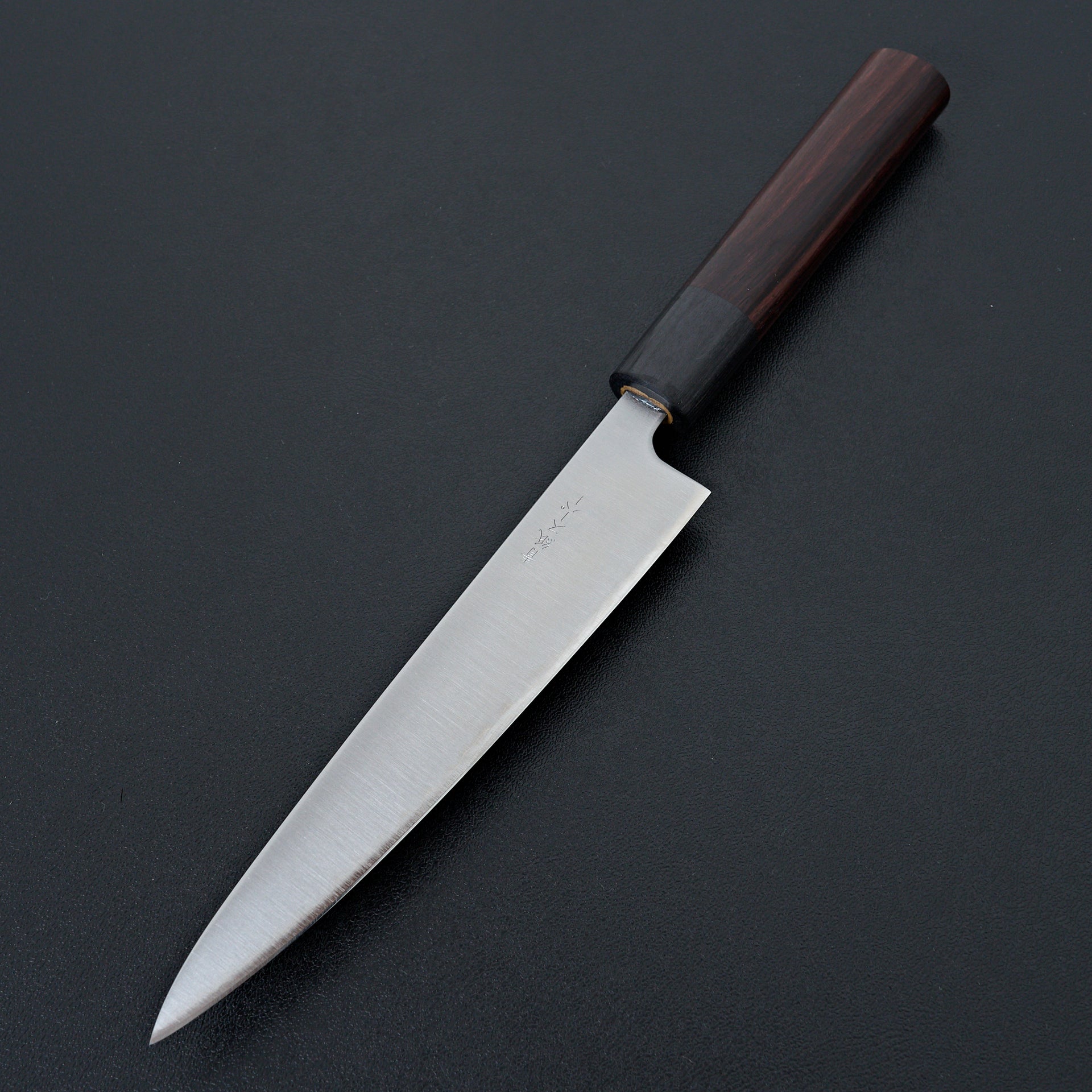 Tsunehisa AS line is forged from Aogami super steel and cladded in stainless. Hardness rating is ~63HRC. These knives have great edge retention and sharpenability. The blade is satin finished very beautifully. These have nice thin grinds but still feel very confident and durable. They are fitted with oval rosewood handles.